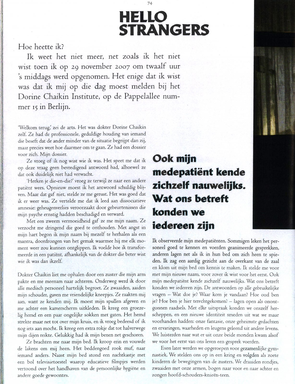 Tien jaar geleden alweer! Wat me vooral opvalt als ik de tekst teruglees is dat ik destijds nog zo makkelijk op reis ging. Nu heb ik een jong kind. De trip naar Berlijn maakte ik speciaal voor deelname aan dit project. Signa Köster had ik in Nederland zien spreken bij een seminar en ik was erdoor weggeblazen. Daarna besloot ik mee te doen aan het Dorine Chaikin Institute. Ik ging overigens niet naar Berlijn met het plan om een tekst te schrijven over de performance. Ik heb daar ook geen aantekeningen gemaakt of iets dergelijks – dat kan helemaal niet in zo’n setting. Pas later ontstond het idee voor Hello Strangers naar aanleiding van een gesprek met Hanne Hagenaars, de toenmalige hoofdredacteur van Mister Motley
