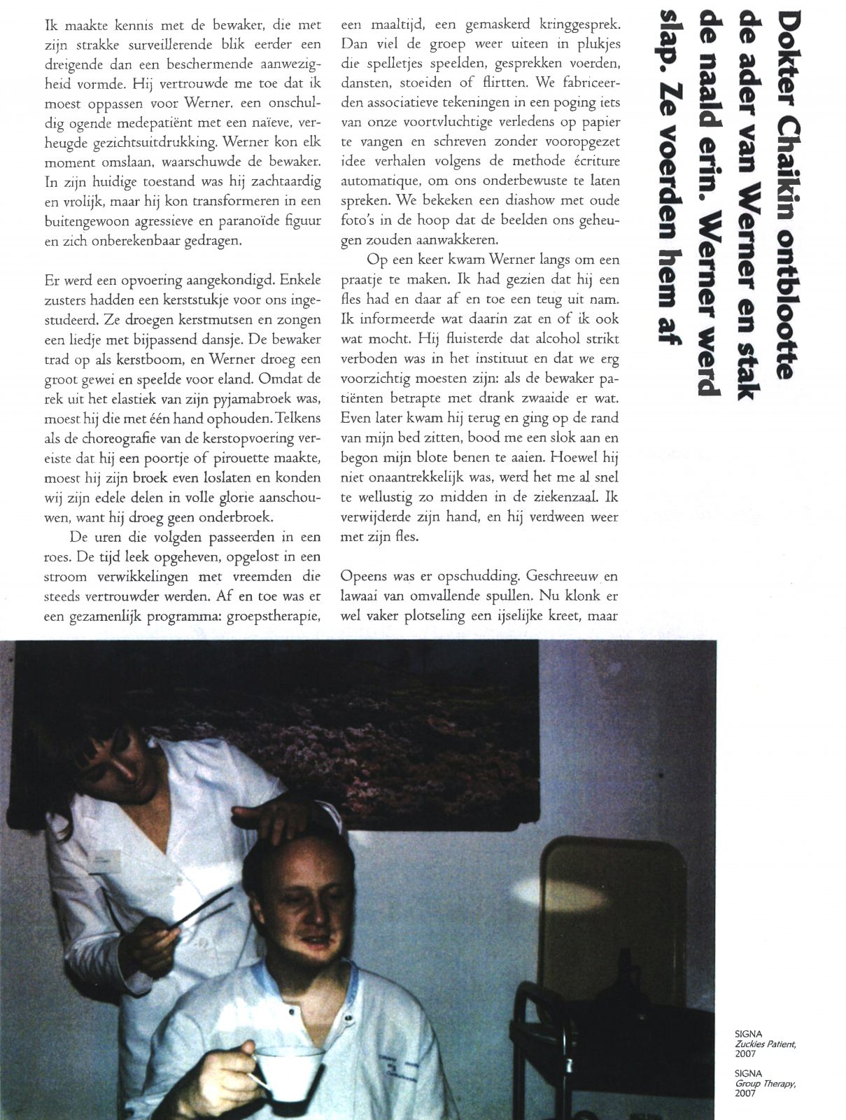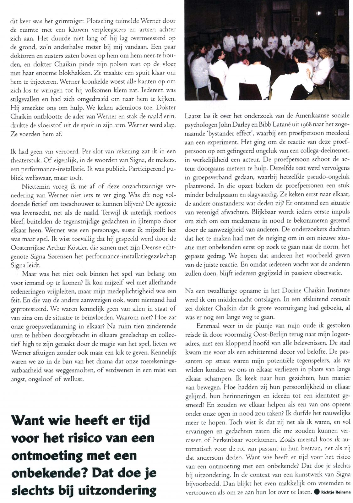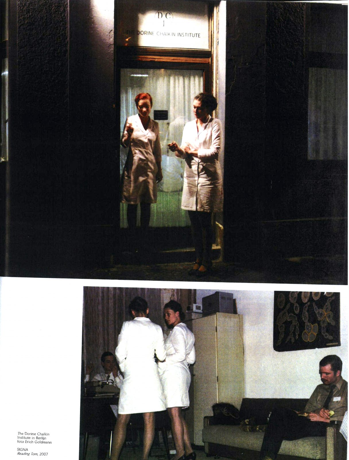 Ik herinner het me nog heel goed. Deelname aan deze performance was een magische ervaring die ik nooit zal vergeten. Signa en Arthur Köstler, het stel dat samen collectief Signa vormt, maken hun performatieve installaties met een afgrondelijk soort overgave. Het is hun leven, ongelooflijk intens. Het was geweldig om daar iets van te proeven in Berlijn, al zou ik het zelf waarschijnlijk niet volhouden. Deelname aan het Dorine Chaikin Institute duurde acht uur. Naderhand nam ik me gelijk voor om ook aan een volgend project van Signa deel te nemen. Dat is er helaas nooit van gekomen. Door de aard van Signa’s werk kunnen er steeds maar een zeer beperkt aantal personen meedoen. Daardoor krijgt hun praktijk ook een mysterieuze lading; ze zijn eigenlijk een goed bewaard geheim. Er is ook geen representatieve documentatie van projecten uit het verleden beschikbaar. Je moet er gewoon bij zijn. Ze bestaan nog steeds! Signa vierde vorig jaar haar twintigjarige jubileum en maakt nog steeds performatieve installaties.