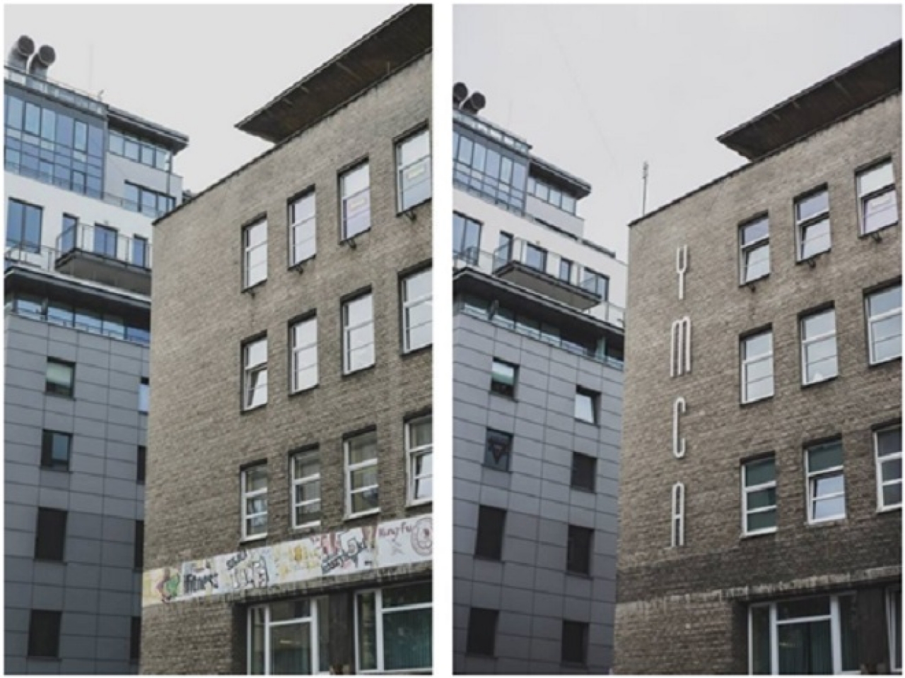 Oude gebouwen (links) die met “lelijke” advertenties uit de jaren negentig krijgen een nieuwe frisse uitstraling. (© Traffic Design)