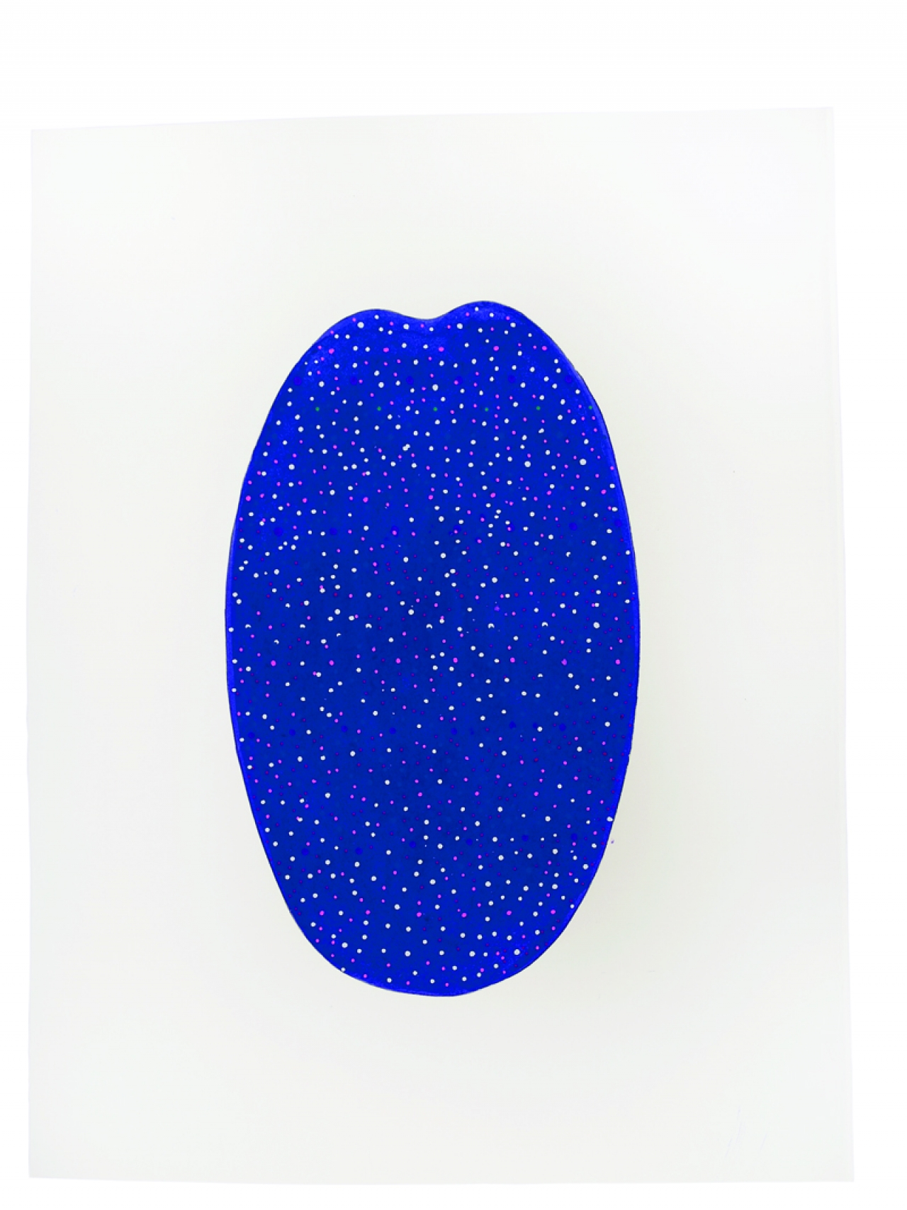 ‘Sereen en subliem’ zie ik in een zacht blauwe Shiva Lingam met gekleurde confetti. Op internet lees ik dat het de cosmos met sterren verbeeldt.