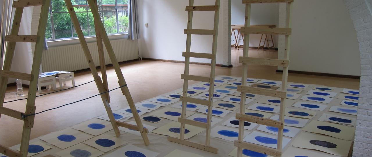 Ik tel 52 meditatie tekeningen die af zijn en nog een hoop halve. Ze liggen op een kleed op de grond en Anthony’s ladders staan er tussen. Ze vormen samen weer een eigen exotische kosmos, met ladders, om zelfs deze kosmos nog te ontstijgen.