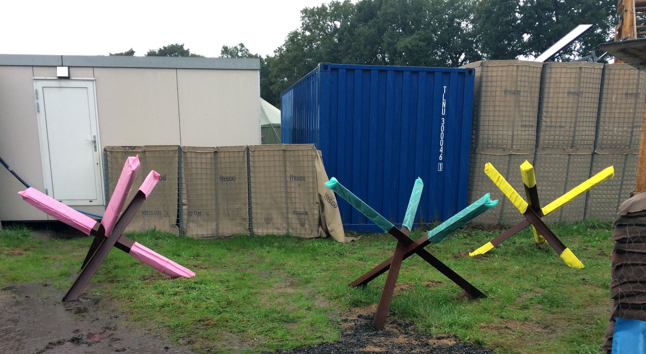 Ik wilde dat alledaagse zorgzame en kwetsbare in dit ongewone krijgskamp een plek geven, want het wordt doorgaans maar al te makkelijk uit het oog verloren. Ik omhulde delen van een drietal anti-tankkruizen bij de entree van het kamp met schoonmaakdoekjes. Die anti-tankkruizen zijn bedoeld om tanks in hun voortgang te belemmeren, en hebben als mooie bijnaam ‘egels’. Ik naaide van roze, gele en groene schoonmaakdoekjes hoesjes voor een aantal stekels, als een tweede, zachte en kleurige huid. Bijzonder regenbestendig en makkelijk verwijderbaar. Functioneel materiaal als decoratie ingezet, net als de anti-tankkruizen zelf.