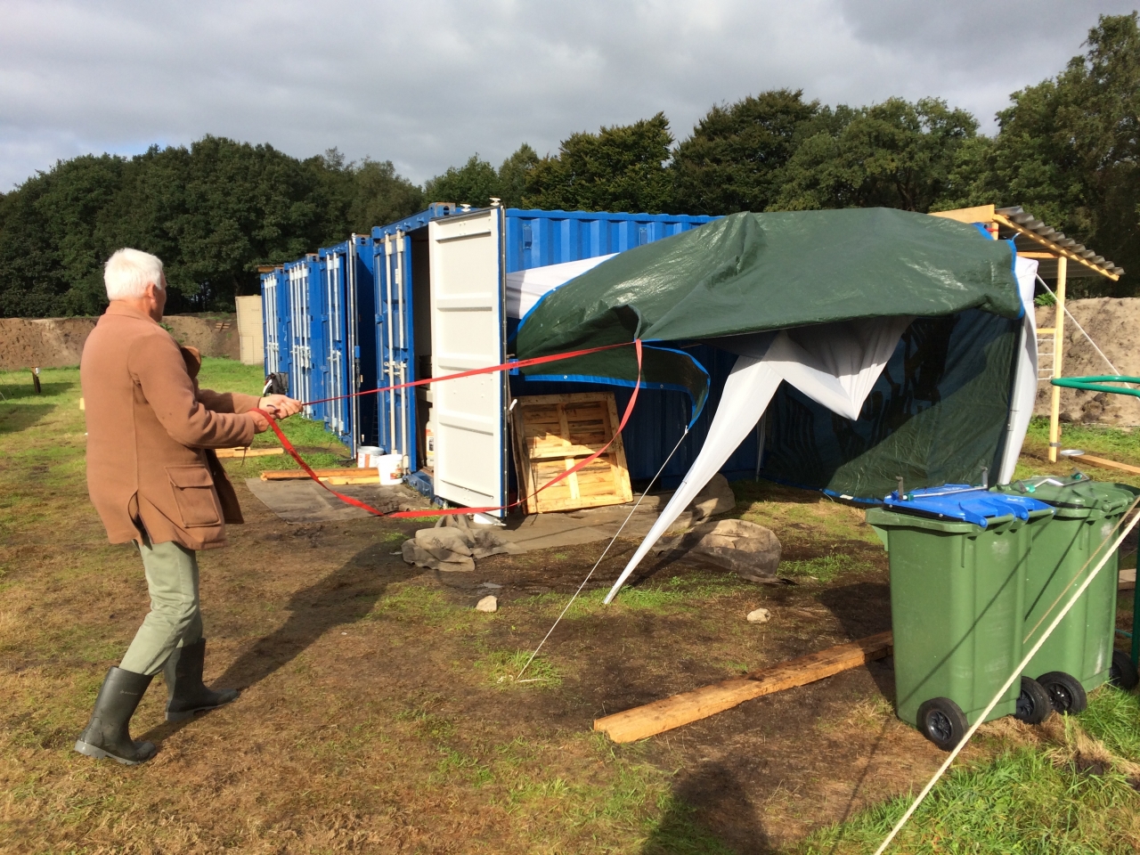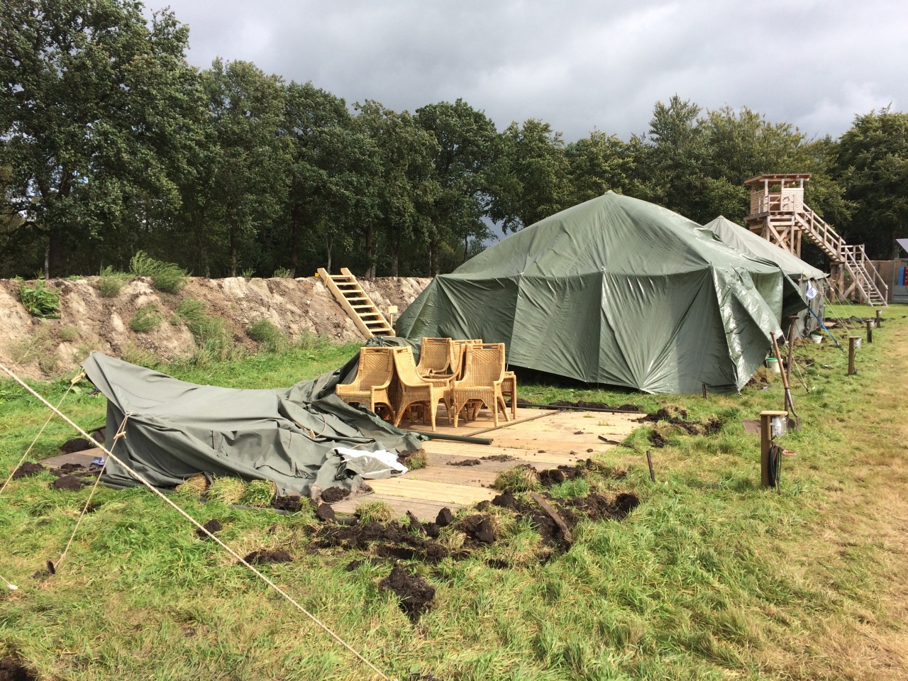 Toen we aankwamen in de proefkolonie, was het allereerst zaak om het kamp leef- en werkbaar te maken. De omstandigheden bleken behoorlijk primitief. Er was geen keuken, geen plek om te eten, geen werkplaats, geen verwarmde ruimte. De tenten waren koud en tochtig, sommige lek. Met vereende krachten bouwden we de voorzieningen die aan het kamp ontbraken. Van een afdak om in de regen onder af te wassen tot een werkbank, van kamerschermen uit gerecyceld militair materiaal tot slootjes rond onze tenten voor regenafvoer.