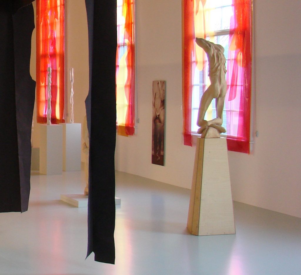 ‘Tijdens mijn eerste jaar in Rotterdam nam onze docent Marie Antoinette Reuten ons mee naar de voorstelling ‘Ottone Ottone’ van Rosas, de dansgroep van Anna Teresa de Keersmaeker. Dat was een openbaring voor mij. Met een paar jaargenoten ben ik toen cursussen dansexpressie gaan volgen, waardoor ik een heel andere uitdrukkingstaal leerde kennen. Dans is in wezen de beweging van het lichaam in de ruimte. Je leert hoe je als personage totaal kunt veranderen door beweging, hoe je met je lichaam een ruimte omvat en hoe je een ruimte kunt bespelen. Ik ontdekte hoe je tegenstellingen in beweging kunt verenigen: innerlijk en uiterlijk, je beweegt van binnen naar buiten, van boven naar beneden, in je zelf en uit je zelf. Ik kon ervaren dat mijn gestolde beelden, wat sculptuur nu eenmaal is, toch in mijn hoofd bleven bewegen. Daarom blijf ik mijn beelden altijd aanpassen en bewerken. Voor de expositie in Museum Beelden aan Zee heb ik de sculpturen die daar te zien zijn opnieuw bewerkt; er iets aan toegevoegd of ik heb een fotowerk lichter afgedrukt. Ik noem mijn beelden al langere tijd VerteerWezens, omdat ik de ervaringen die ik opdoe in mijn leven erin blijf verwerken. Ik blijf er pas vanaf – dat klinkt heel banaal – als het is verkocht. Momenteel bewerk ik zelfs nog met papier-maché de narratieve, figuratieve schilderijtjes waarmee ik ooit toelating deed aan de academie in Den Bosch en meteen als volstrekt talentloos werd afgewezen. Ik weet nog hoe ik, terug in de bus naar Maarheeze, de woede over dat oordeel vanuit mijn voeten in me voelde opstijgen, en daarmee de motivatie om niet op te geven.’