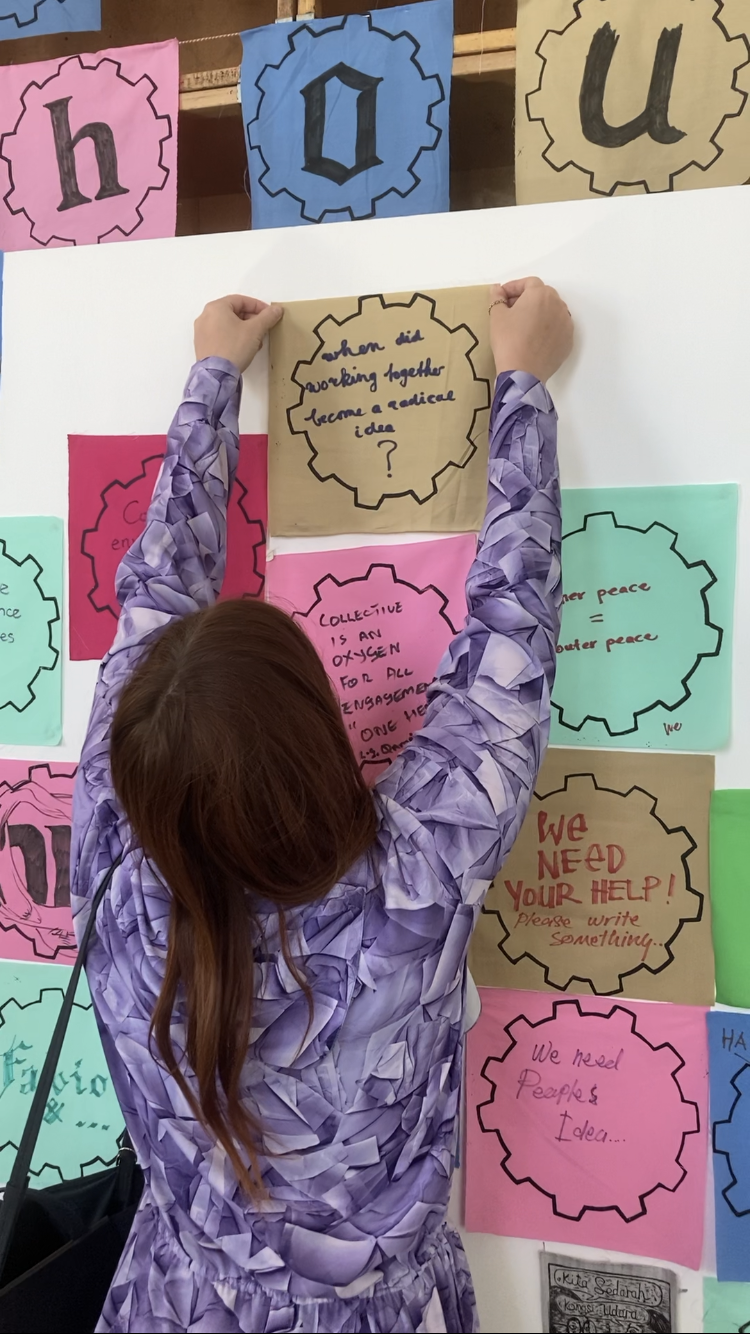 Op uitnodiging van het educatieve kennisplatform Gudskul – dat ondergebracht is in het Fridericianum, een van Europa’s oudste publieke musea en het middelpunt van de documenta – schreef vriend, collega en reisgenoot Cas Hieltjes de volgende zin op een stukje textiel: “When did working together become a radical idea?” Deze vraag zo aan de muur gespeld tussen andere bijdragen bleef de rest van mijn verblijf in Kassel in mijn hoofd zitten. Niet omdat documenta fifteen samenwerken radicaal doet lijken, in tegendeel. De eigenlijke vraag die het opwerpt is: wat is er mis met de museumpraktijken die ik gewend ben?