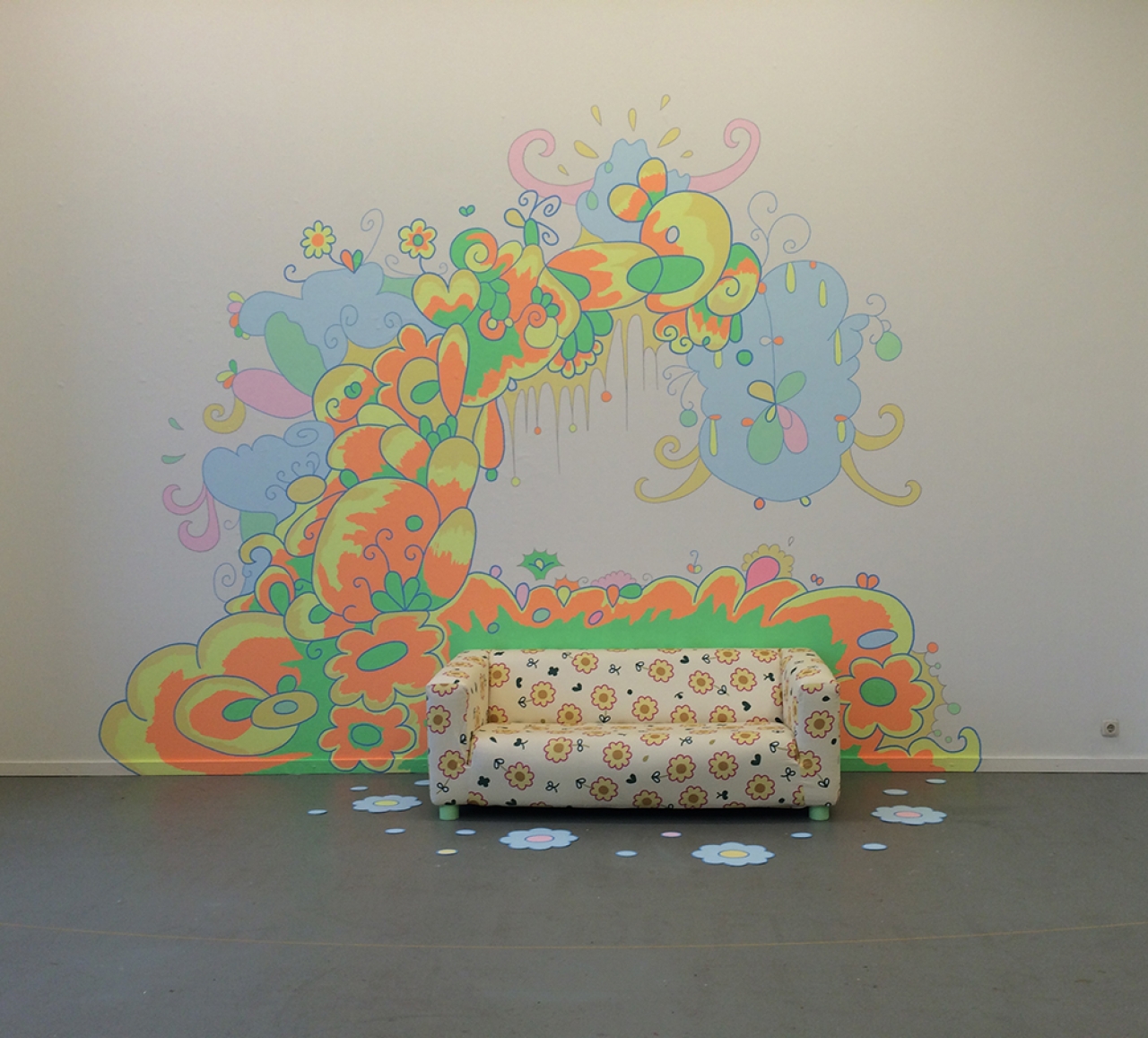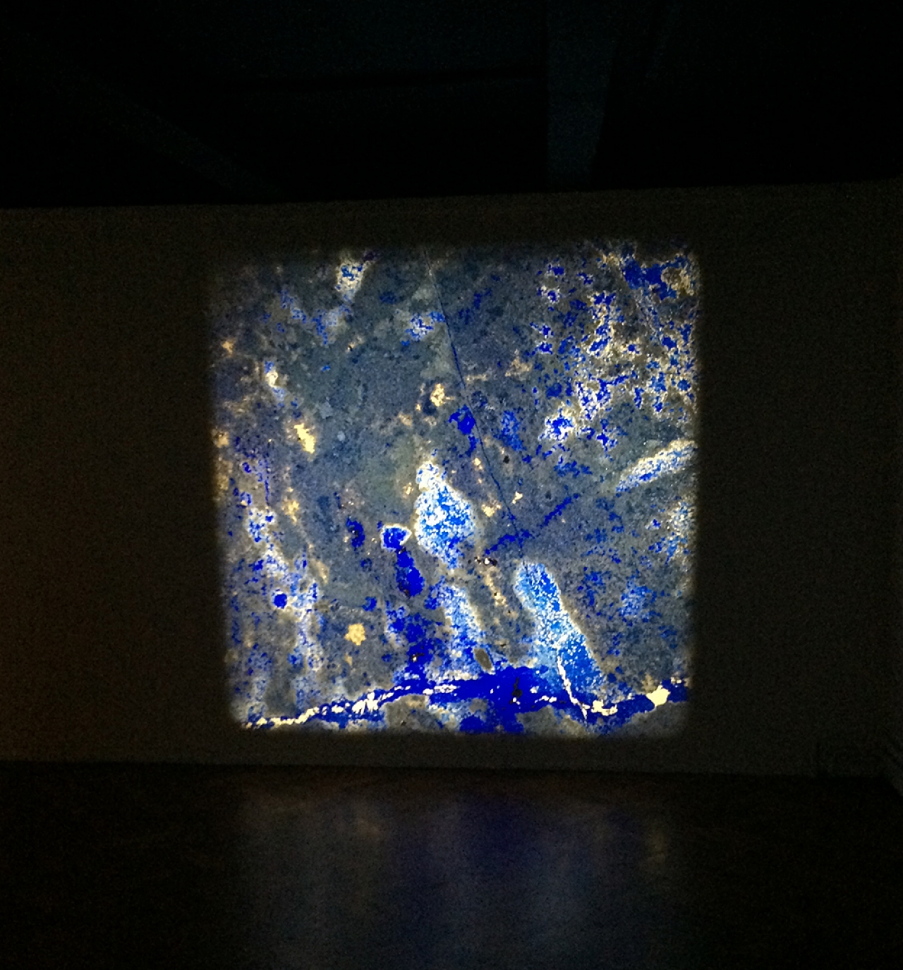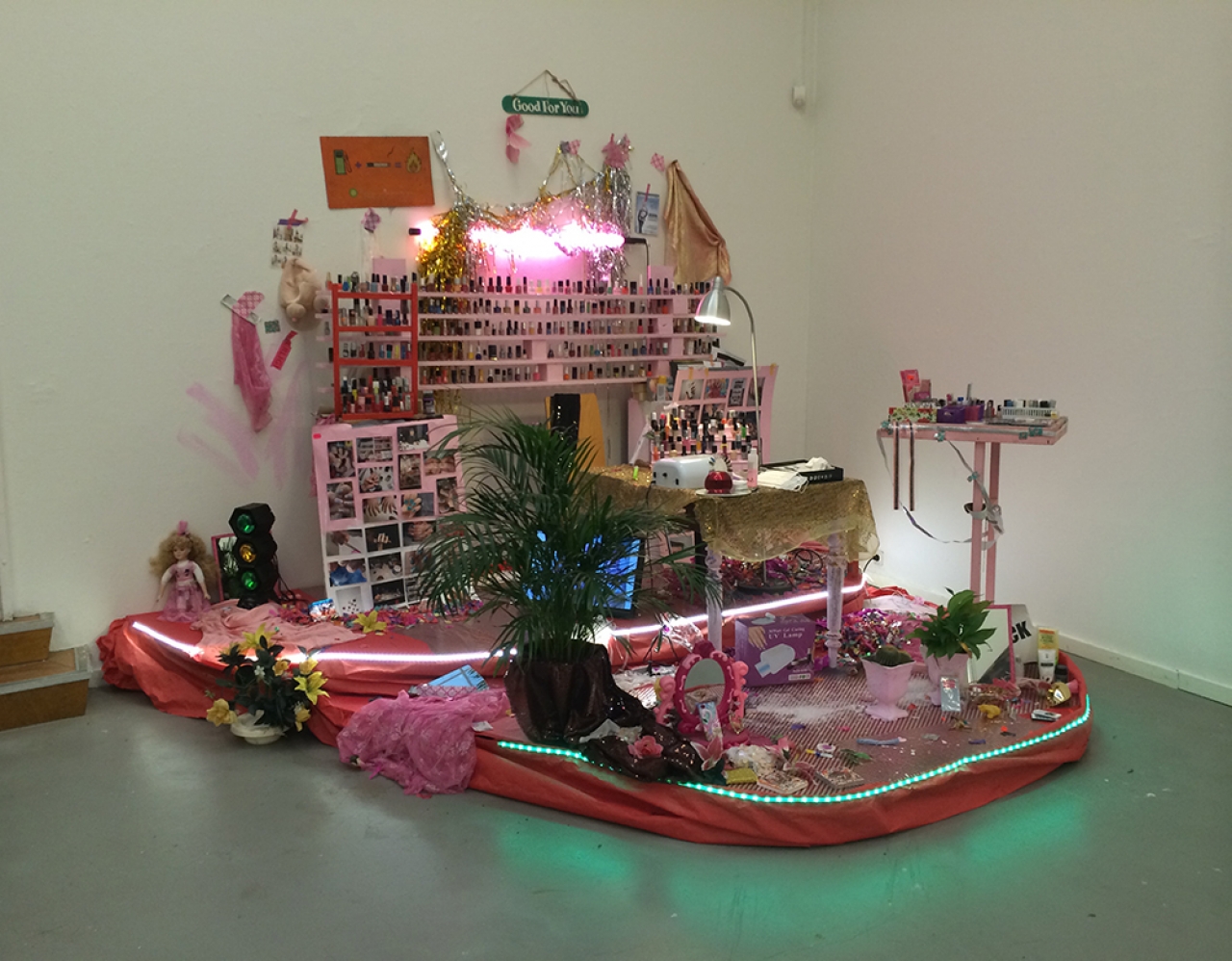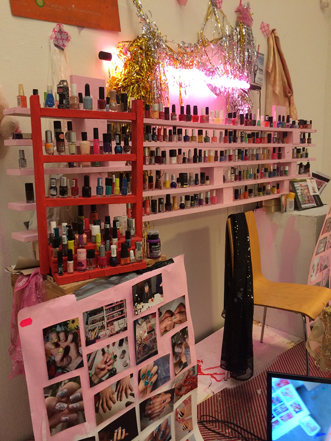 Misschien niet de meest verassende keuze maar zeker een tijdloos kunstwerk dat blijft betoveren in de tentoonstelling over schilderkunst is de dia-installatie van Pieter Paul Pothoven, Lapis Lazuli from Serr-i-Sang. Drie dia-projectoren verlichten de muren met bijzondere patronen in een intense kleur blauw, verweven door gouden aders. Plakjes van de kostbare edelsteen lapis lazuli uit Afganistan, aangebracht op plaatjes glas, zijn de basis voor de dia projecties. De betoverend dromerige beelden van Pothoven leiden echter naar een volgende zaal met een tweede verassende installatie, de Nail-art Studio van Tanja Ritterbex. Een vrolijk geheel waar iedere seconde weer iets nieuws te ontdekken is en de kunstenares zo nu en dan performances in geeft. Een nagelstudio waar baby roze schappen honderden verschillende kleuren nagellakflesjes prijken. Het is goed om te zien dat vulgaire objecten als deze ook een podium krijgen binnen de museale omgeving en vol lef door de drie kunstenaars vrienden in het medium schilderkunst wordt opgenomen. Neon kleuren, glitters en diamanten, een ware snoepwinkel voor de manicure liefhebber. Foto’s van handen met nagels beschilderd in de meest bizarre kleuren en designs krijgen een plek in de installatie, maar zorgen er mede door het bordje ‘Good for You’, hoog boven de installatie aan de muur, voor dat ik mijn nagels niet aan deze installatie toe zou durven vertrouwen.