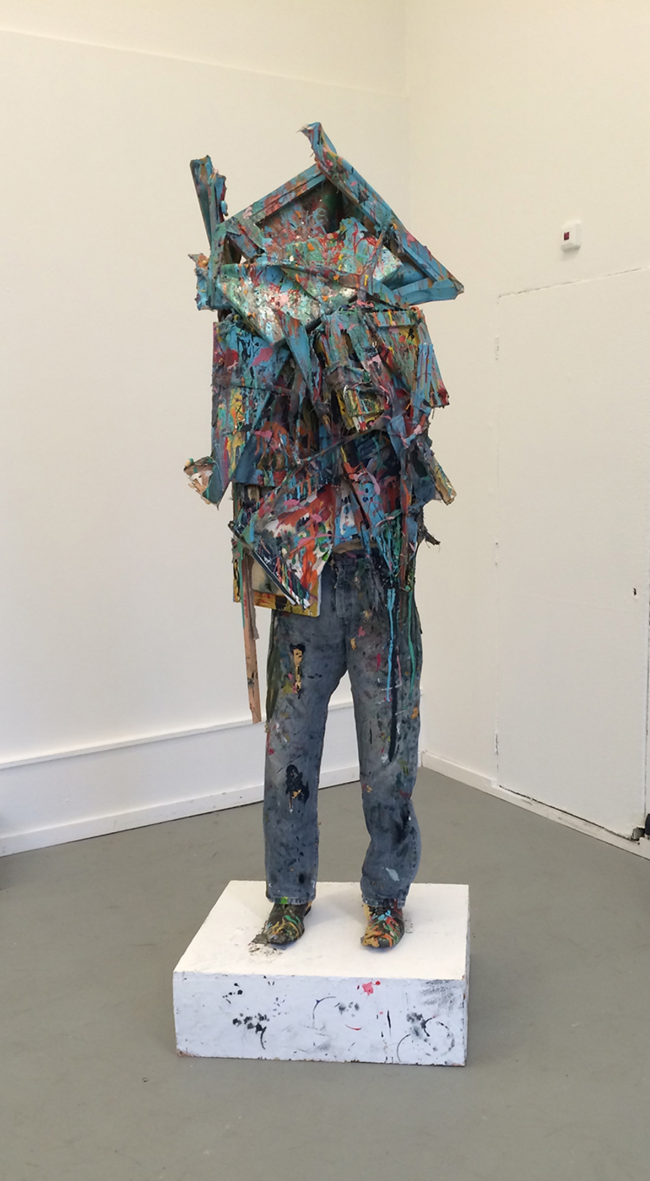 Zo stuit je bij binnenkomst direct op een zelfportret van Roel Jeroen van der Linden. Een sculptuur van menselijke grootte waar de sokkel niet wit van gebleven is, en onder de verfspatten en vegen zit. Het lange mensfiguur draagt een spijkerbroek waar de kunstenaar jaren in geschilderd lijkt te hebben. De broek zit onder vlekken in wel tachtig verschillende kleuren verf, zijn bovenlichaam is bedekt met de ramen van schilderdoeken. Een groot contrast met de kunst van Adzer van der Molen. Zijn schilderij Pedestrian Life hangt een zaal verderop en toont een prachtig straatbeeld van olieverf op doek, die de klassieke ambacht van het modern realistisch schilderen representeert.