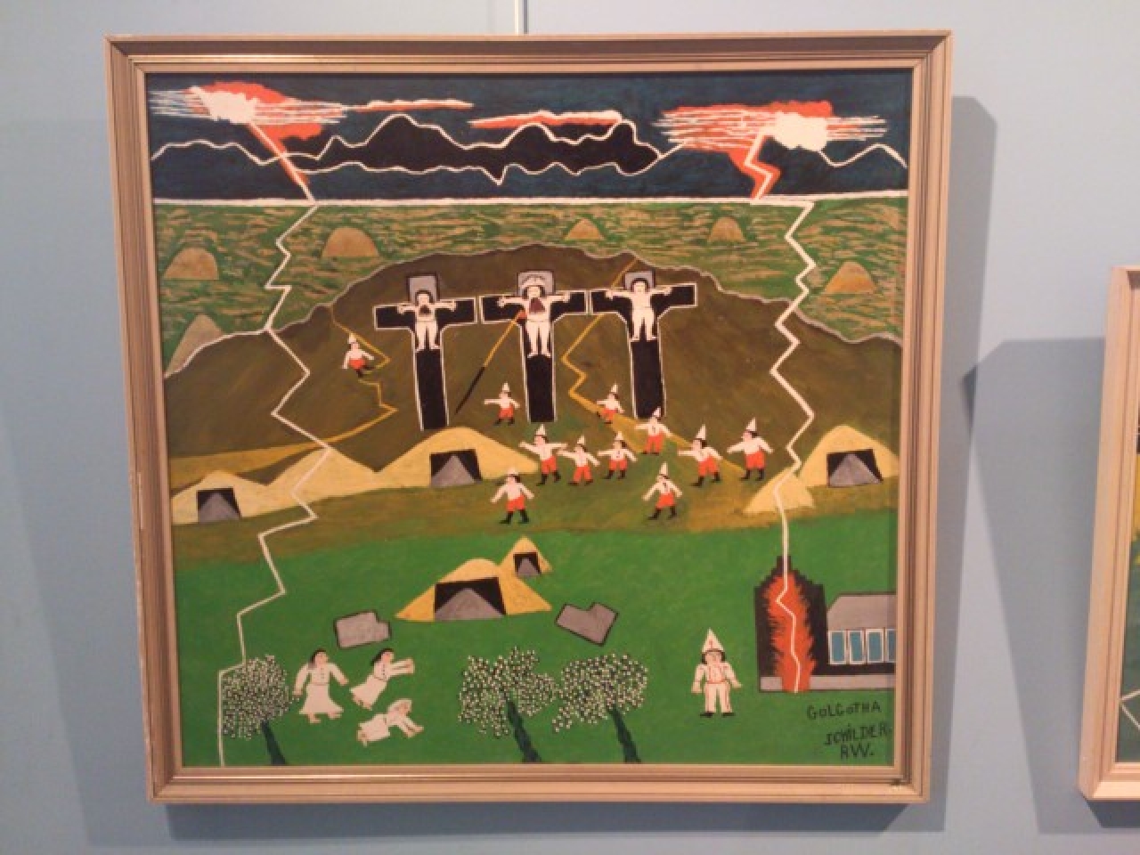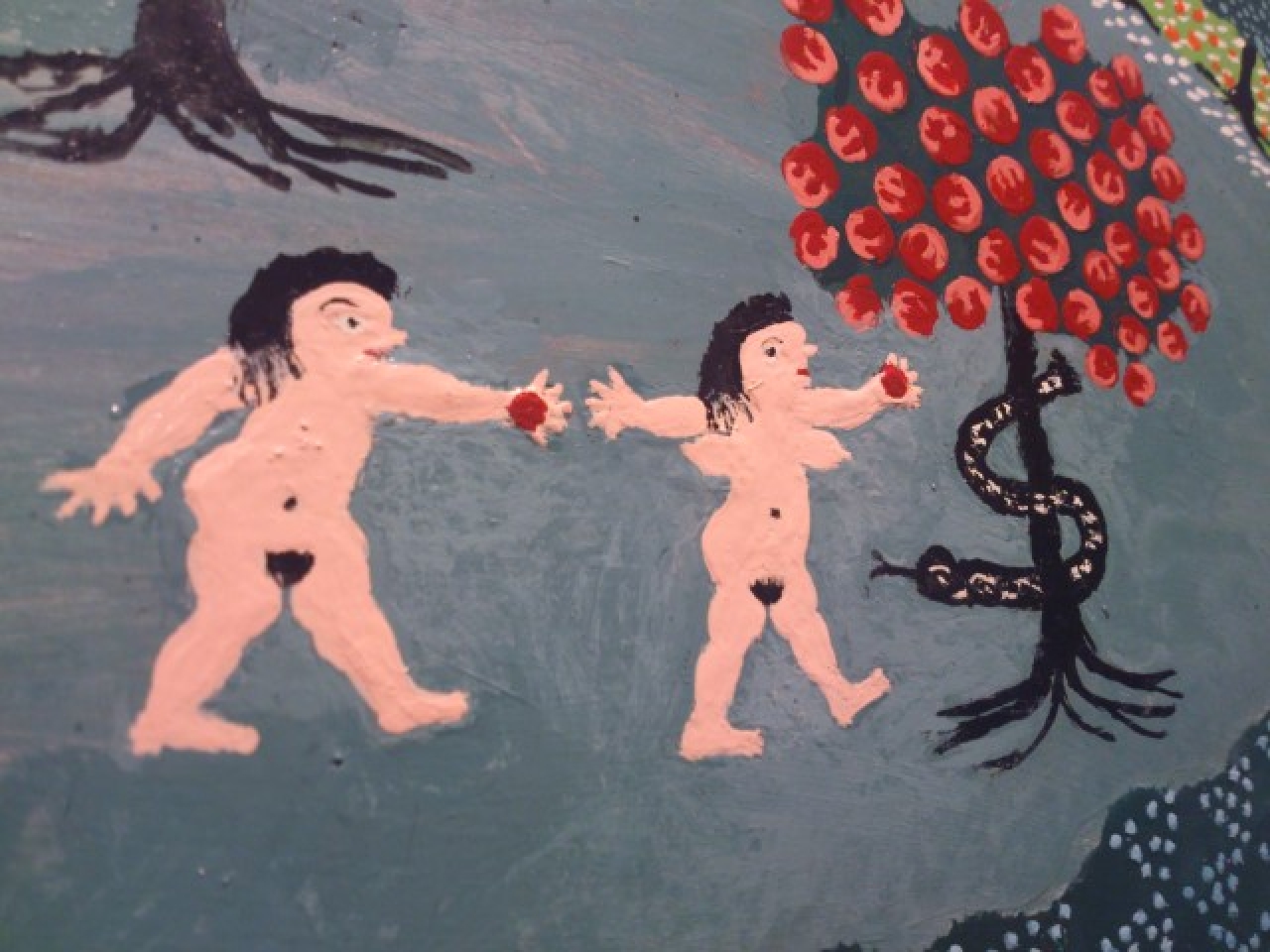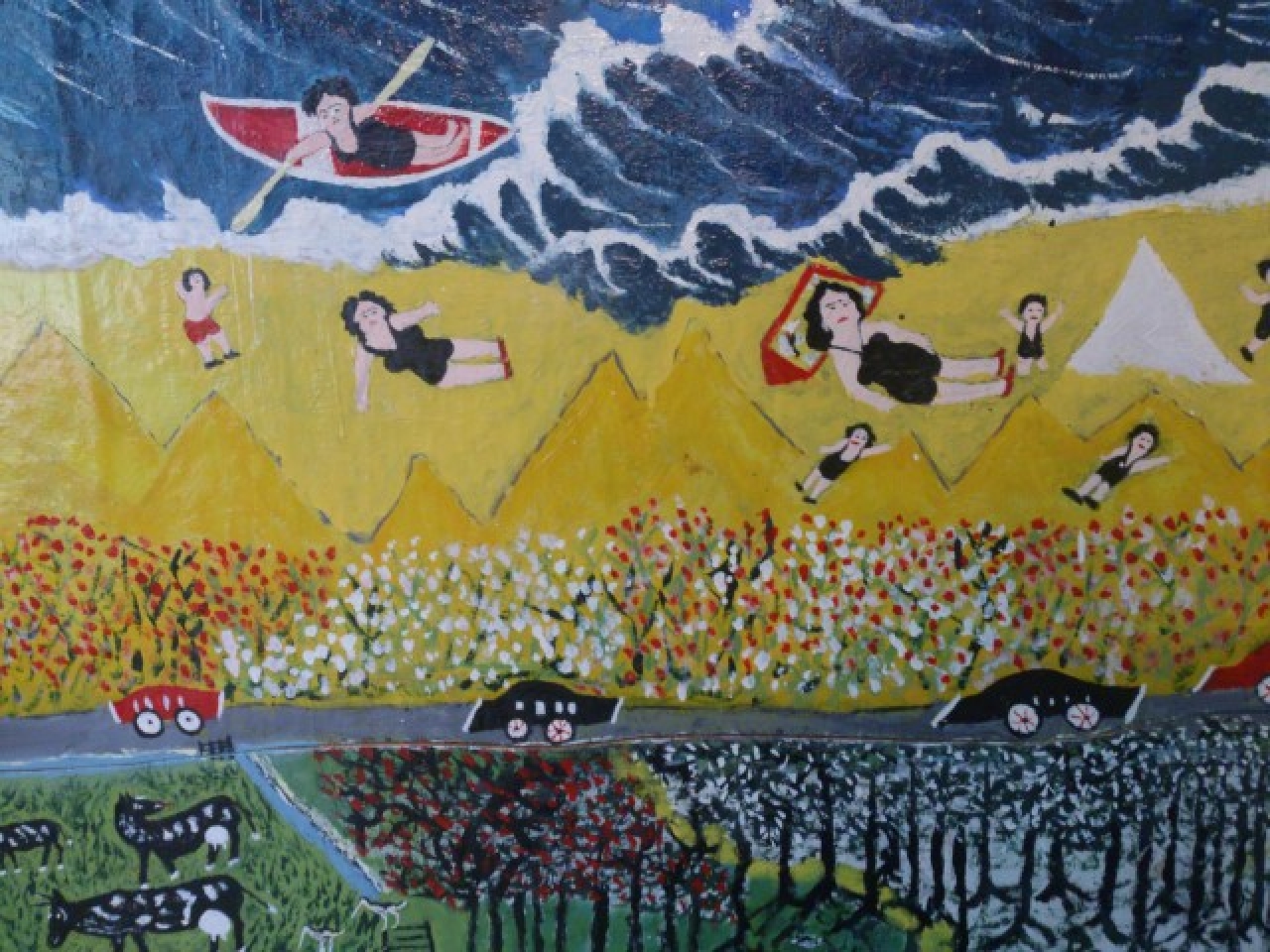 Wat het verhaal zo mooi maakt is dat de man, ondanks de spottende opmerkingen en het gegrinnik van zijn dorpsgenoten, doorging met schilderen. Omdat hij simpelweg niet anders kón. ‘Als ik niet schilder was ik zo maar dood’, zou hij eens hebben gezegd. Hij mag dan een eenvoudig man zijn geweest die waarschijnlijk niet veel van de wereld buiten de streek waar hij woonde afwist, maar het kleine stukje dat hij wel kende vond hij zó prachtig dat hij het zijn huiskamer wilde binnenhalen. Een beetje à la de grottekeningen van Lascaux, zo legde ook Wiersma zijn fascinatie voor de schoonheid van zijn omgeving vast op de muren die hem omringden. De huiskamer waarin hij de vier jaargetijden afbeeldde, zijn levenswerk, lijkt een ode aan het Friese landschap. En zelfs in de Bijbelse taferelen, die hij later op paneel schilderde, zijn feilloos elementen uit zijn directe omgeving te herkennen. Zo heeft ook de Hof van Eden verdacht veel weg van het Friese land, lijkt de oven waar de drie vrienden van Daniël in worden gestopt ziet eruit als een bakkersoven, en de elf apostelen die onder het kruis op Golgotha zijn afgebeeld dragen de kleuren van het Nederlands voetbalelftal dat in 1974 de worldcup won. ‘Alleen dan met de kleuren verkeerd om,’ merkt de gids op, ‘want Ruurd vergiste zich tussen broek en shirt.’ Moois zien doet moois maken.