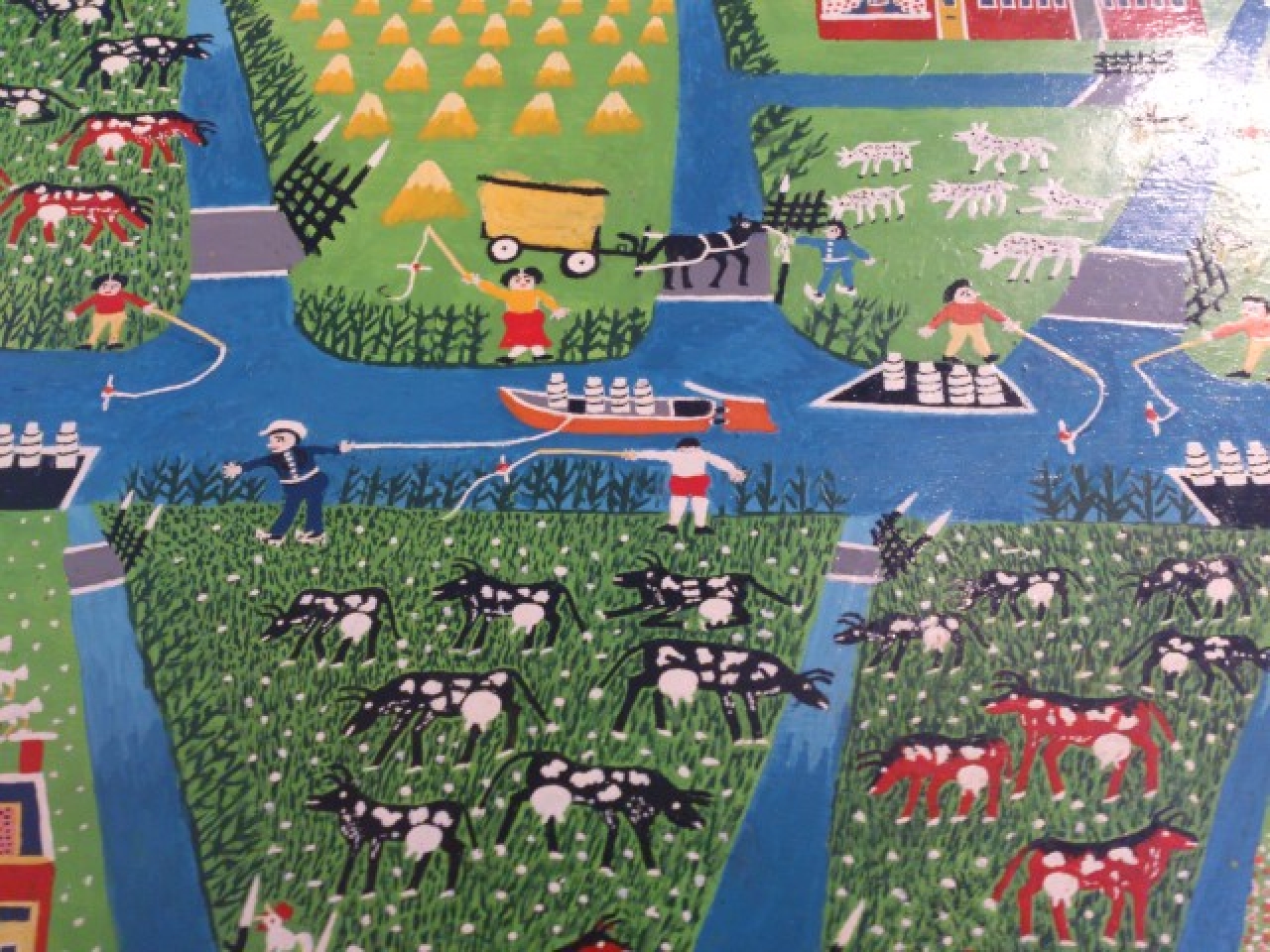Binnen in de voormalige woning van Ruurd Wiersma blijkt de rondleiding zojuist te zijn begonnen. De kamer waarin de gids en een handjevol toeristen enigszins verwonderd om zich heen staan te kijken is van boven tot onder vol geschilderd. De muren, het plafond, de koekoeksklok, een aantal melkbussen en zelfs een paar schoenen dat langs de wand staat – niets is aan het kleurrijke penseel ontsnapt. Een snelle blik rondom de kamer maakt me duidelijk dat op iedere wand een ander seizoen is afgebeeld. Mijn ogen glijden over weiden met grazende koeien, uitgestrekte vlakten bedekt onder een witte laag sneeuw, langs boerderijen van rode baksteen en een wirwar van kanalen waarop trekboten varen, ergens trekt een zwerm ganzen voorbij, en ik zie een strand vol zonnebadende, rondborstige vrouwen in ouderwetse badpakken. Boven ons spant het plafond zich uit als een hemel vol blauwgrijze wolkjes.
