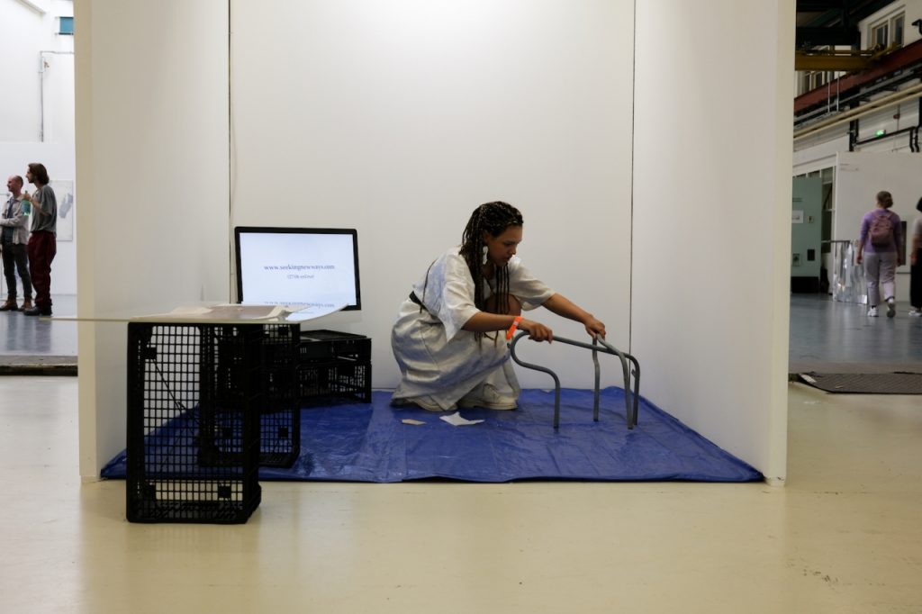 Half in het gangpad, op een geïmproviseerde en toch heel bewust gekozen tafel van kratjes en plexiglas, ligt een publicatie open geslagen: Seeking new ways of behaviour. Nieuwsgierig blader ik er doorheen. Grèta Flusso, een verschijning met lange ingevlochten haren en een wit glanzende kimono, vraagt me of ik iets wil toevoegen, iets wil achterlaten in de stand. Deze uitnodiging om aan te vullen en iets van buitenaf in de stand te plaatsen in plaats van andersom is verrassend, onverwacht en nieuw.
