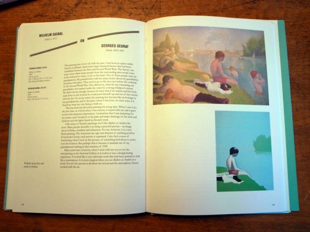 ‘In my view’ vertellen vijfenzeventig kunstenaars over een andere kunstenaar die hem/haar inspireerde. De Poolse kunstenaar Wilhelm Sasnal noemt De baders van Seurat, en vertelt over de grote chemische fabriek in het dorp waar hij opgroeide. Het gebouw stond naast de rivier en in de weekends zaten de dorpsbewoners relaxt op een bankje naar het water te kijken en namen een duik in het water. Zijn grootvader verdronk er bijna in een kolk maar wist gelukkig dat als je je mee laat voeren naar de bodem je dan weer kunt afzetten om omhoog te komen. De baders van Seurat is een hommage aan zijn grootouders en zijn geboorteplek. ‘In some ways, it is therefore what my very being is built on’. Sasnal vindt het geen mooi schilderij, hij ziet vooral de eenzaamheid van de figuren. ‘I feel a sens of foreboding when I look at this picture, of something bad about to arrive over the horizon. For me this picture is all about the mood and the atmospheres. Seurat worked with the air.’ Nadat Sasnal het schilderij in het echt had gezien constateerde hij teleurgesteld dat de afbeelding magischer werkt dan het origineel.