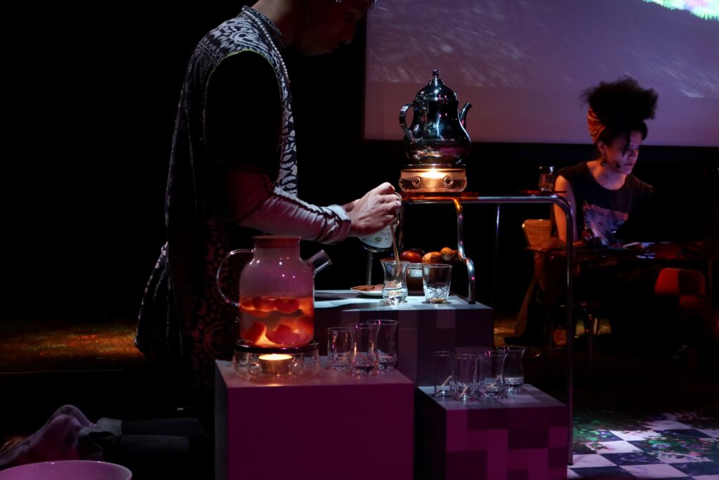 Een verduisterde ruimte, glimmende kussens, zitzakken. Samuel zit links, bereidt thee. Twee gamers achter schermen. De een kent het spel en loodst de ander door het universum dat Samuel samen met game-developer Pepijn Willekens ontwikkelde. Zo echoot deze voorstelling de vorm van Twitch, een livestreamplatform waarop gamers laten zien hoe ze zich door bepaalde spellen heen worstelen. Achter de twee spelers worden hun acties op een groot scherm geprojecteerd.