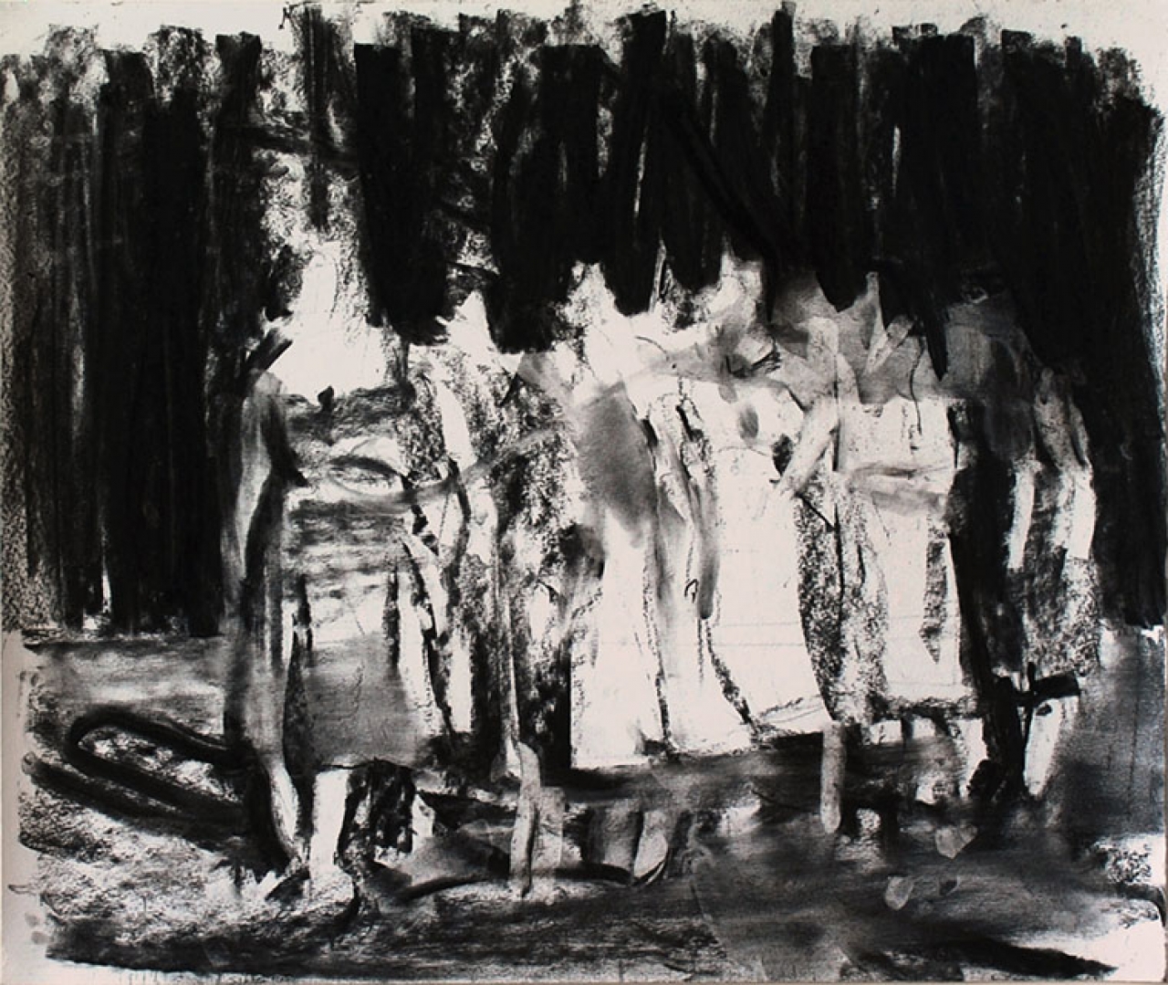 De voorstelling is helder: menselijke figuren staan dicht tegen en achter elkaar, in een diagonale rij, gepositioneerd in het midden van het beeld. Doordat het twijfelachtig is naar welke situatie we kijken, ontstaat er ruimte voor interpretatie. Zien we een familie die tegen de achtergrond van een natuurgebied is geportretteerd? Of een groep mensen die op een koude oorlogsnacht worden opgepakt? De afwezigheid van voltooide, concrete objecten en figuren zorgt voor aanwezigheid van de toeschouwer. Daar waar het figuratieve eindigt en daar waar ruimtelijke leegtes ontstaan binnen de tekening, duiken 100den associaties op.