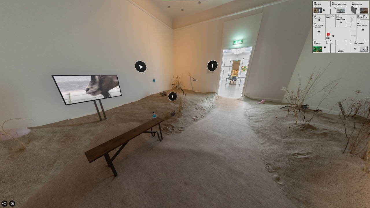 De installatie doet me denken aan het einde van een dagje strand, waar sporen van de aanwezigheid van de mensen zichtbaar zijn in de vorm van achtergelaten rommeltjes en afgedankte strandballen. Het is een stukje duin waar pannen uit de muur groeien, groentes aan het plafond hangen en waarin een tv-scherm staat waarop een geit me aankijkt, wachtende op de video die niet afgespeeld kan worden in deze virtuele wereld.