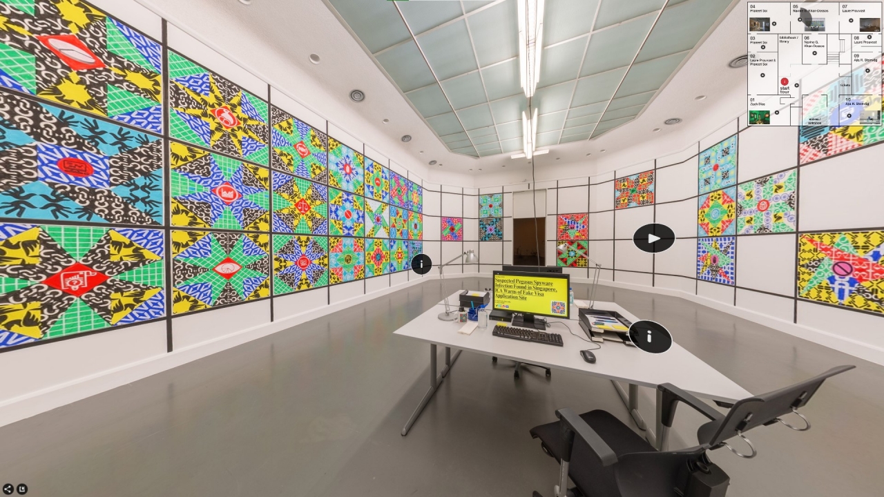 De installatie van Navine G Khan-Dossos is verdeeld over 2 ruimtes, ze sluiten feilloos op elkaar aan door het gebruik van het doorlopende raster op de muur, sommige vlakken zijn leeg, maar het merendeel is gevuld met de felle, contrasterende patronen die op elkaar lijken te reageren. In het midden van de eerste zaal zie ik een bureau met een computer, die mij vertelt te kijken naar een online database, een waar alle patronen op zich te zien zijn, en die vertelt aan welk artikel ze gerelateerd zijn. Want dat is hoe Khan-Dossos heeft gewerkt; de indrukwekkende installatie is een ‘geïllustreerde’ verwerking van het verhaal van de Saoedi-Arabische journalist en politieke dissident Jamal Khashoggi, die werd vermoord in Istanboel op 2 oktober 2018. Elk vlak is een onderdeel van het verhaal dat verteld werd in nieuwsberichten, de 100 vlakken hebben elk een patroon dat beïnvloed is door de aniconische Islamitische kunst; het niet willen of mogen afbeelden van figuratieve afbeeldingen, met name van goddelijkheden.