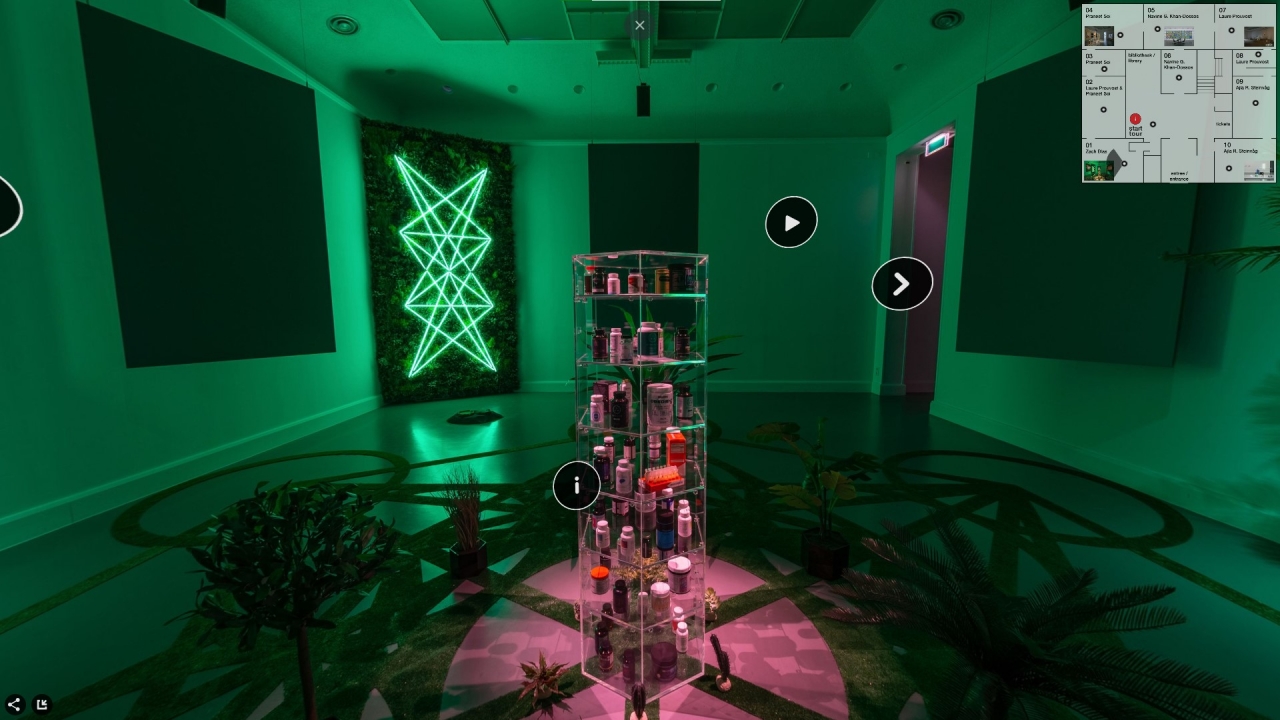 Wanneer ik mijn laptop aan de praat heb gekregen, begeef ik me naar de site van het Van Abbemuseum en al snel waan ik me in een bekend tafereel. Ik sta in de virtuele traditionele bakstenen hal van het Rijksmonument. Het infoknopje op de muur vertelt me waar ik naar ga kijken en de plattegrond in de bovenhoek zal me helpen navigeren.
