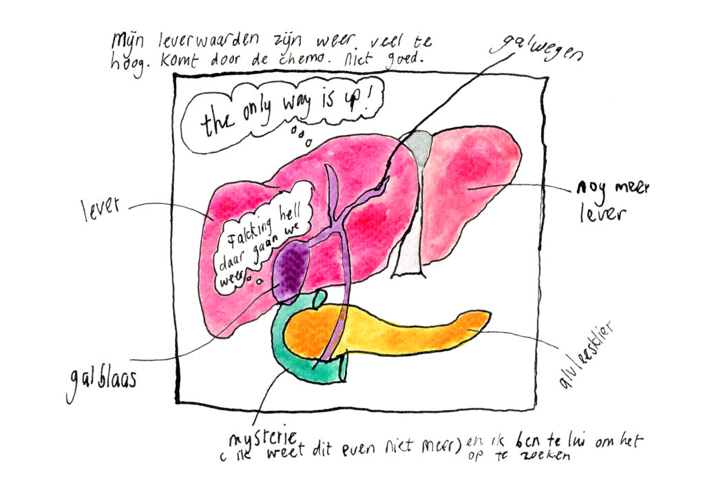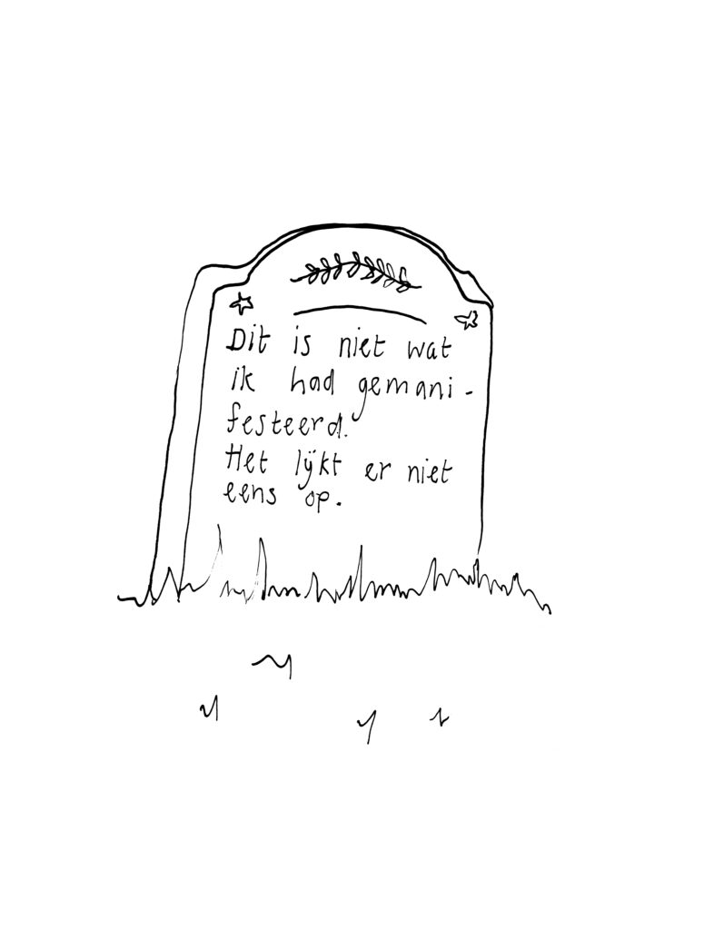 In dit leven is mijn verjaardag een ander verhaal. In de aanloop er naar- toe (een aanloop die ik niet eerder zo zag aankomen) ben ik me ineens bewust van hoe confronterend mijn verjaardag is. Is dit mijn laatste verjaardag? Wat gaat er het aankomende jaar gebeuren met mij? Hoe moet ik me verhouden tot een aankomend jaar? Hoe verzin je een toe- komst die er niet lijkt te zijn? Hoe verzin je een andere toekomst, eentje die er wel kan zijn en die het liefst niet angstaanjagend is? Hoe navigeer ik daar doorheen zodat ik niet in een abstracte variatie op een wachtkamer zit? (Met de dag leven, meebewegen, accepteren, checkerdecheck- checkcheck die snap ik, maar dat is niet wat ik zoek.)