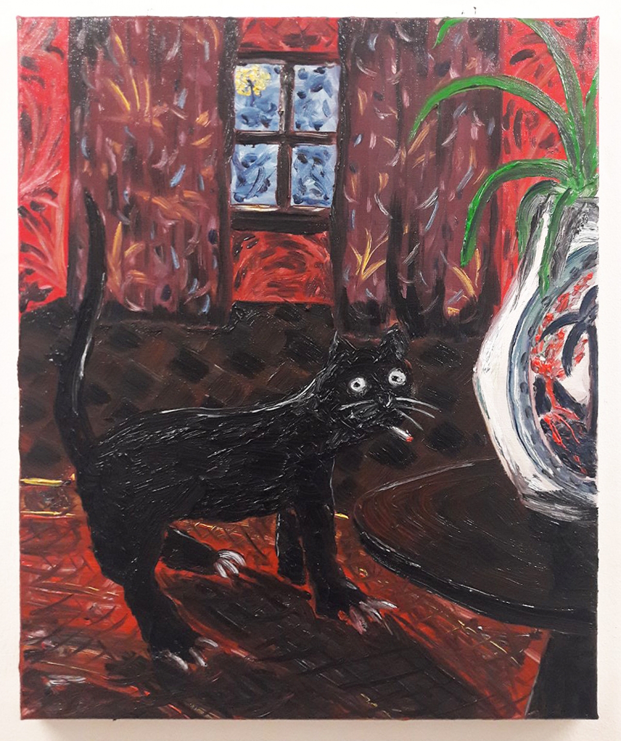 De smorende opa in het park is inmiddels nostalgie. Dankzij rookvrije zones en assertieve niet-rokers, die uiteraard het gelijk aan hun zijde hebben, wordt de roker verbannen uit de publieke ruimte. In de beslotenheid van zijn eigen huis doet hij echter precies waar hij zelf zin in heeft. Oost west, thuis best lijkt de boodschap in het schilderij Domestic Animal. We zien de kater van de kunstenaar die gewillig poseert voor zijn meester. Hij kijkt de toeschouwer uitdagend aan met gekrulde staart en gestrekte pootjes. ‘Wie doet me wat’ lijkt hij te willen zeggen. Zijn zwarte kattenlippen krullen van plezier omhoog, want daartussen zit een sjekkie dat het dier met veel smaak oprookt. Het leven is kort, laat ieder toch zijn pleziertje, lijkt de boodschap van de kater, de hond en het dampende aardappelmannetje in het park.