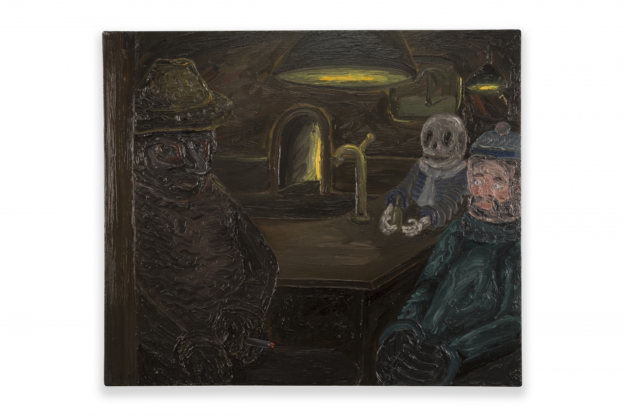 De kroeg is in het universum van Duijf het middelpunt der aarde. Letterlijk, want door de donkere aardetinten en modderige penseelstreek van het schilderij lijkt het tafereel zich af te spelen in een krocht. De vaste klanten, het aardappelmannetje is natuurlijk ook van de partij, scharen zich rond de tapkraan en de zwak flakkerende schemerlamp. Gezelligheid kent geen tijd, want de klok druipt à la Dali van de muur af. Aan de toog zit een zuipschuit met baard en schipperspet die mismoedig voor zich uit staart, hij lijkt op de whiskydrinkende kapitein Haddock uit de stripverhalen van Kuifje. Links, leunend tegen de deurpost zien we opnieuw een verstokte roker met gleufhoed en sigaret in de hand. Duijf heeft hem bijna geboetseerd in verf, zijn contouren springen door de gezwollen verflagen naar voren en hij komt daardoor tastbaar uit het doek. Duijfs eerdere doeken waren vlakker geschilderd en lichter van kleur, de inspiratie die hij haalde uit comics was duidelijk te zien in speelgoeddino ’s, gestileerde palmbomen en Pinokkios met lange neuzen. Maar sinds de overstap van acryl naar olieverf is zijn werk donkerder en pasteuzer geworden. De smeuïge streek valt samen met een intimistische onderwerpkeuze, de blik is meer naar binnen gekeerd en het leven van alledag speelt de hoofdrol. Hij maakt zijn doeken dan ook zittend aan een tafel zodat de dikke verflagen kans krijgen om te drogen. Verf speelt vaak de hoofdrol in zijn laatste werken, vette plastische streken druipen bijna van het doek af, ze worden maar ternauwernood in toom gehouden door de voorstelling. Bij het kroegtafereel ‘The center of the World’ lijken de figuren langzaam weg te zinken in deze oersoep van gebrande omber en rauwe sienna. Een prachtige metafoor voor de vergetelheid van zatlappen en dronkenmannen.