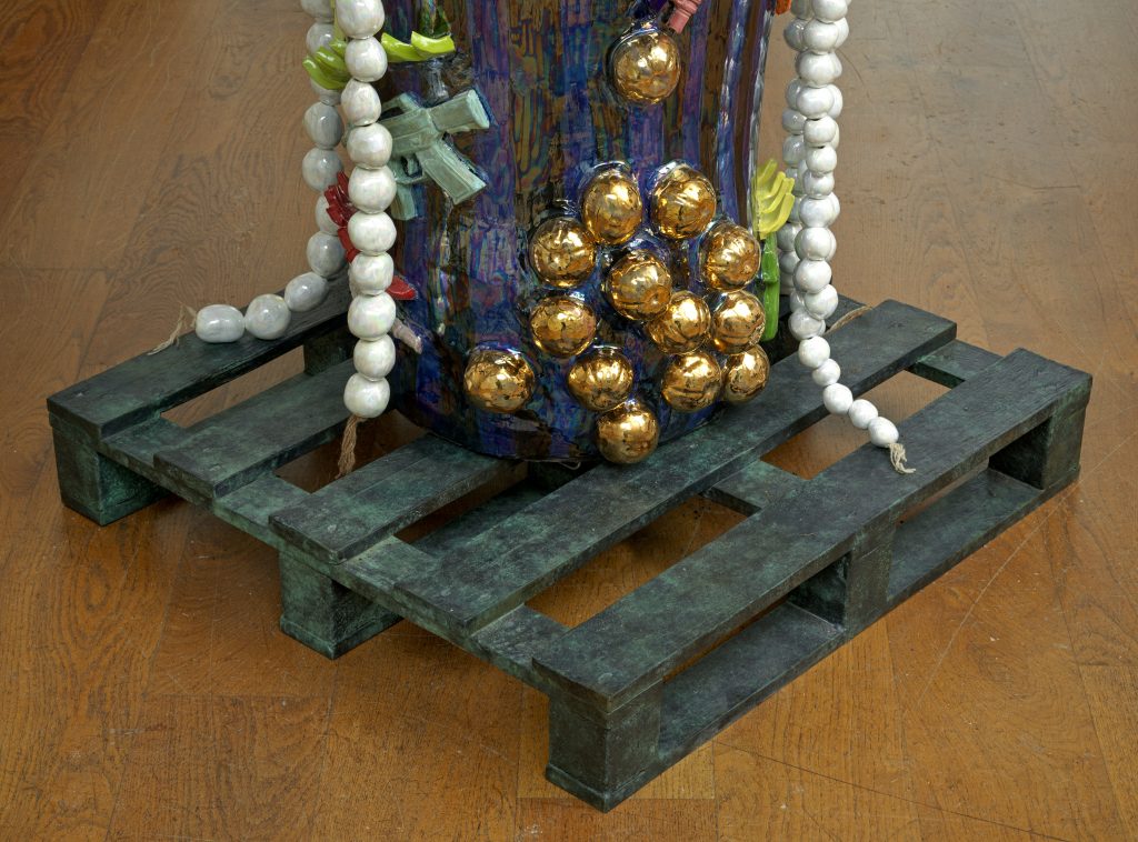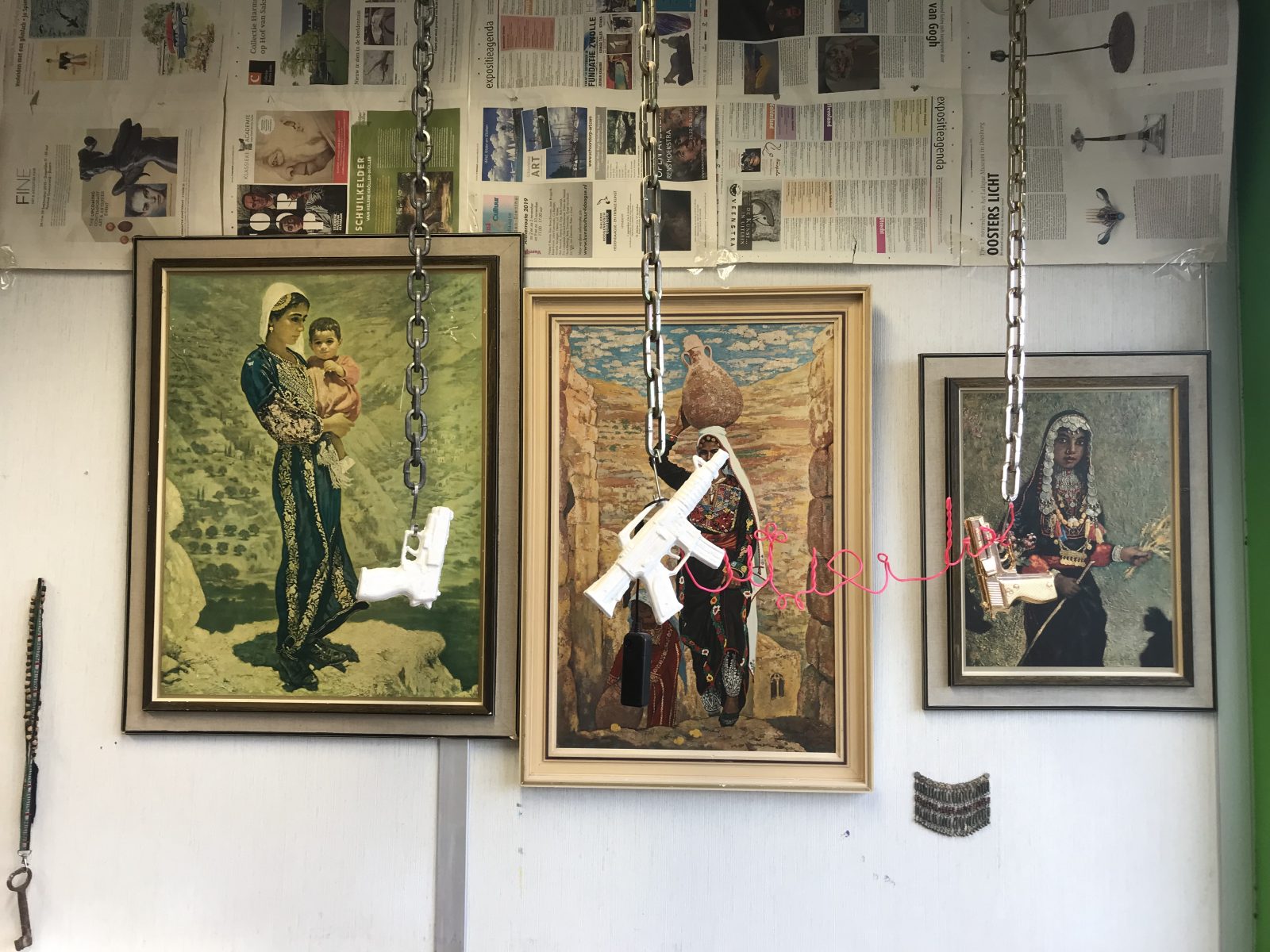 Drie kopieën van sentimentele oriëntalistische schilderijen van vrouwen met kruiken en kinderen hangen aan de muur. Ervoor bungelen witte geweren aan kettingen. Onaffe potten met likkende vlammen staan op forse blauwe draaischijven op wieltjes. Een glazen hokje buiten blijkt een expositieruimte Yusef’s Schwärmer en is vol gezet met keramieken potten waaraan glanzende witte kralen hangen, kleurrijk geglazuurde geweren kleven eraan vast, en stekelige cactussen en mega palmen schieten omhoog. Een raadselachtige totem. Het is alsof alle werken geschreven zijn in een taal die ik niet machtig ben, vol verwijzingen die ik niet helemaal begrijp.