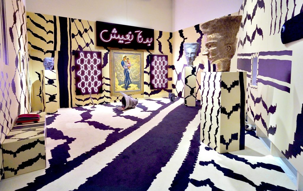 Bijna als een altaar hangt het originele schilderij van William Halewijn tussen twee panelen met een patroon in neon dat lijkt op gehaakte wol of de lussen van een ijzeren hek. De vloer en wanden zijn bedekt met een mega uitvergroting van de sjaal van Arafat. Deze sjaal uit het verleden lijkt een symbool voor hoop want in de tijd van Arafat liepen er tenminste gesprekken over vrede. Tijdens een vergadering van de Verenigde Naties betuigde Arafat: ‘Ik sta hier vandaag voor u met een olijftak en een pistool van de vrijheidsstrijder. Laat de olijftak niet uit mijn handen vallen…’