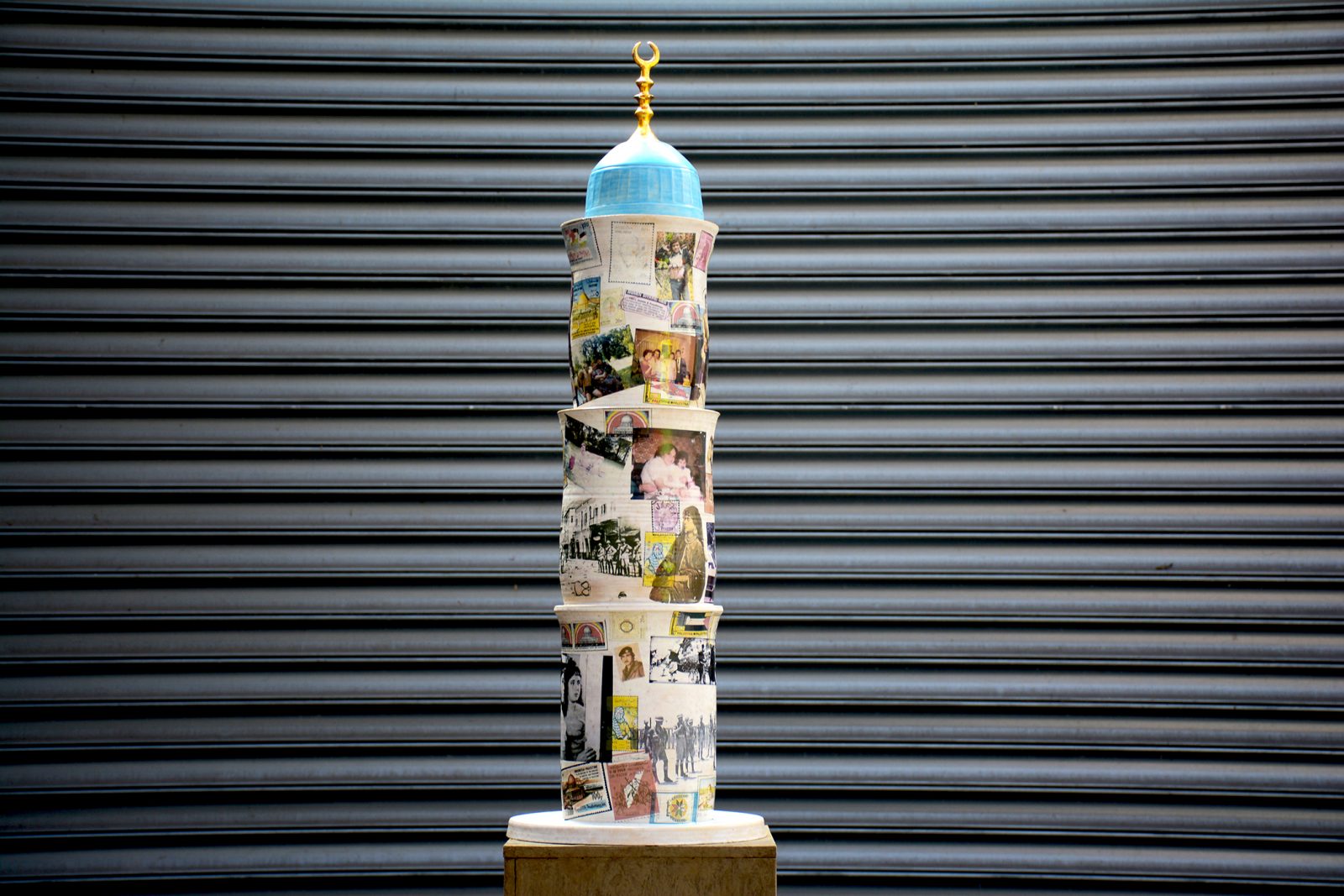 In haar atelier ontrafel ik de transfers op de keramieken minaret van Jaffa met zijn stralende gouden maantje: familiefoto’s en de geschiedenis overlappen elkaar rondom.