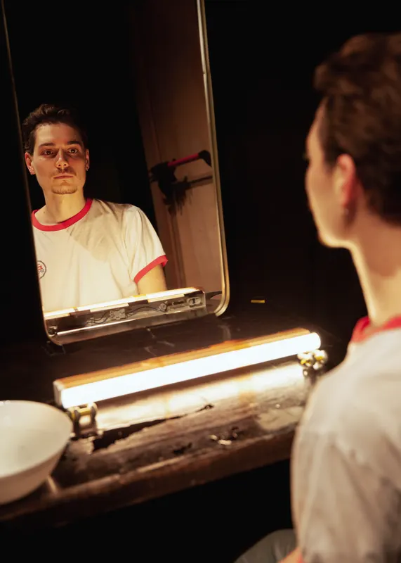 Bakermatje is een monoloog, geschreven door Fien de Smet, gespeeld door Luca Bötzel. In een nogal krappe zijflank van de grote zaal van Theater Bellevue nam ik plaats. De acteur zat op een poef en was nabij. Dat wil zeggen: zijn aanwezigheid was intens, het zaaltje zo klein dat hij de toeschouwers stuk voor stuk in de ogen kon kijken. In de ogen kon kijken terwijl hij zijn spel begon.