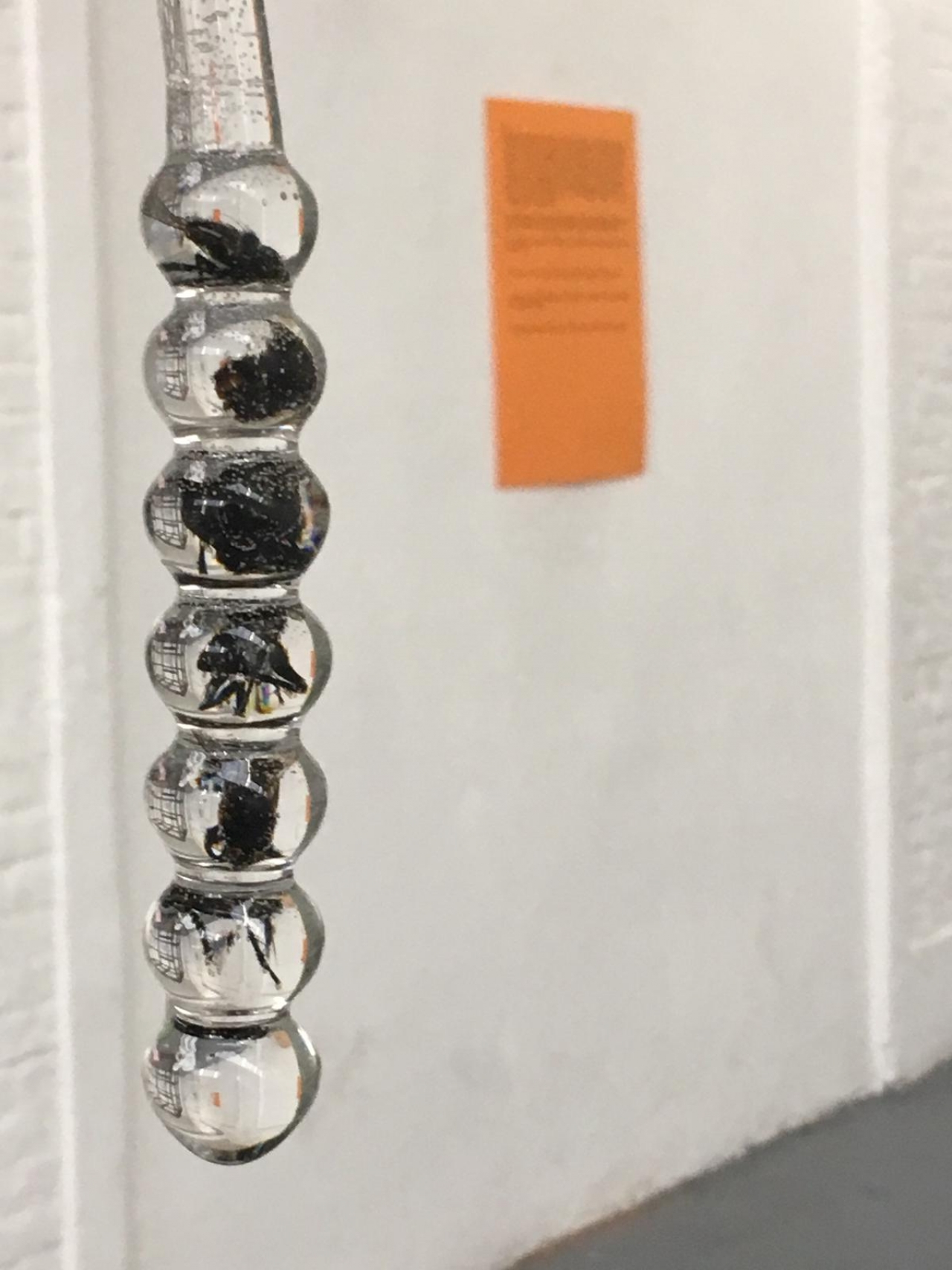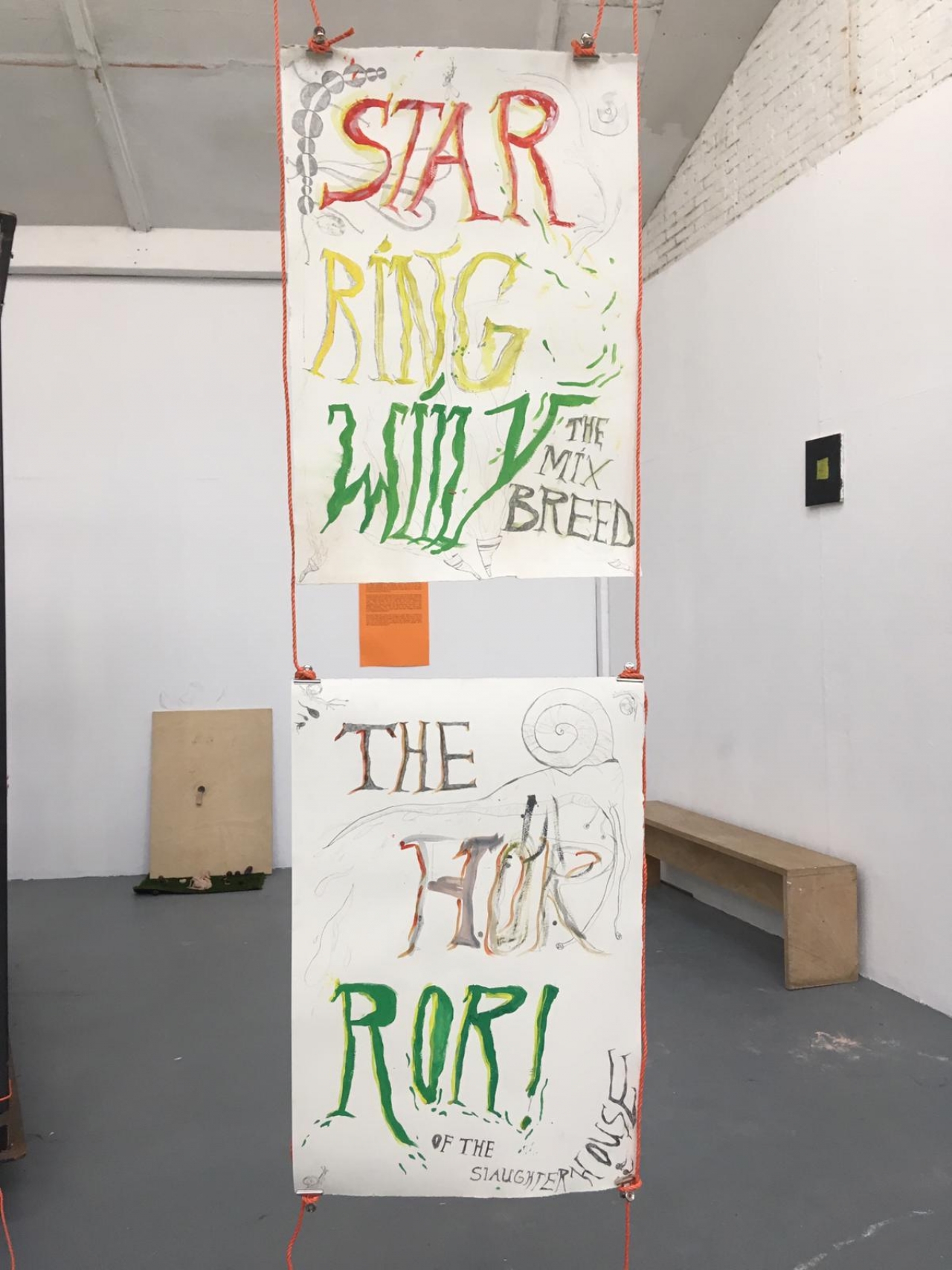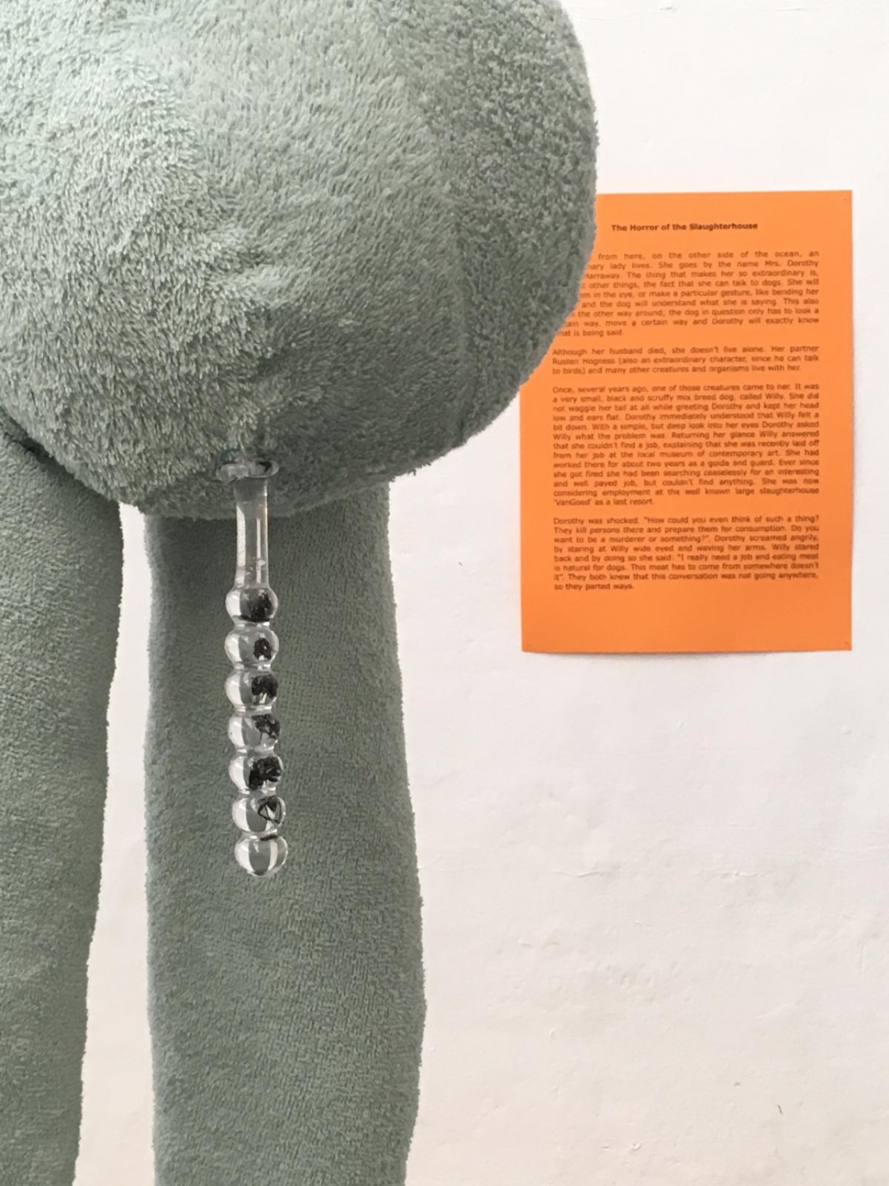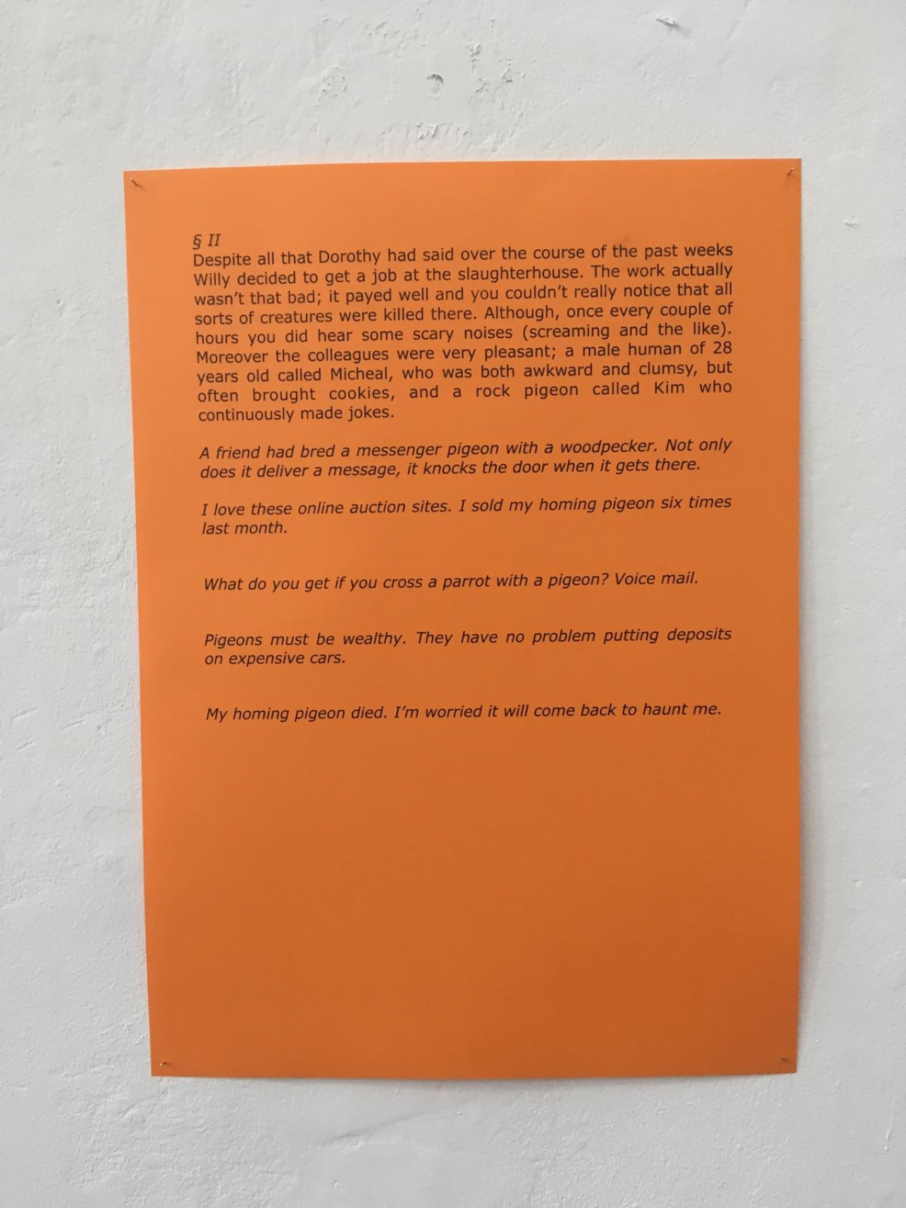 ‘Far away from here, on the other side of the ocean, an extraordinary lady lives. She goes by the name Mrs. Dorothy Pepper Harraway.’ Is de eerste zin van een vijfdelig verhaal dat op oranje vellen is afgedrukt en op de wanden van de ruimte is opgehangen. Zij leiden je van links langs de wanden naar rechts zonder een detail van de objecten te missen. Want daar zit het vol mee, dode insecten vastgeklemd in klei, slakkensporen waar je ongemerkt opstapt en potloodtekeningen die te zien zijn als je van dichtbij even op je knieën gaat zitten. Maar de titel, The Horror of the Slaughterhouse, laat jou afwachten tot het moment dat leidt tot de laatste zin; ‘’Thank God the end of this hellish tunnel,’ Willy thought.’ Een kleurrijk horrorverhaal waarvan je vrolijk wordt.