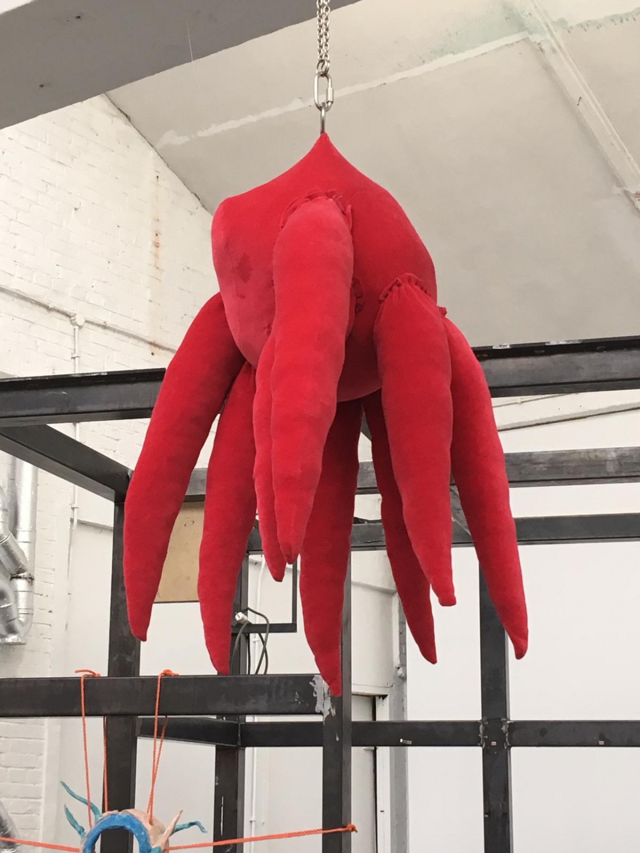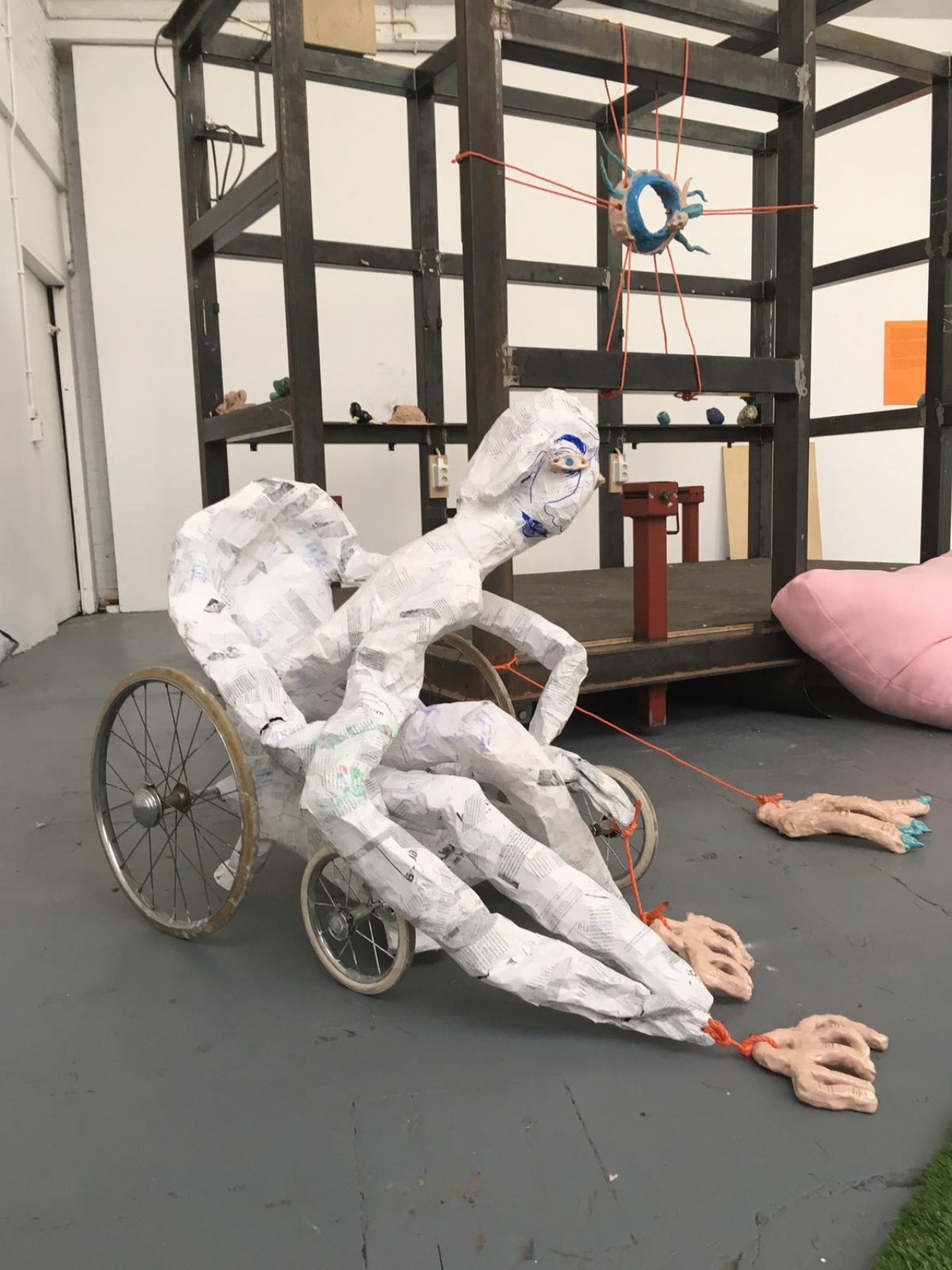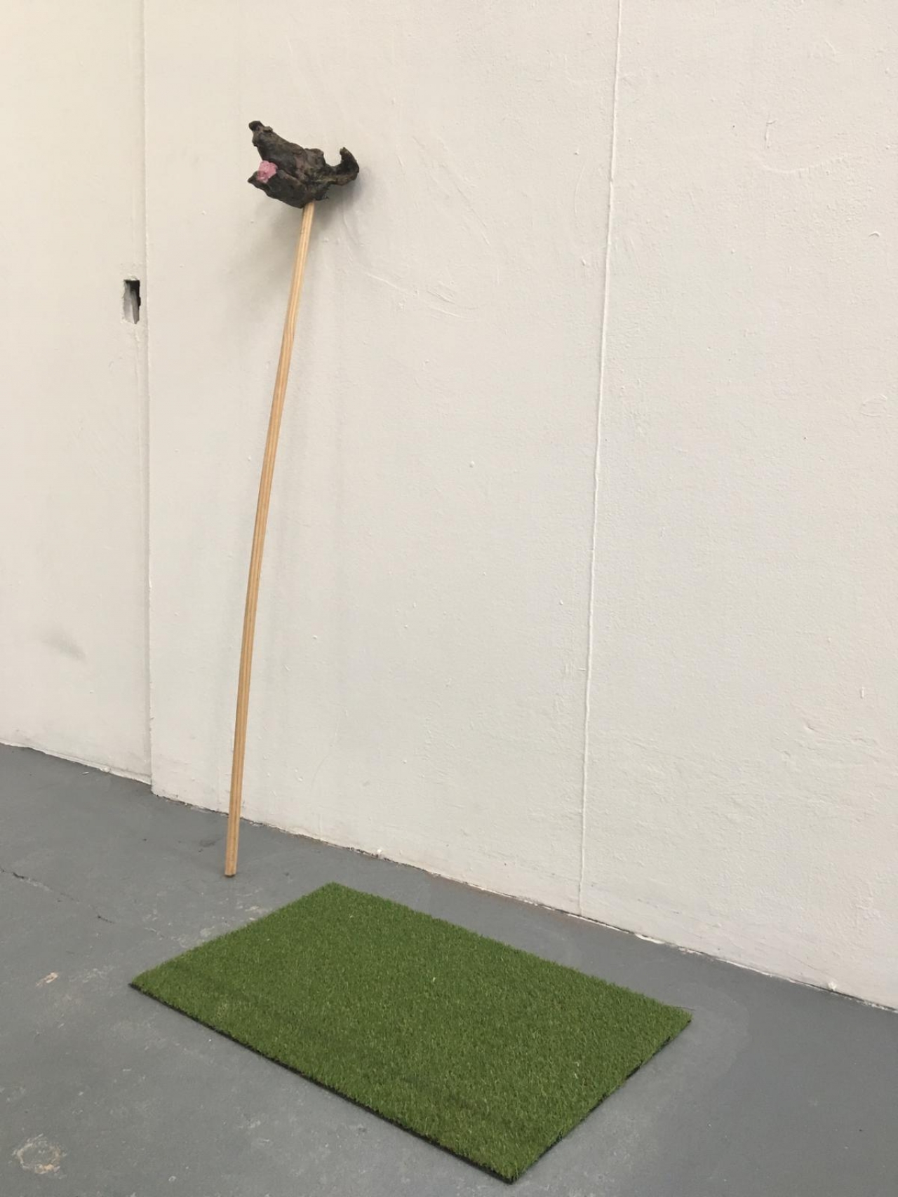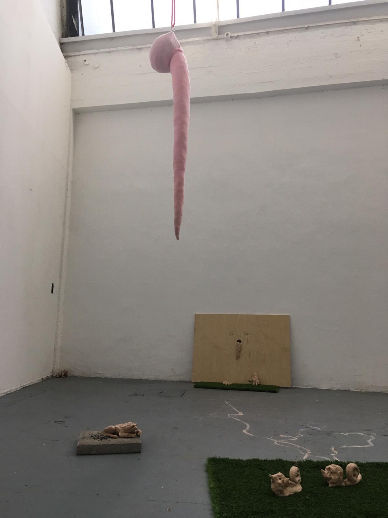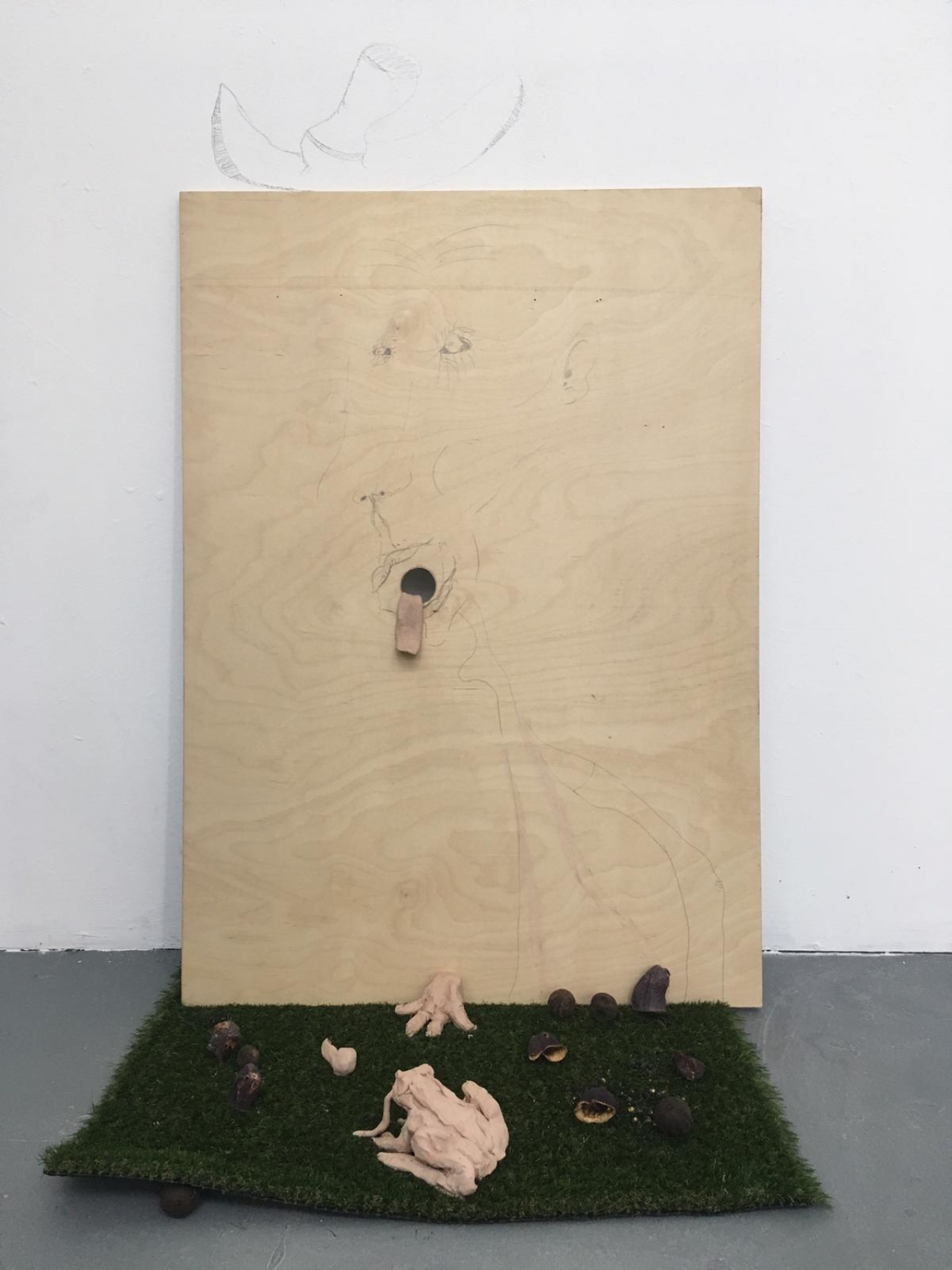 ‘Far away from here, on the other side of the ocean, an extraordinary lady lives. She goes by the name Mrs. Dorothy Pepper Harraway.’ Is de eerste zin van een vijfdelig verhaal dat op oranje vellen is afgedrukt en op de wanden van de ruimte is opgehangen. Zij leiden je van links langs de wanden naar rechts zonder een detail van de objecten te missen. Want daar zit het vol mee, dode insecten vastgeklemd in klei, slakkensporen waar je ongemerkt opstapt en potloodtekeningen die te zien zijn als je van dichtbij even op je knieën gaat zitten. Maar de titel, The Horror of the Slaughterhouse, laat jou afwachten tot het moment dat leidt tot de laatste zin; ‘’Thank God the end of this hellish tunnel,’ Willy thought.’ Een kleurrijk horrorverhaal waarvan je vrolijk wordt.