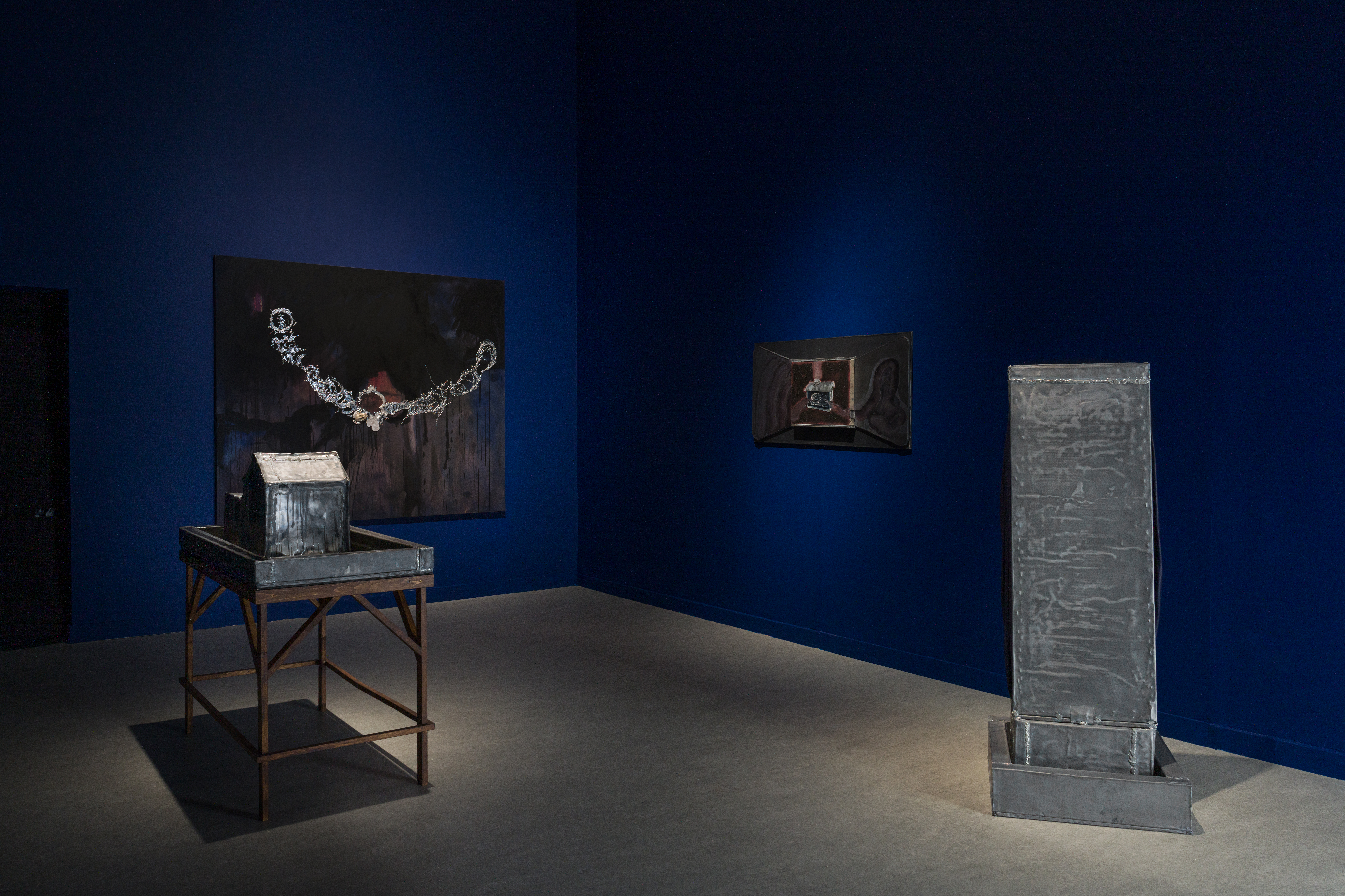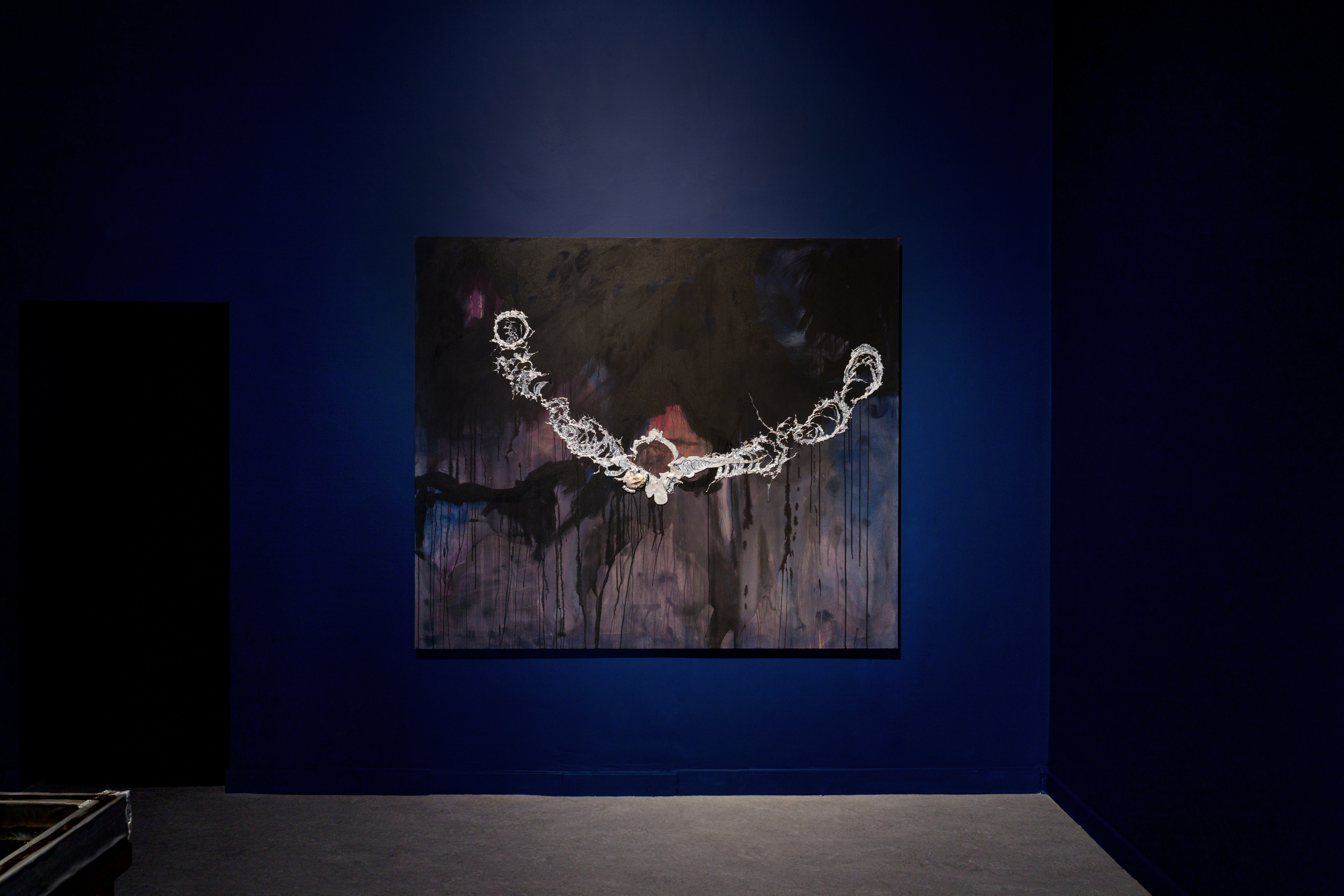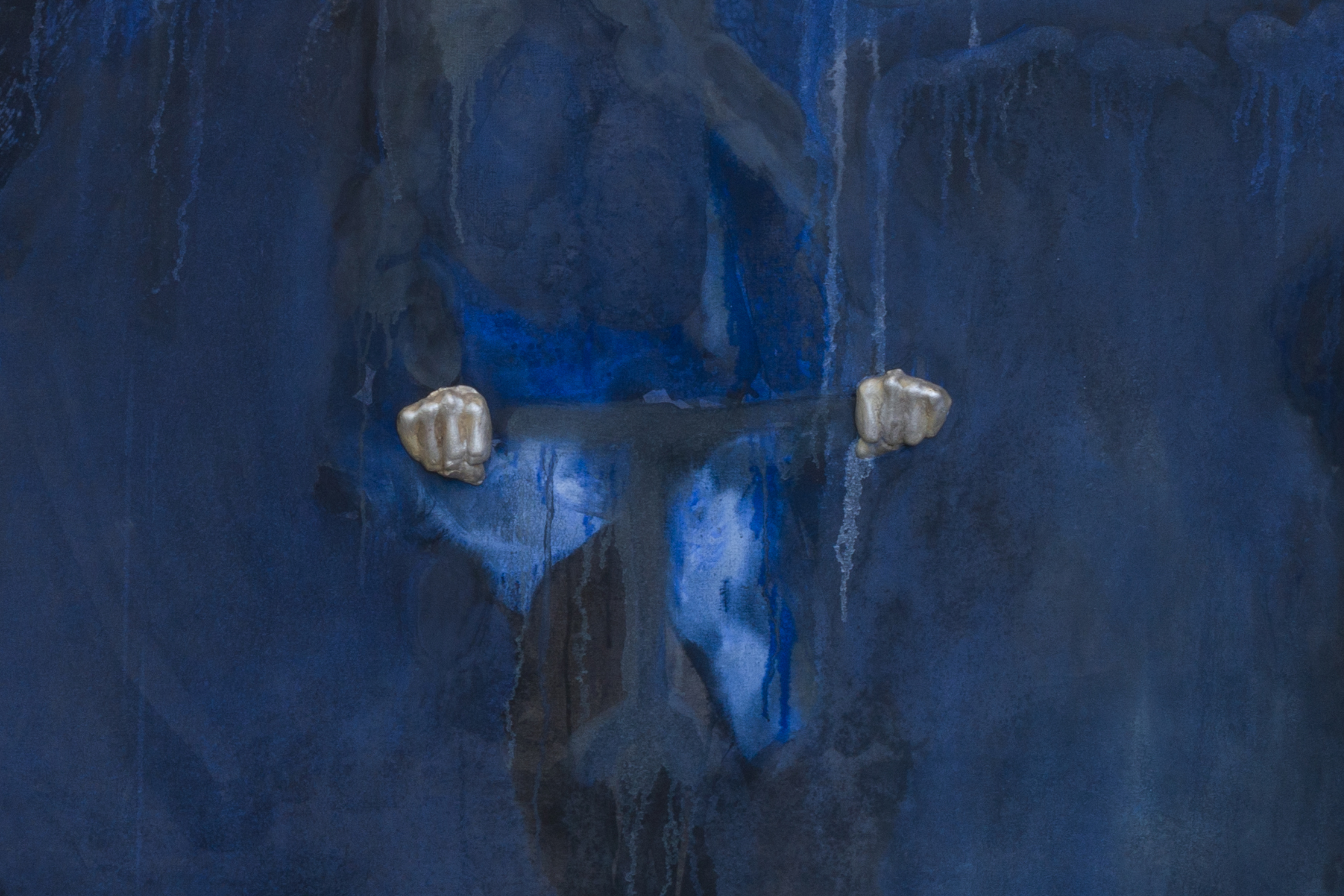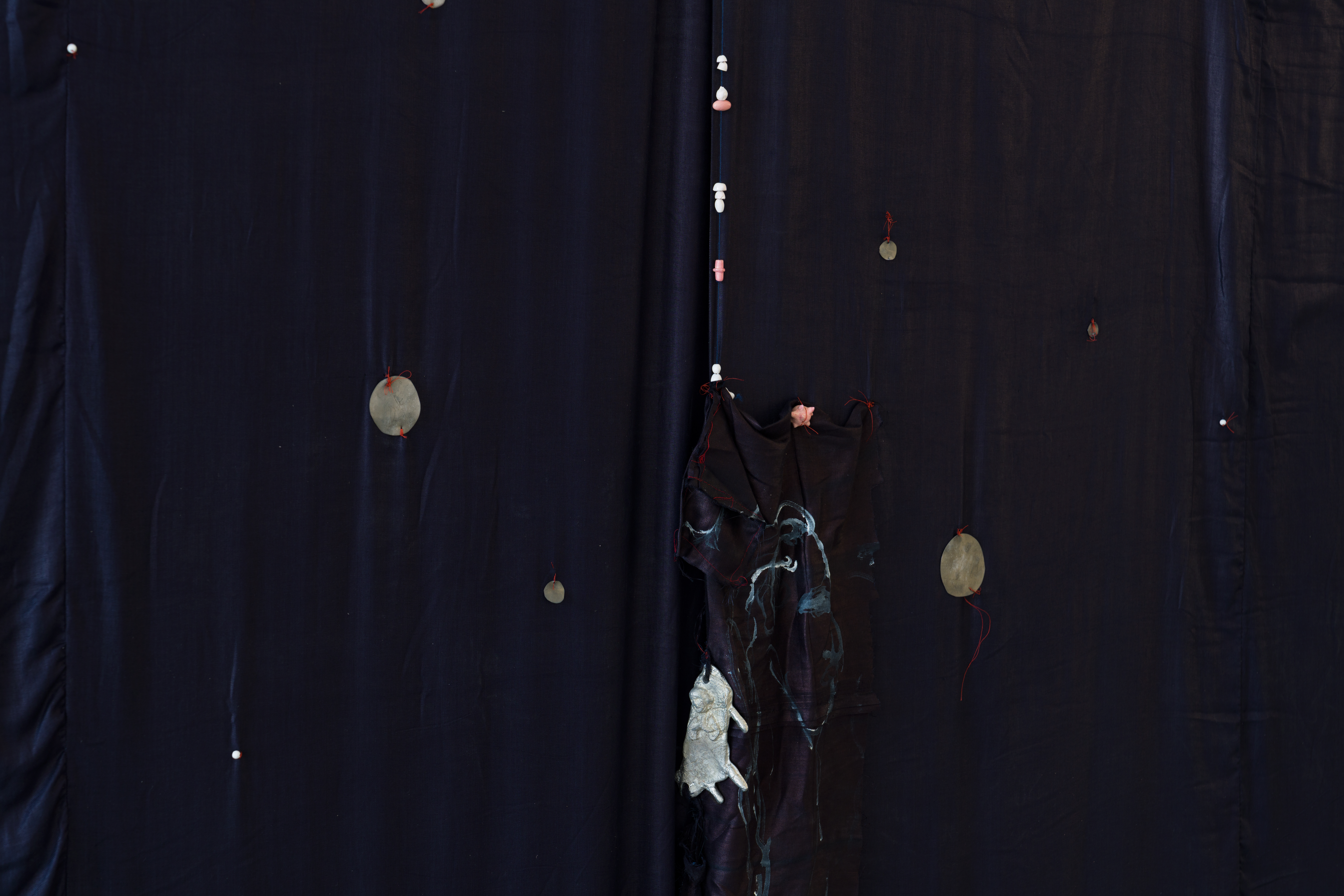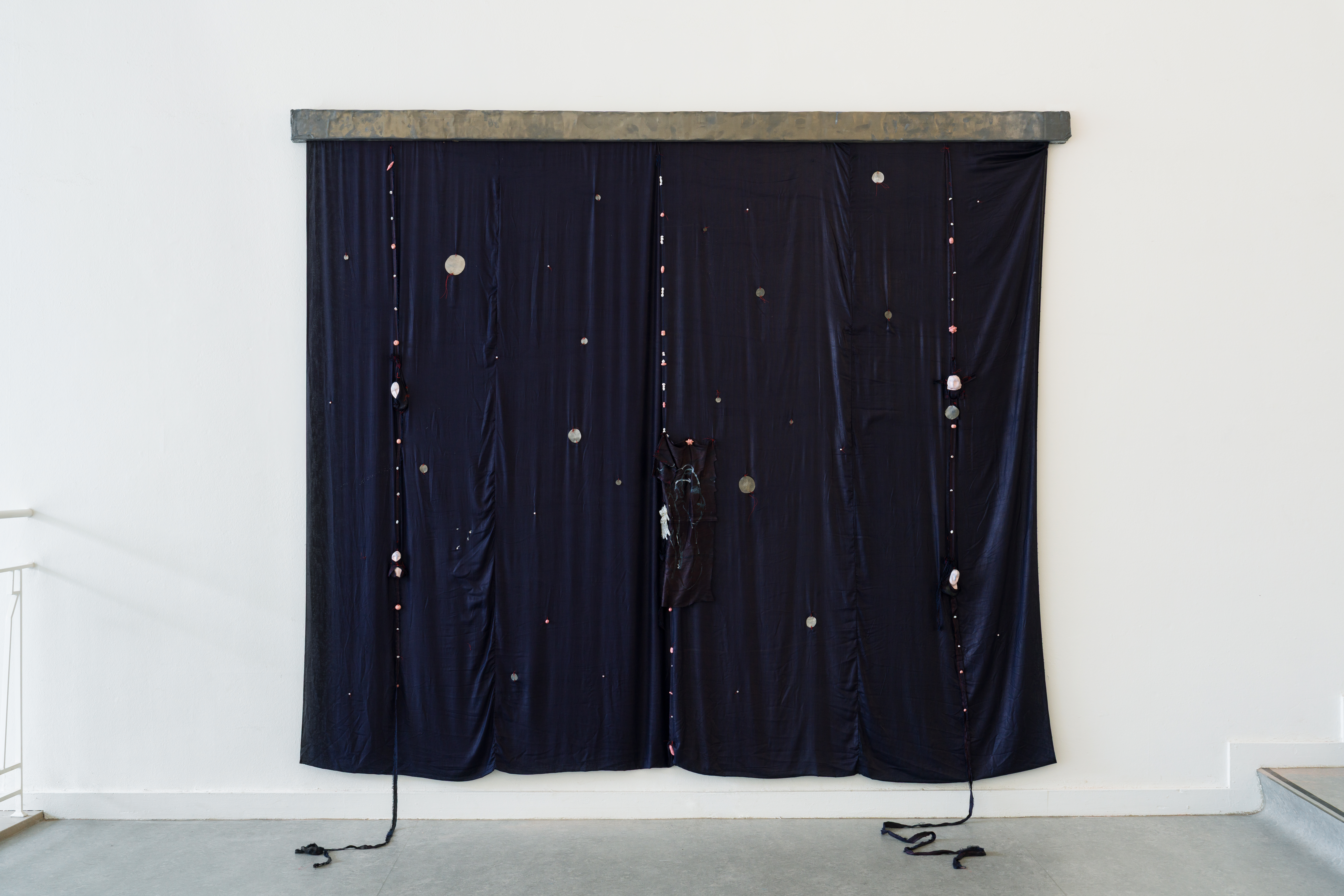 Na met pijn in het hart afscheid te hebben genomen van mijn collega’s in het Bonnefanten – drie jobs tegelijk was onhoudbaar – spendeerde ik een groot deel van het jaar aan de voorbereiding van mijn eerste institutionele solo: Taliswoman in Z33, Hasselt. Ik ben de kleinzoon van een mijnwerker die in de jaren zeventig als “gastarbeider” naar België kwam en de zoon van Marokkaanse ouders afkomstig uit het grensgebied met de Westelijke Sahara. Mijn huidige werk is dan ook nauw verbonden met thema’s zoals arbeid en migratie. Terwijl de officiële geschiedschrijving over de steenkoolmijnen vaak de nadruk legt op hun economische bijdrage, focus ik op het onzichtbare, het mystieke, het intieme. Geïnspireerd door mijn moeder vestigde ik de aandacht op de onderbelichte rol van vrouwen in het mijnverleden van Genk. Een hedendaagse weerslag hiervan kwam ook tot uiting in een collectief werk waarbij een vooral vrouwelijk en queer ledengroepje van The Building in gesprek ging tijdens het boetseren van keramische kralen, die samen met loden schijfjes en andere symbolisch geladen objecten met koraalrode draad op diepblauwe mehlfas werden genaaid. Deze lange stukken stof geïmpregneerd met indigo worden in en rond de Sahara vooral gedragen door oorspronkelijk nomadische bevolkingsgroepen. Naast bescherming tegen de felle zon, is dit kledingstuk ook de uiting van een mobiele maar tegelijk onuitwisbare identiteit.