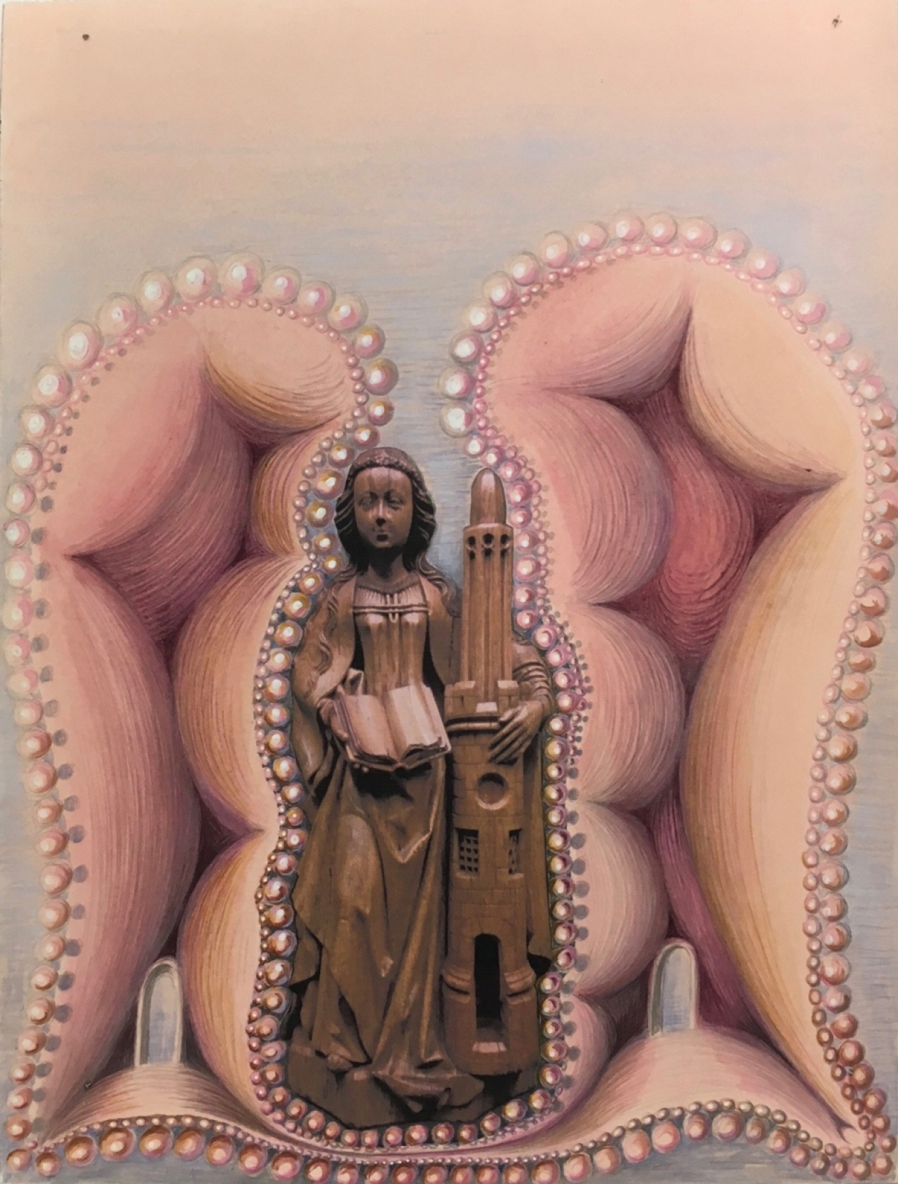 ‘The female hole in history’ en ‘does god have a body’, lees ik wanneer ik inzoom op een werk van Kinke Kooi. De kleine letters zijn met subtiel potlood verwerkt in het schilderij, alsof alleen mensen die zo brutaal zijn en het durven om dichtbij te komen, pas recht hebben op poëtische, maar dubieuze spreuken. Ze worden omlijst door vleeskleurige grotten, waarin zo nauwkeurig diepte verwerkt is, dat mijn blik erin verdwijnt. De wanden van de door parelsnoeren aaneengeregen vagina ogen als een warm en zacht bed op een luie zondagochtend, waarin ik het liefst nog even wil blijven liggen. Het verenigen van het geestelijke en lichamelijke is niet iets dat bij Kooi beperkt wordt tot de voorstelling. Ook in haar werkwijze ligt meditatie en spiritualiteit ten grondslag. Haar werk ontstaat in het moment, zonder eindeloos schetsen vooraf, en dit resulteert in figuratieve beelden die gevoelsmatig aan elkaar worden verbonden door abstracte vlekken en vormen.