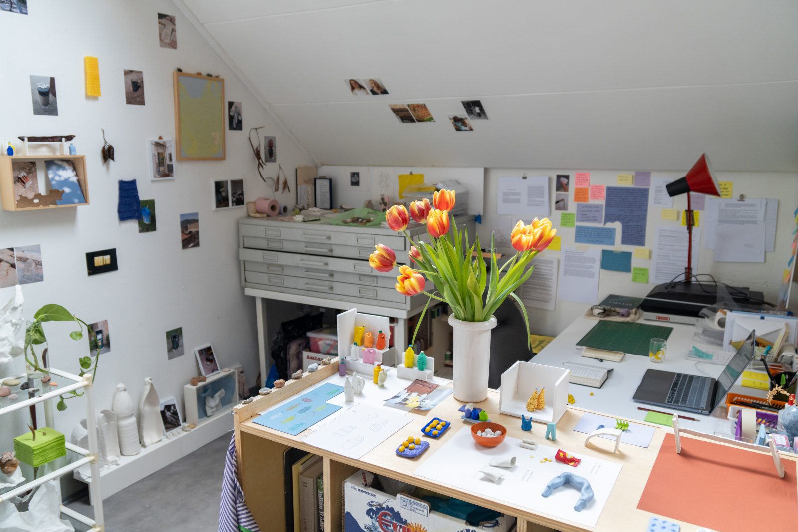 Het atelier van Sarah Rose is een hoekje in een ruimte die ze deelt met twee anderen in een groot voormalig schoolgebouw in de Drievriendenstraat in Rotterdam. Door die ruimtelijke beperking heeft haar werk een speciale intimiteit. Ze zit te midden van haar foto’s van publieke vuilnisbakken en opgestapelde stoelen, beschreven post-its en vellen papier, zelfgemaakte sculptuurtjes in droogklei van plastic tasjes en voorwerpen zoals takjes en stenen die op een geconcentreerde manier haar kijk op het bestaan samenvatten. Het verlangen om zich in een grotere maatvoering uit te drukken heeft geleid tot het maken van performances en films.