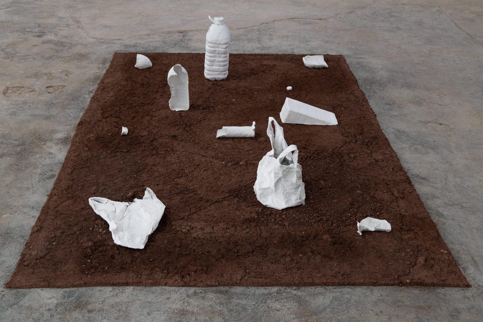 ‘Er zijn dingen in de wereld die je opvallen omdat je ergens een buitenstaander bent. In Blanca zag ik dat tussen de straat en het trottoir veel slordig gemetselde mini-opritjes waren gemaakt. Zo konden boodschappenkarretjes makkelijker de stoep worden opgetrokken. Voor de gebruikers is dat een vanzelfsprekendheid, maar ik als nieuwkomer zie er een vorm van eigentijdse archeologie in die ik vastleg. Ik heb dat ook met uiteenlopende voorwerpen die te maken hebben met wat we zien als afval, zoals verschillende vormen van verpakking: plastic tasjes, fruitnetjes, gebruikte servetjes. Het heeft natuurlijk te maken met de problematiek van onze omgang met vuilnis, maar voor mij zijn die voorwerpen een mogelijkheid om er beeldende, visuele vertalingen van te maken die een verlengde zijn van mezelf, zonder dat het meteen over mijzelf gaat. Ik heb een fascinatie voor voorwerpen met een tijdelijke functie. Na gebruik wordt het als restmateriaal beschouwd. In mijn werk kies ik voor een vorm van concentratie en vertraging in het observeren daarvan om een andere betekenis te veroorzaken.‘