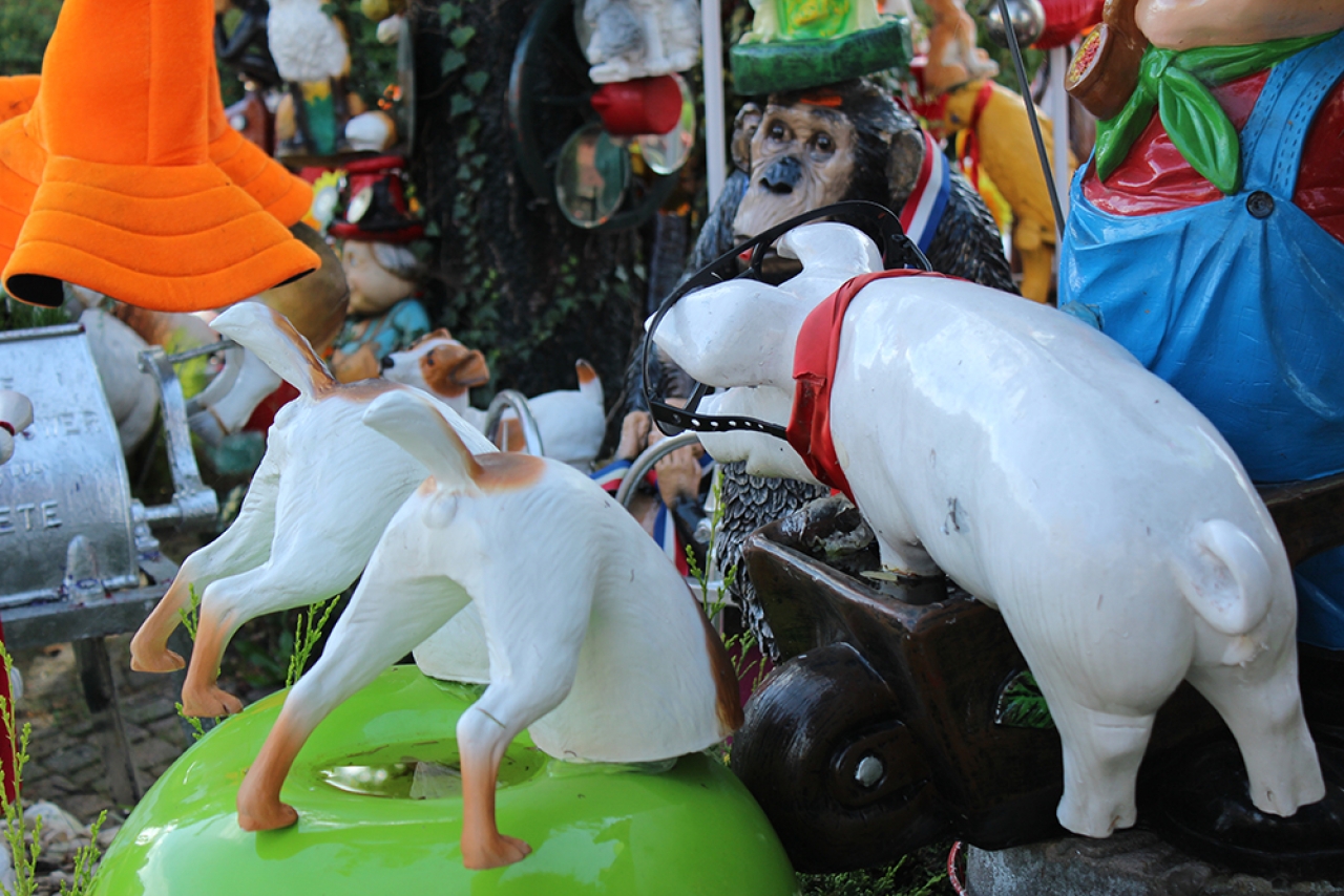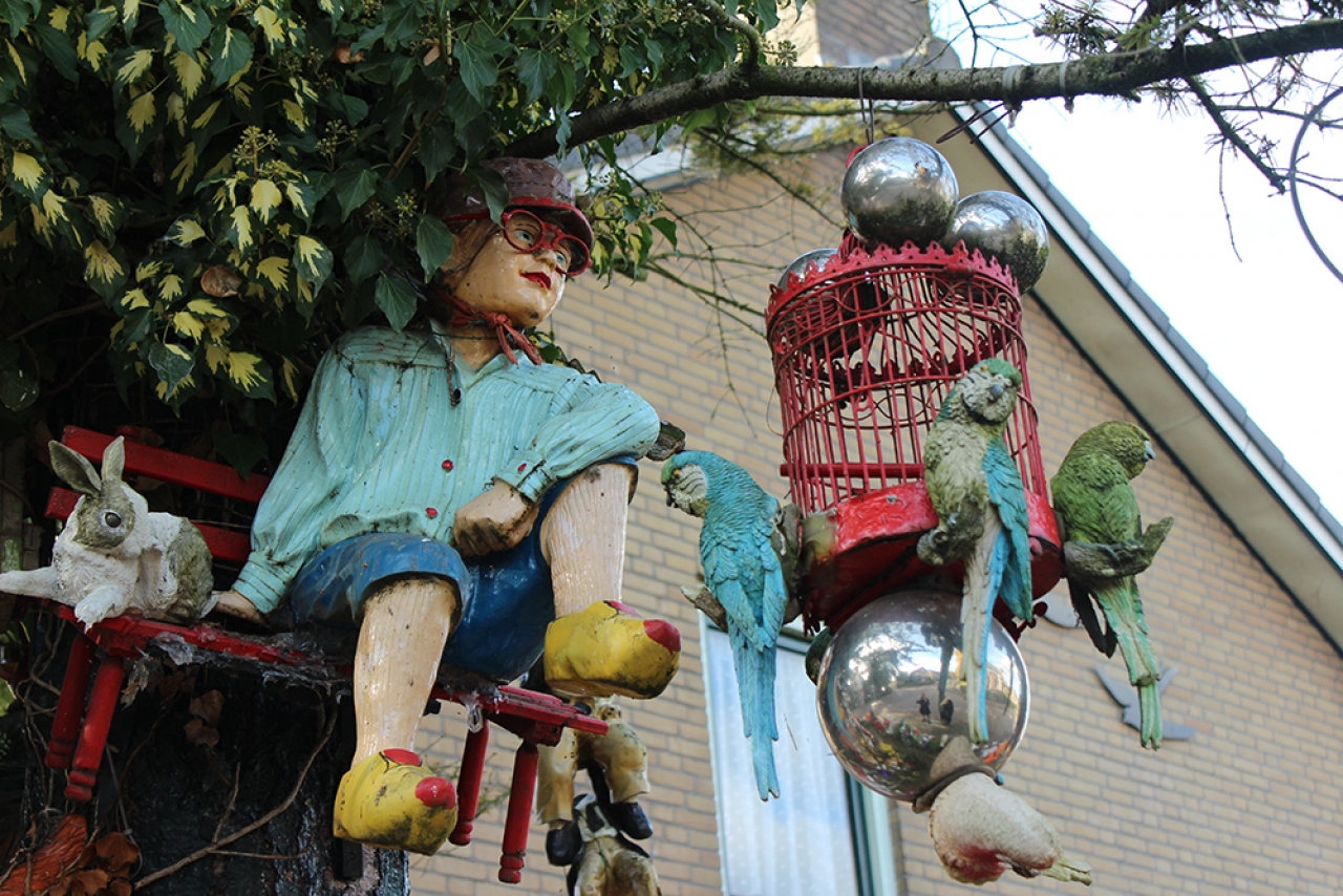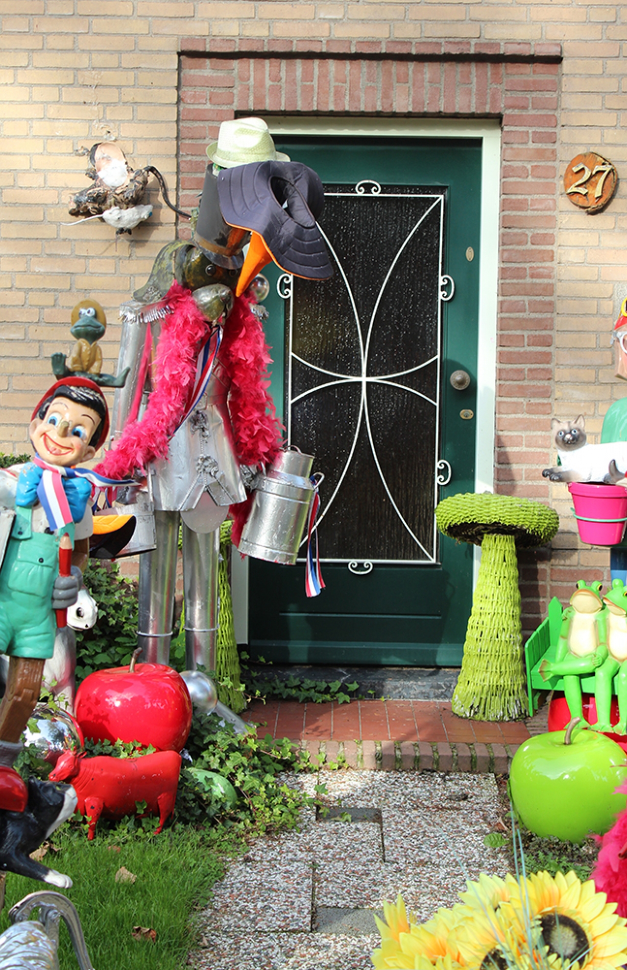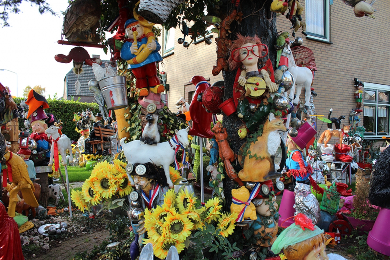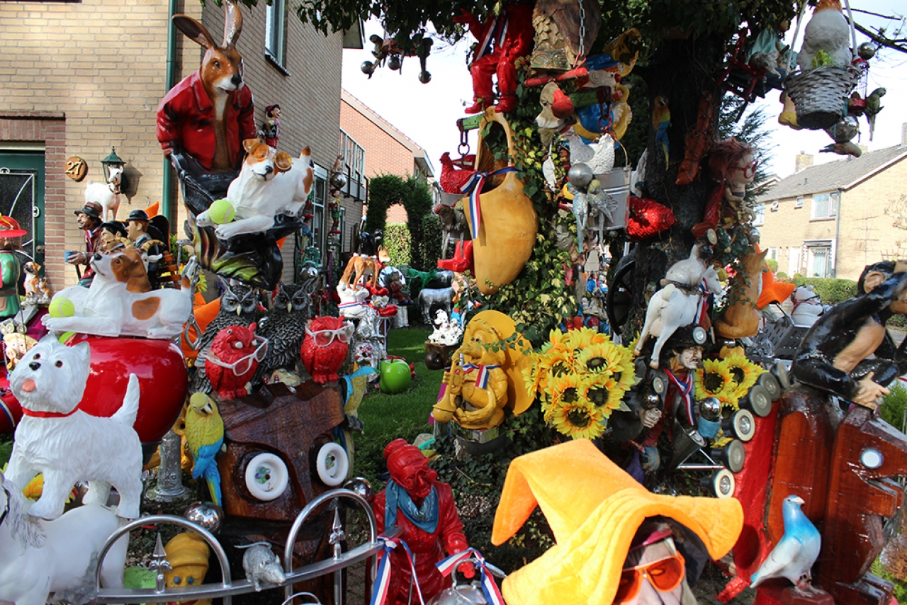 In een klein boerengat in Gelderland heeft een doodgewone dorpstuin zich op bijzondere wijze gevuld met wel 100 beelden. Wat op het eerste gezicht een bonte oase aan carnavalssculpturen lijkt te zijn, blijkt bij naderinzien een tuin vol parels. In een knalroze kruiwagen ligt een wel heel relaxed ogende dikke big, op zijn hoofd heeft zich een zwarte kat genesteld die wordt bereden door een gans. De gans draagt een lichtblauwe zonnebril beplakt met glitters en diamanten, een nietsvermoedende kikker op de snavel van het gevogelte maakt de sculptuur af. De veelvoud, chaos en opstapeling die de tuin betreft zorgen ervoor dat je ogen niet van het tafereel weg kunnen kijken. Uit een struik komt een hoofdje gepiept alsof zich daar al jaren een man verstopt heeft en deze langzaam op organische wijze in de natuur opgenomen is. Dieren, laarsjes, spiegels en masker, in deze tuin vangt je blik om de minuut iets nieuws.