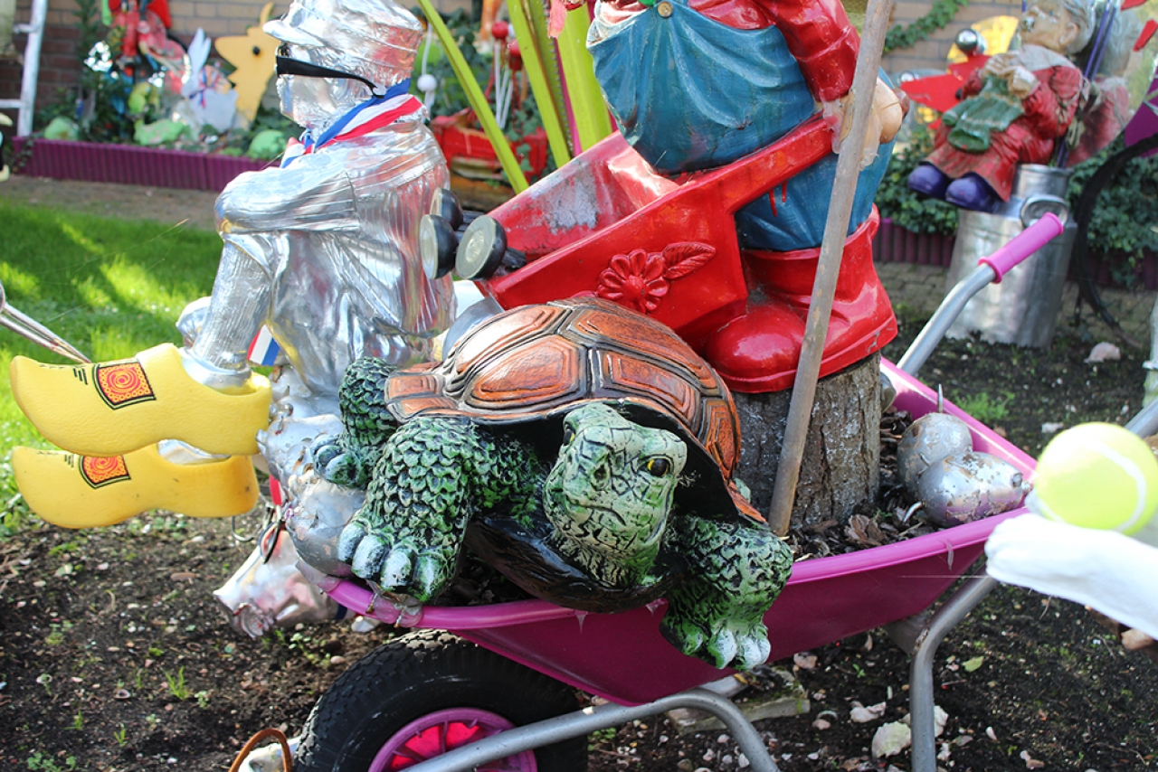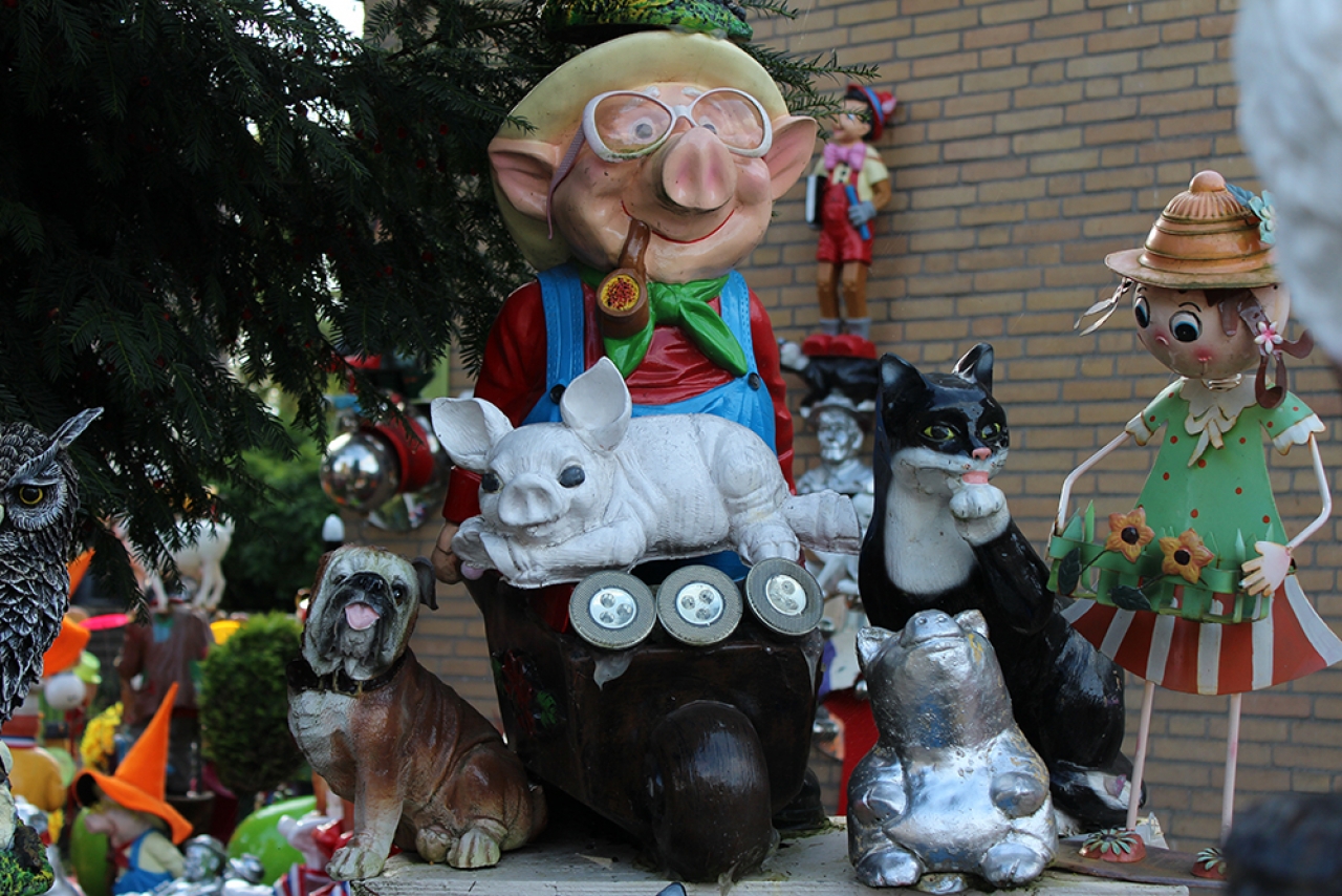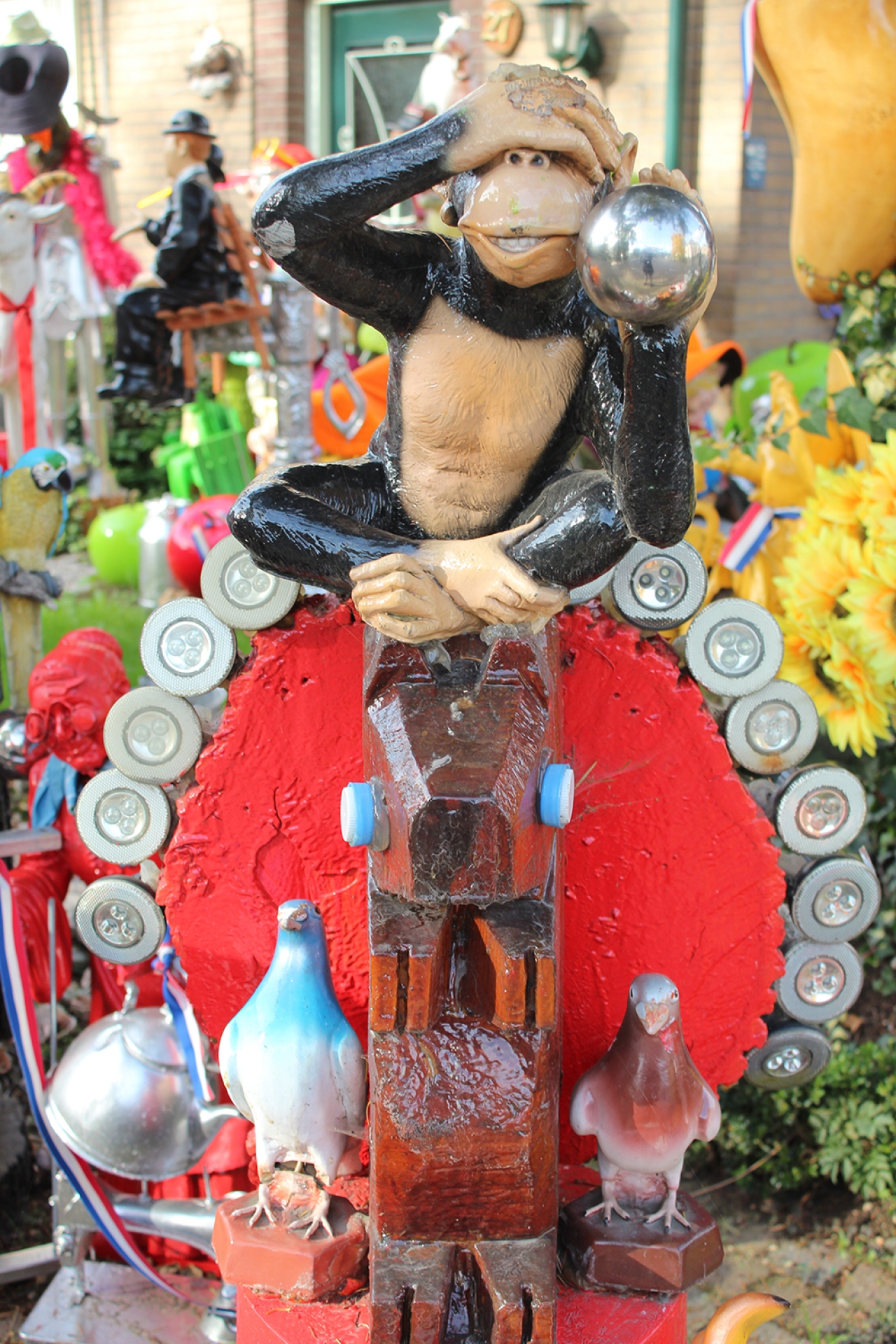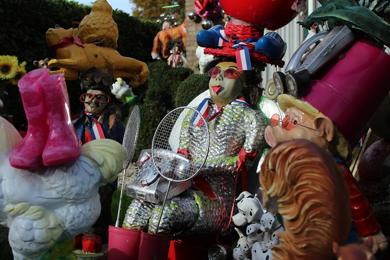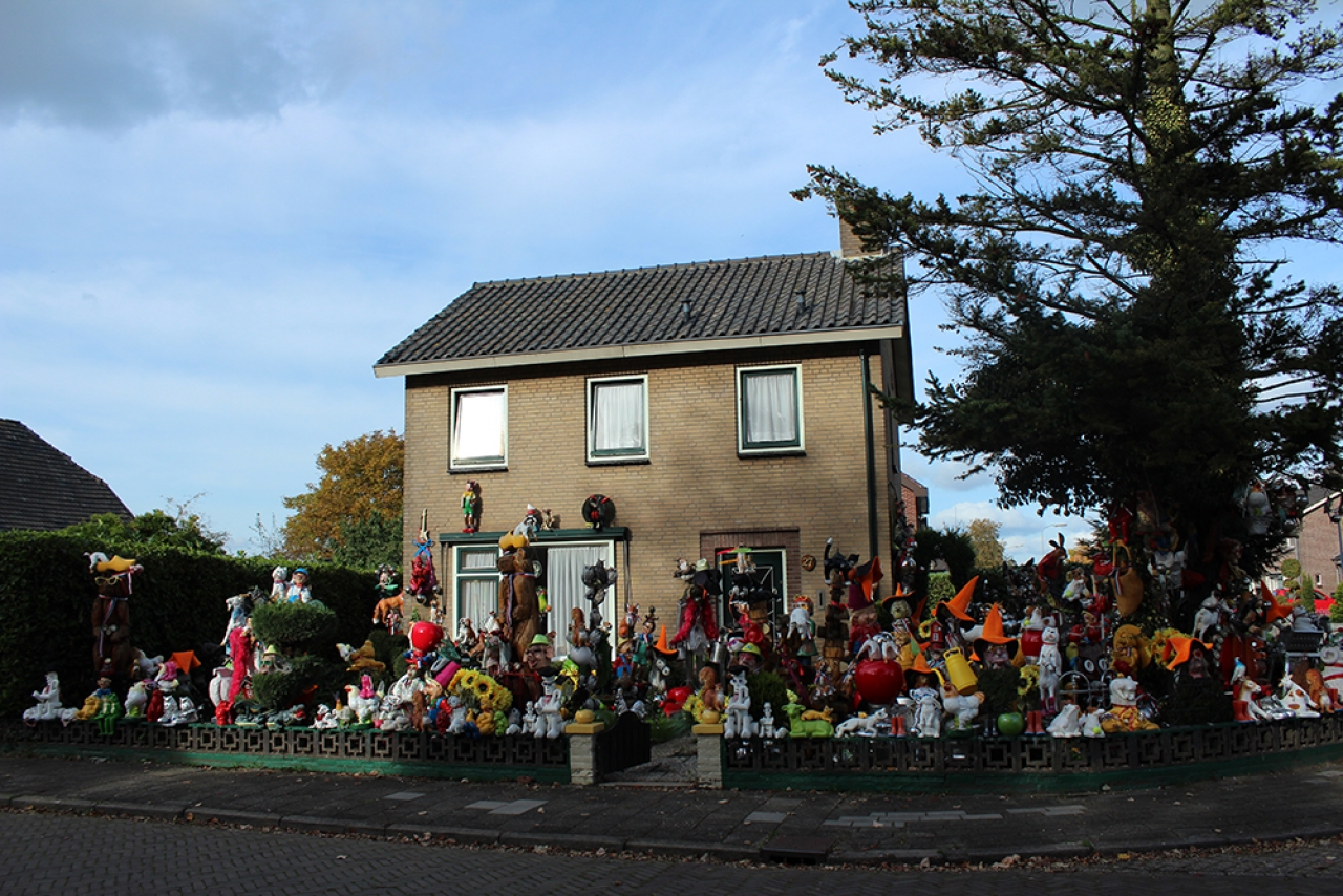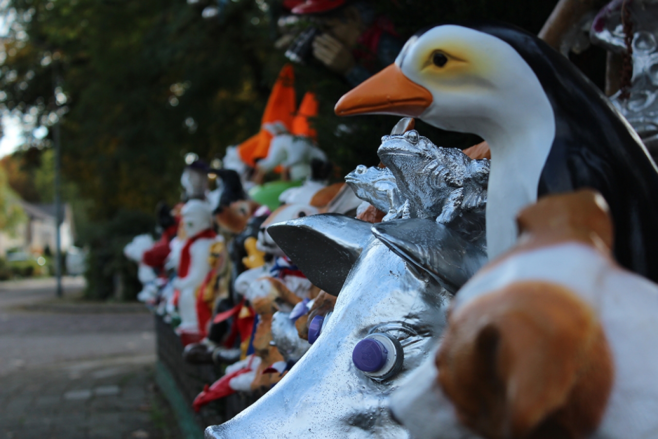 In een klein boerengat in Gelderland heeft een doodgewone dorpstuin zich op bijzondere wijze gevuld met wel 100 beelden. Wat op het eerste gezicht een bonte oase aan carnavalssculpturen lijkt te zijn, blijkt bij naderinzien een tuin vol parels. In een knalroze kruiwagen ligt een wel heel relaxed ogende dikke big, op zijn hoofd heeft zich een zwarte kat genesteld die wordt bereden door een gans. De gans draagt een lichtblauwe zonnebril beplakt met glitters en diamanten, een nietsvermoedende kikker op de snavel van het gevogelte maakt de sculptuur af. De veelvoud, chaos en opstapeling die de tuin betreft zorgen ervoor dat je ogen niet van het tafereel weg kunnen kijken. Uit een struik komt een hoofdje gepiept alsof zich daar al jaren een man verstopt heeft en deze langzaam op organische wijze in de natuur opgenomen is. Dieren, laarsjes, spiegels en masker, in deze tuin vangt je blik om de minuut iets nieuws.