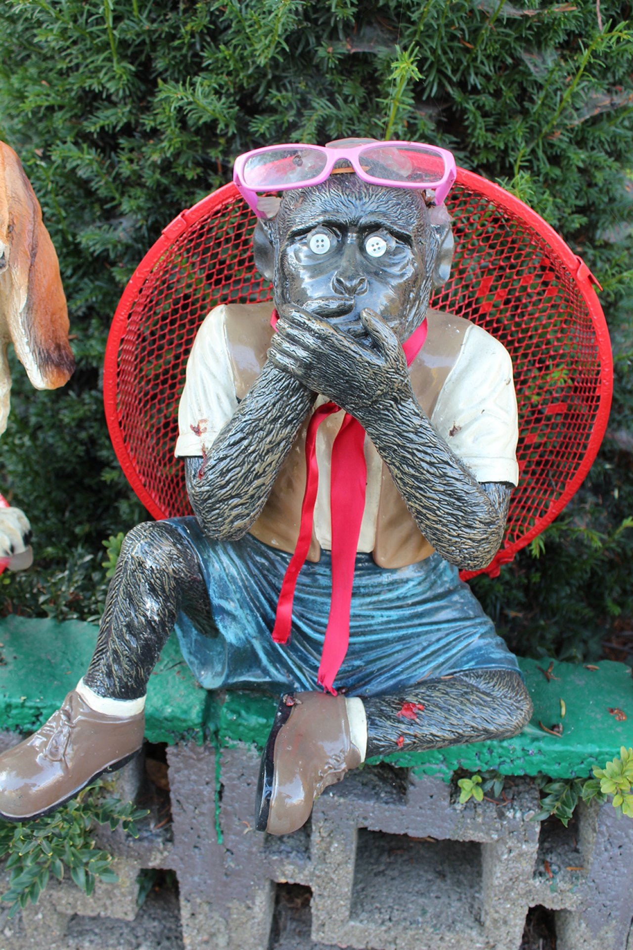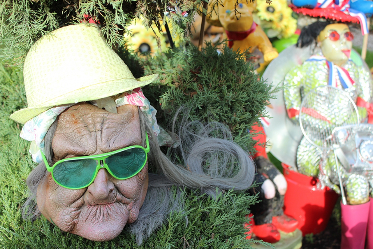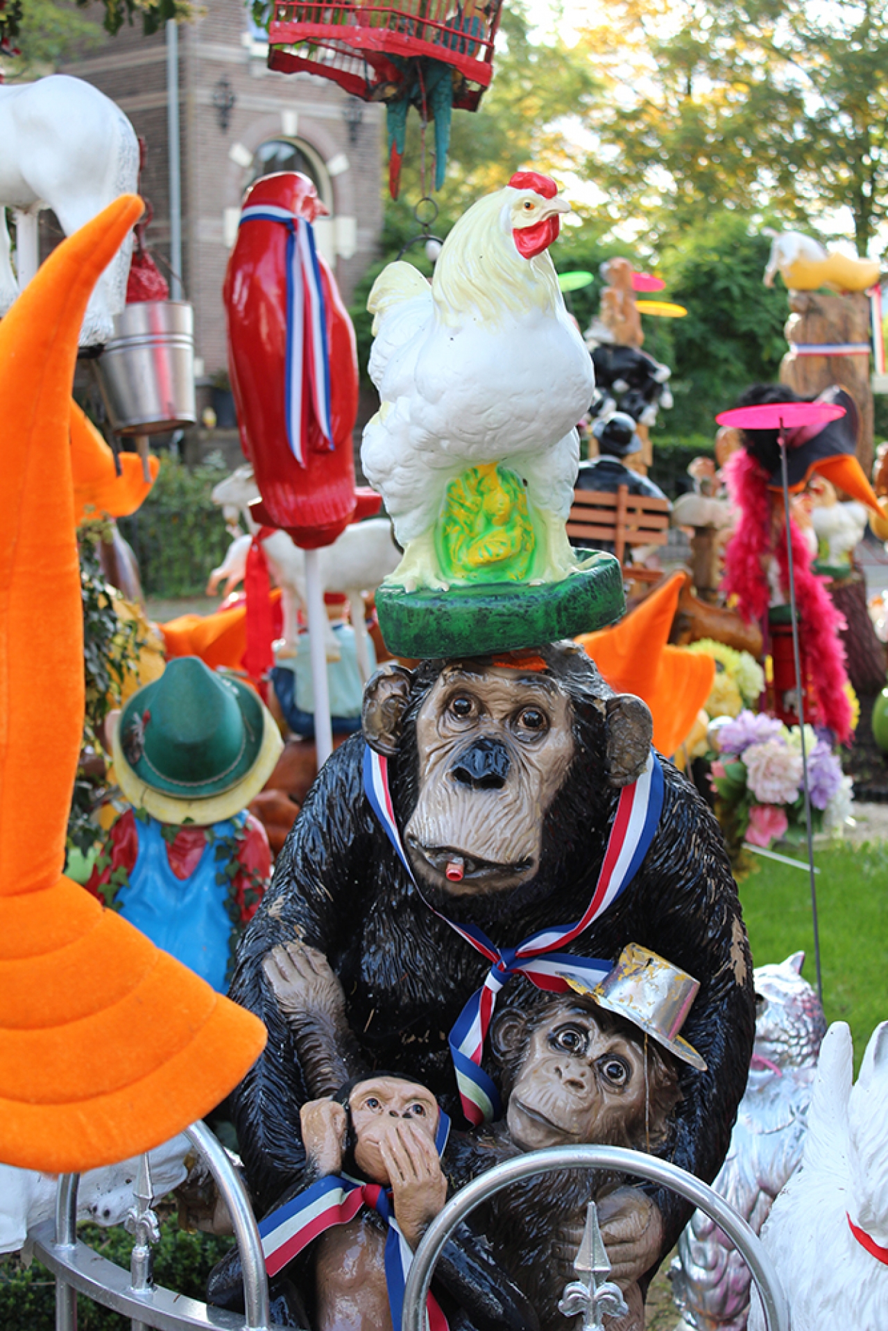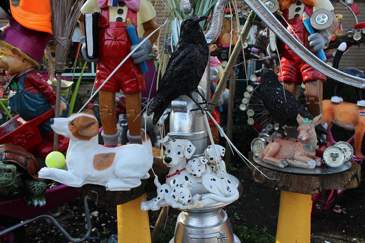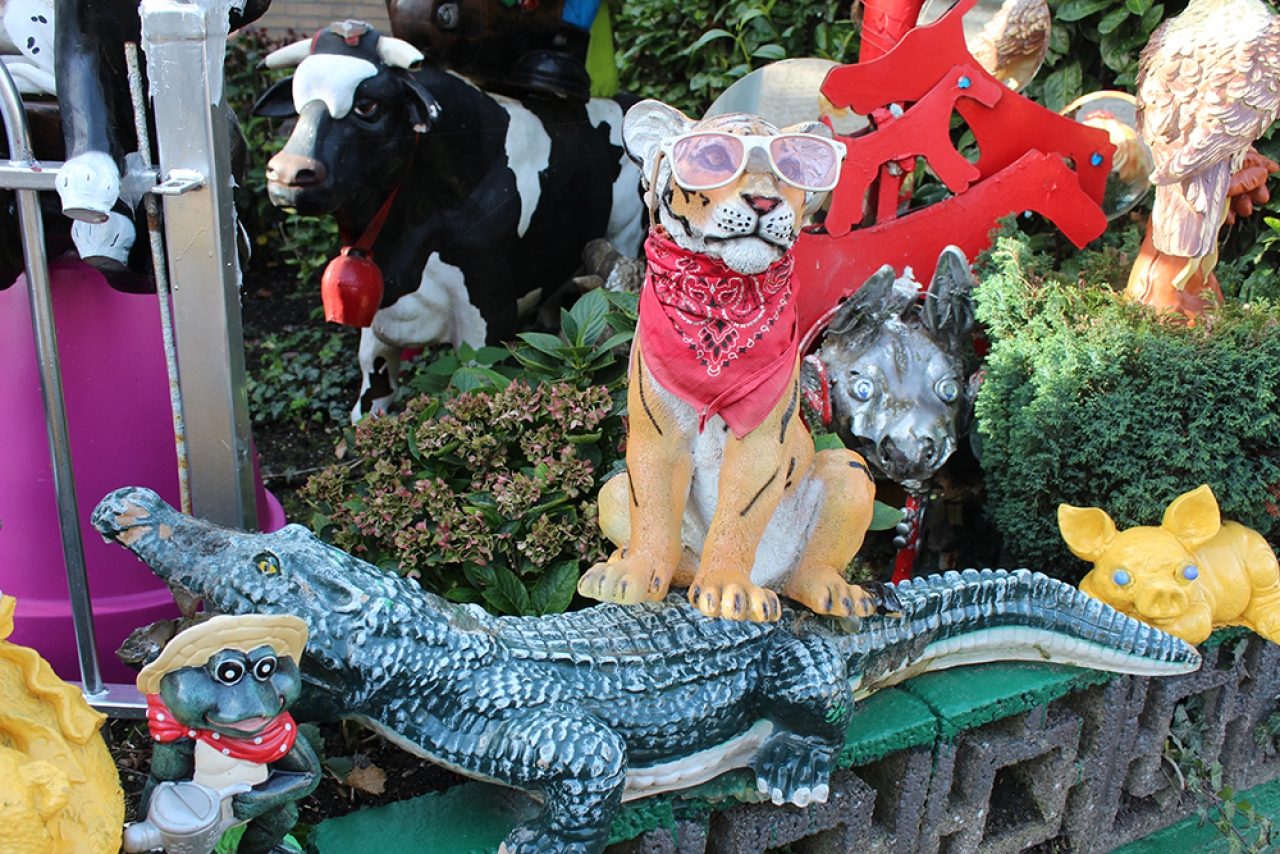 In een klein boerengat in Gelderland heeft een doodgewone dorpstuin zich op bijzondere wijze gevuld met wel 100 beelden. Wat op het eerste gezicht een bonte oase aan carnavalssculpturen lijkt te zijn, blijkt bij naderinzien een tuin vol parels. In een knalroze kruiwagen ligt een wel heel relaxed ogende dikke big, op zijn hoofd heeft zich een zwarte kat genesteld die wordt bereden door een gans. De gans draagt een lichtblauwe zonnebril beplakt met glitters en diamanten, een nietsvermoedende kikker op de snavel van het gevogelte maakt de sculptuur af. De veelvoud, chaos en opstapeling die de tuin betreft zorgen ervoor dat je ogen niet van het tafereel weg kunnen kijken. Uit een struik komt een hoofdje gepiept alsof zich daar al jaren een man verstopt heeft en deze langzaam op organische wijze in de natuur opgenomen is. Dieren, laarsjes, spiegels en masker, in deze tuin vangt je blik om de minuut iets nieuws.