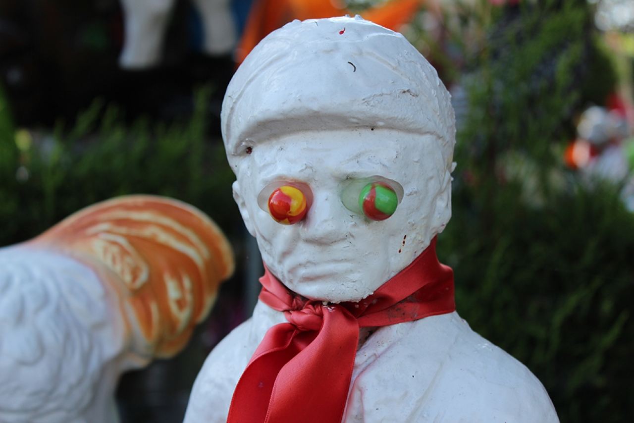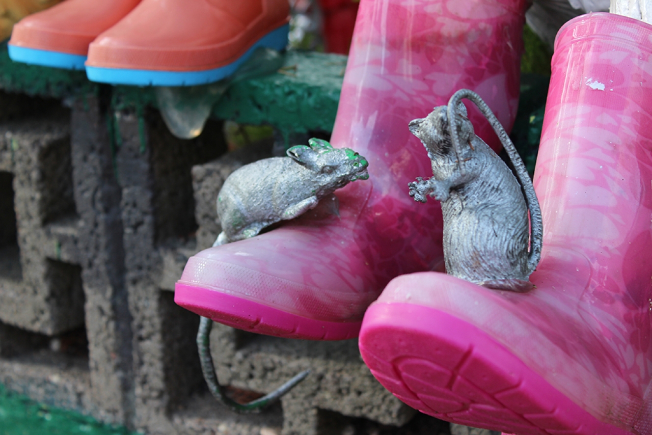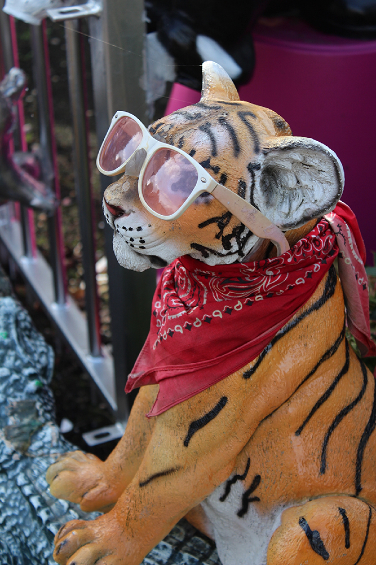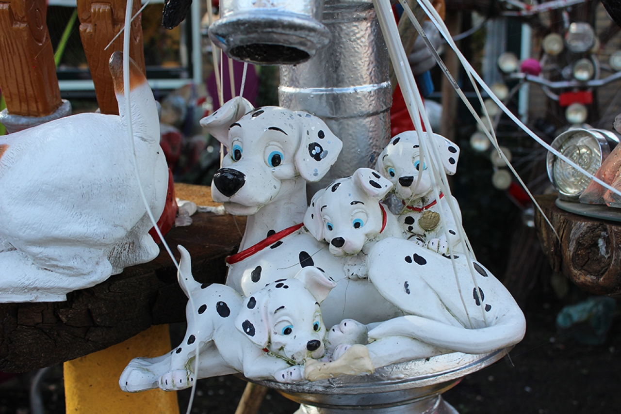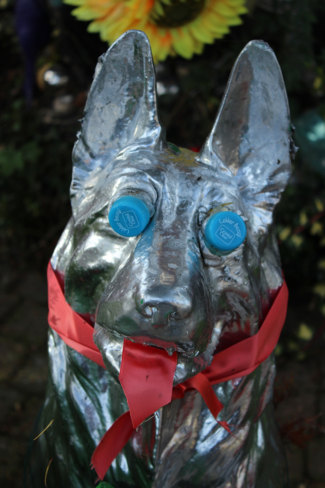 In een klein boerengat in Gelderland heeft een doodgewone dorpstuin zich op bijzondere wijze gevuld met wel 100 beelden. Wat op het eerste gezicht een bonte oase aan carnavalssculpturen lijkt te zijn, blijkt bij naderinzien een tuin vol parels. In een knalroze kruiwagen ligt een wel heel relaxed ogende dikke big, op zijn hoofd heeft zich een zwarte kat genesteld die wordt bereden door een gans. De gans draagt een lichtblauwe zonnebril beplakt met glitters en diamanten, een nietsvermoedende kikker op de snavel van het gevogelte maakt de sculptuur af. De veelvoud, chaos en opstapeling die de tuin betreft zorgen ervoor dat je ogen niet van het tafereel weg kunnen kijken. Uit een struik komt een hoofdje gepiept alsof zich daar al jaren een man verstopt heeft en deze langzaam op organische wijze in de natuur opgenomen is. Dieren, laarsjes, spiegels en masker, in deze tuin vangt je blik om de minuut iets nieuws.
