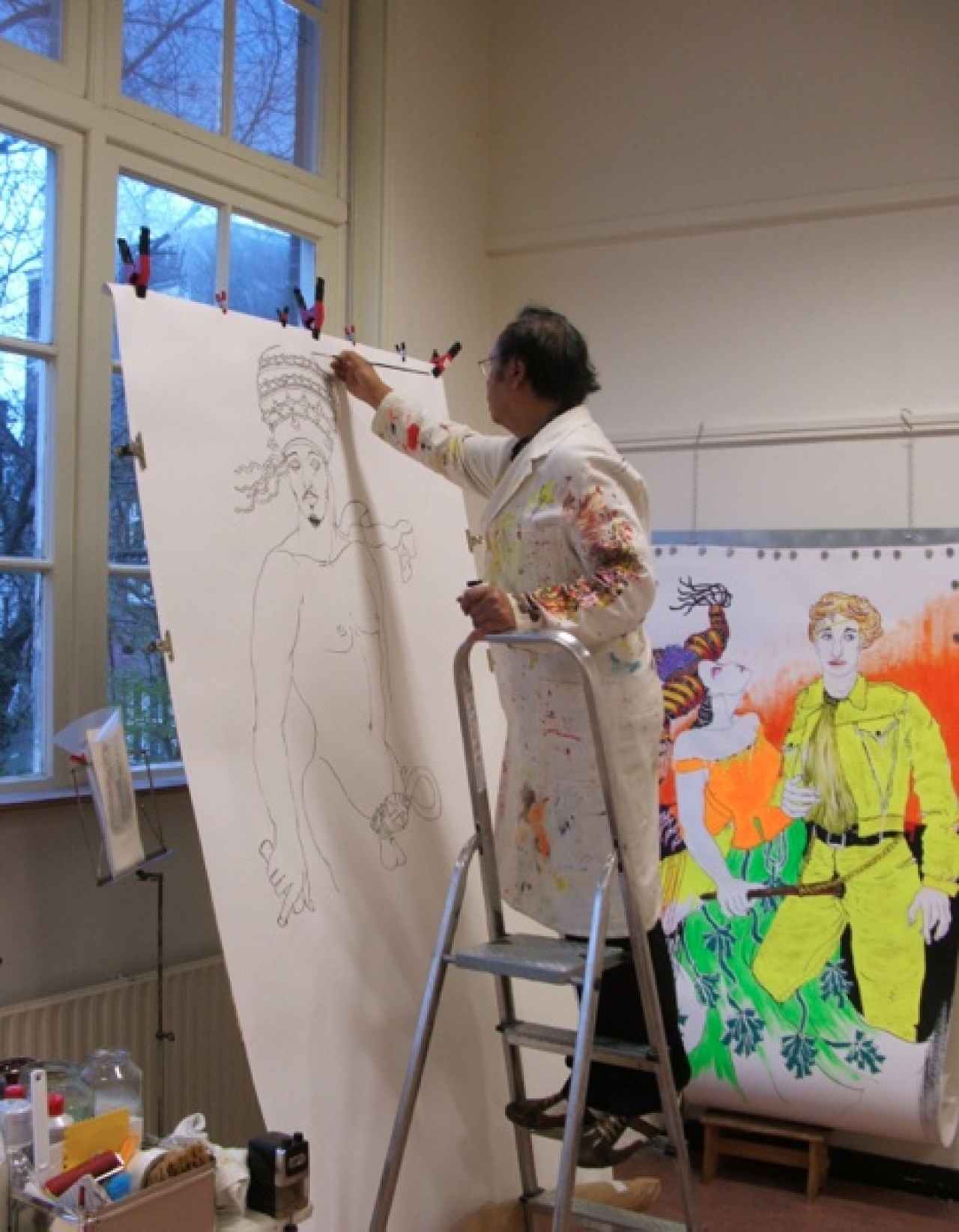 In het verleden onrwierp Alexander prachtige barokke couture jurken en vervolgens schilderde hijop grote vellen papier, met fijne zwierige lijnen en in fluorescerende kleuren vertaalde hij zijn engagement naar een vreemde mix van elegantie, uitbundigheid, seks en mode in series als ‘Sinners like Pope and cardinals’. De zonde, ja de zonde.
