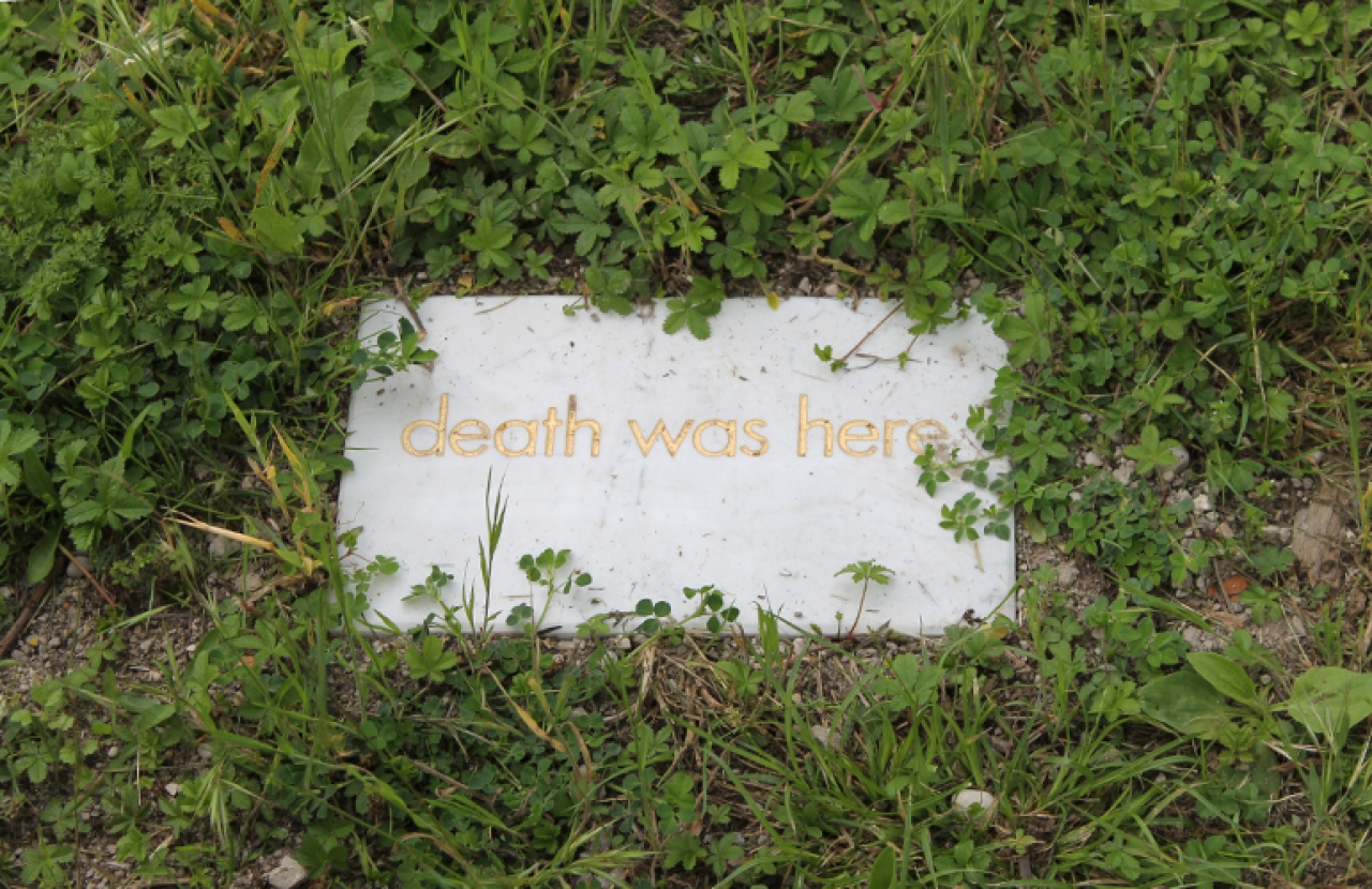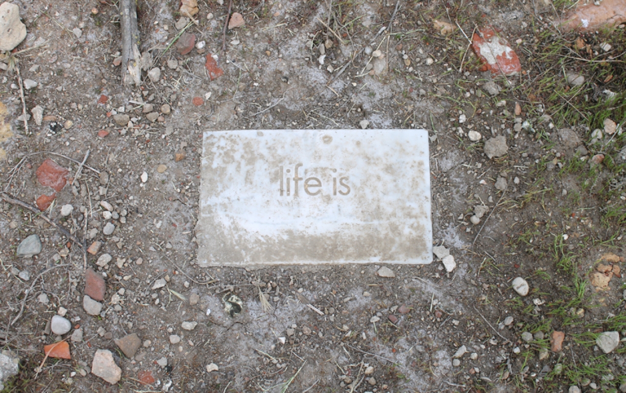 Met herman voorop struinen we het eiland af. Af en toe maakt hij een vreugdedansje voor de perscamera’s of plukt hij iets uit de grond. De kunstenaar heeft de natuur op het eiland een aantal kleine witte stenen geschonken met gouden tekst daar ingelegd. Hij noemt de stenen bescheiden, een plant zou makkelijk over de steen heen kunnen groeien. De tekst op de steen heeft veelal met zijn zienswijze te maken, maar ook met de historie van de plek. Een deel van het eiland was een massagraf ten tijde van het ziekenhuis. De kunstenaar gebruikt om die reden de teksten: ‘death was here’ en ‘life is’. Een andere uitspraak is de wijze uitspraak: ‘be aware’. Zet je zintuigen aan het werk, of zoals de vries zegt: ‘Zijt gewaar. Als je om je heen kijkt, dan is er meer te zien dan mijn tekst.’