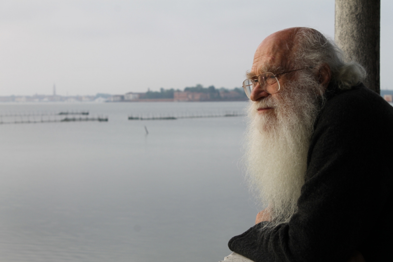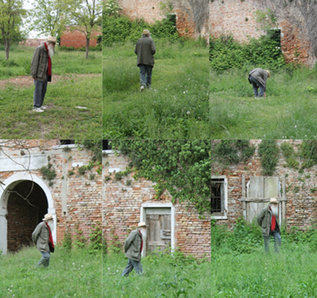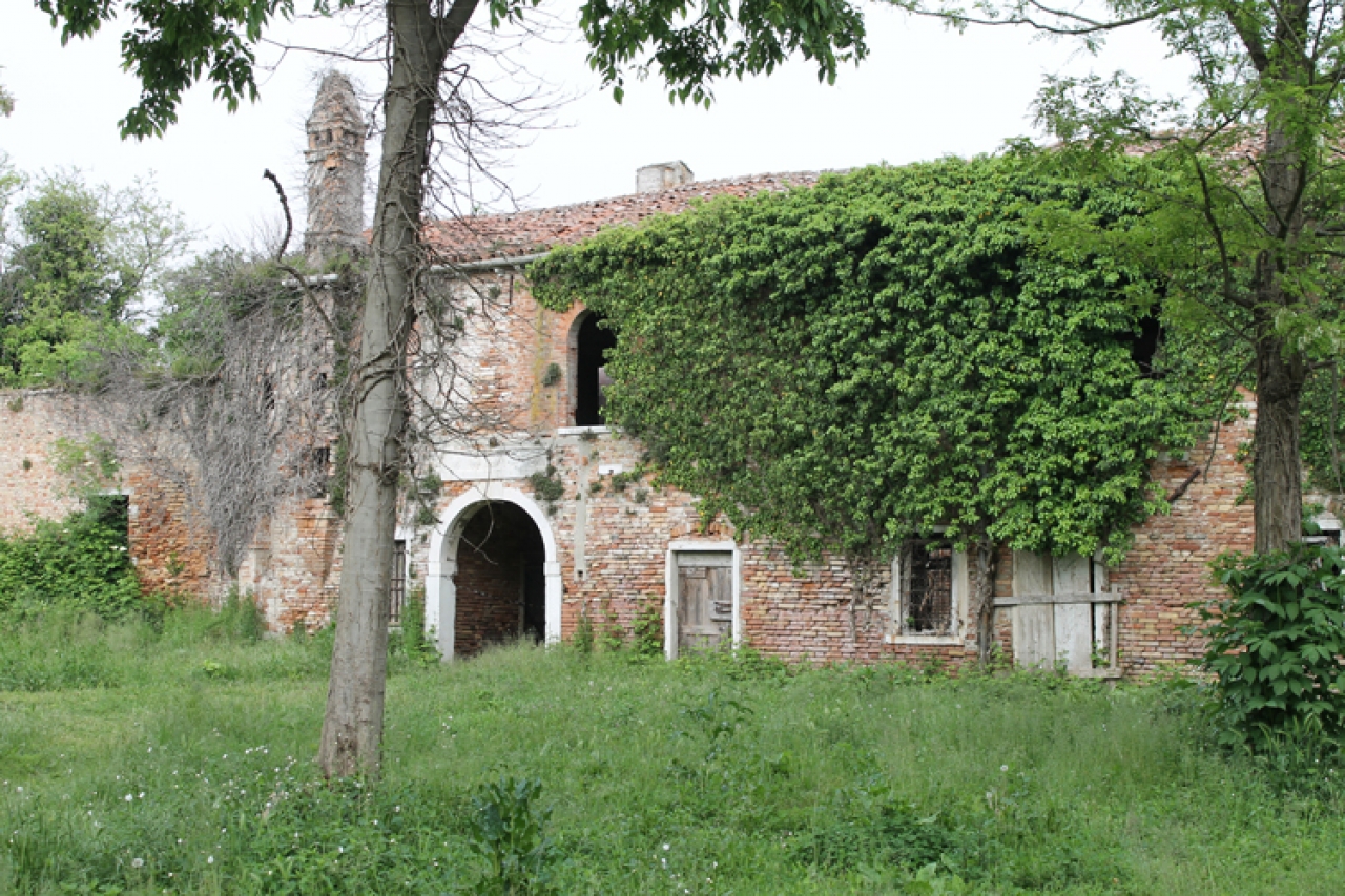 De zon is ingepakt in grote grijze mist, die een mysterieuze invloed heeft op de eilanden. In een blauwe boot varen we over het klotsende groenblauwe water rondom Venetië naar het eilandje Lazzaretto Vecchio, waar herman de vries al afgelopen winter twee keer een bezoek aan bracht. Het eiland is omringd met een muur. Vroeger, rond 1423, was het eiland een quarantaine ziekenhuis voor mensen met de pest. Het ziekenhuis is nu een ruïne, enkele delen zijn gerestaureerd en de natuur erom heen licht verwilderd. de vries verzamelde hier materiaal voor nieuw werk in het paviljoen en gaf ook toevoeging aan het eiland zelf.