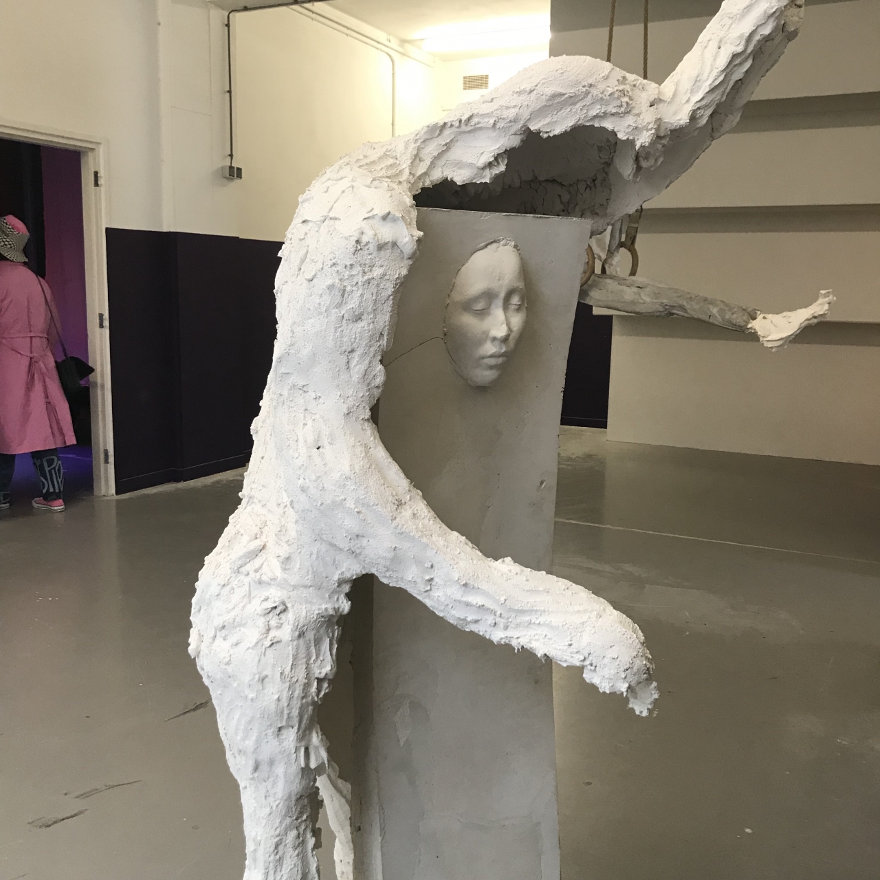In deze sculptuur lijkt een figuur vast te zitten die een afdruk van zijn gezicht in het gips wilde achterlaten. Zahar Bondar creeërde voor zijn afstudeerwerk een aantal sculpturen binnen een totaalinstallatie, die refereren naar zijn achtergrond in het circus. De figuren balanceren sierlijk in de ruimte, terwijl ze uit rauwe materialen zoals beton, metaal en gips vervaardigd zijn.