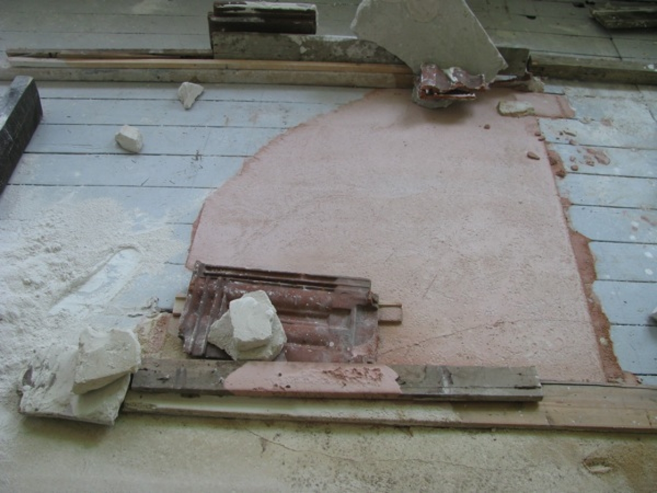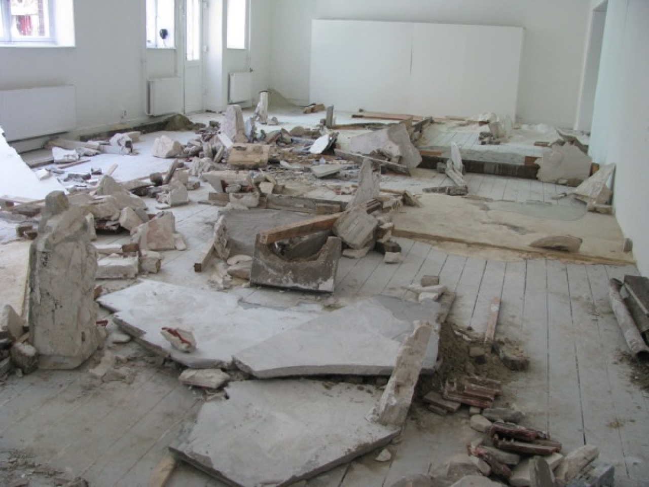 Opvallend is dat Maastricht ieder jaar wel een beeldende kunstenaar heeft die een ruimte geheel met een materiaal heeft bedekt of ingevuld. Meestal zijn het installaties zonder enige vorm van figuratie, het is vooral het materiaal zelf dat spreekt. Vorig jaar was een grote zaal nog gevuld met allerlei gipsen vormen in lieflijke pasteltinten. Dit jaar had Gladys Zeevaarders eveneens met gips gewerkt maar ook met beton, en bouwmaterialen als bakstenen, dakpannen, metalen pijpen, zand. Haar ruimte had vooral een rauw en rommelig karakter alsof hier puin was neergestort. Maar als je goed keek, zag je dat er zorgvuldig her en der stapelingen gemaakt waren en (letterlijk, dus niet figuurlijk) laag-bij-de-vloerse kamertjes gebouwd waren waarbij een laag gips tussen bouwmateriaal uitgestort was.