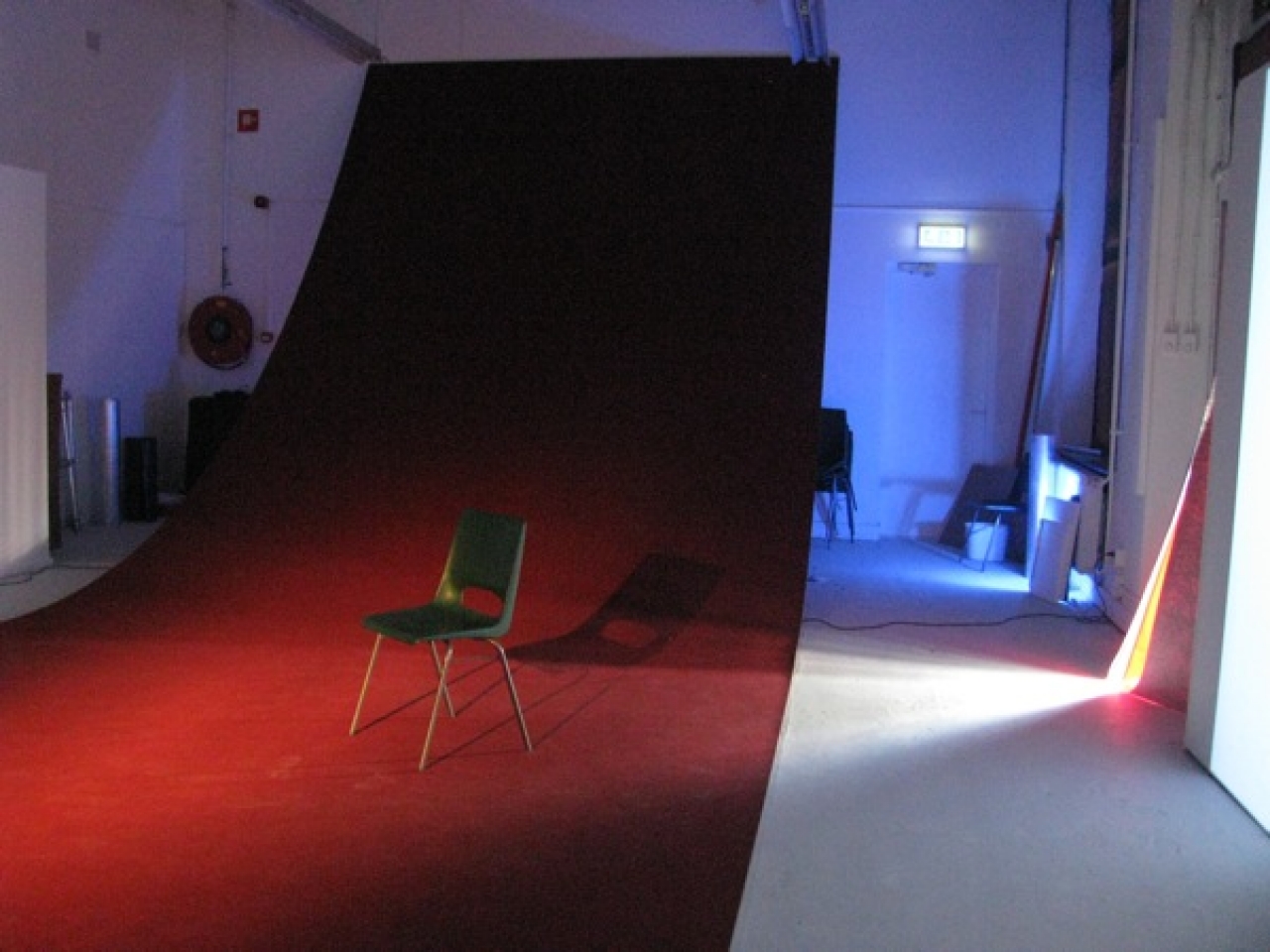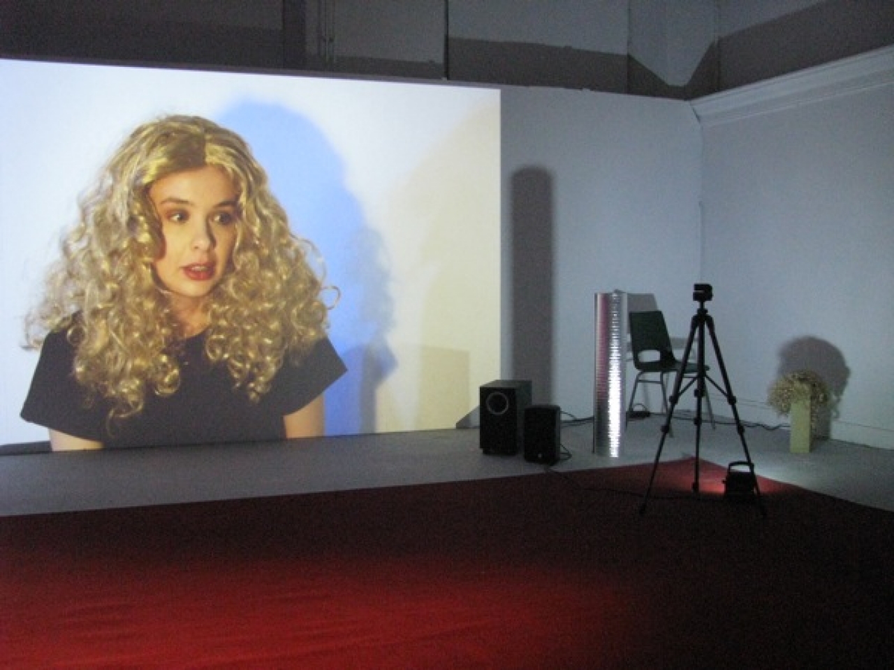 Kim Reijntjens had een grote ruimte geheel in beslag genomen voor het vertonen van een videowerk. Er was geluid maar het hoorde niet echt bij de getoonde videobeelden. Te horen was een man die in het Engels strenge opdrachten gaf aan een ander, zoals sta op, ga in het licht staan, maak je gezicht schoon, sneller, sneller! Verder was de gehele ruimte gevuld met een groot rood tapijt dat vanaf het plafond tot op de grond was uitgerold. Daar stond een stoel theatraal uitgelicht door een lamp. Uiteindelijk bleek dat alle los getoonde en te horen onderdelen in de ruimte, tezamen een installatie vormden. Achter en onder het tapijt stonden de props die gebruikt waren voor het videowerk dat bij het geluid hoorde en dat daar te zien was op een kleine monitor. De beelden van een actrice die de instructies van een regisseur opvolgt hier, en het geluid verderop in de ruimte liepen niet synchroon, maar dat was juist de bedoeling. Het geluidswerk was nl juist bij een andere video te horen waarop een jonge vrouw een blonde pruik opdoet en acteert dat zij een naieve jonge vrouw is die een waar gebeurd verhaal vertelt. Het begint vrolijk, maar eindigt melancholisch. Alle fragmenten tezamen in de ruimte vormden een intrigerende installatie die pas na een poosje als een puzzelstuk in elkaar vielen.