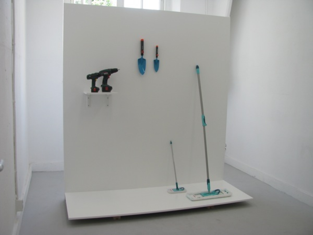 Anke Huntjens heeft iets met ‘horror vacui’, oftwel angst voor het lege, en vulde twee ruimten en ook het trapgat met haar werken. De meest speelse installatie stond vol met sculpturen en werken gemaakt van plastics en andere goedkope materialen. In het midden lag een opgeblazen luchtfiguur van supermarkttassen, onder een boog van verzaagde frituuremmers kon je naar achteren lopen langs kinderpoppen met discoballen als ledematen, doorzichtige wandjes van verknipte petflessen.