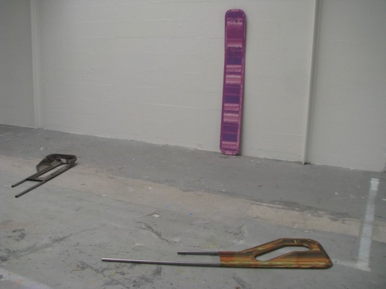 Ivo van den Elzen presenteerde enkele strakke objecten, metalen frames met daaromheen gespannen vinyl met een print. Deze print was met de computer gemaakt, als ook de vorm van het hele object. De digitale schildering van het vlak pastte zich aan de buigingen van het ding aan. Een perfect industriëel voorwerp zonder enige functie dan dat het mooi moet/mag zijn.