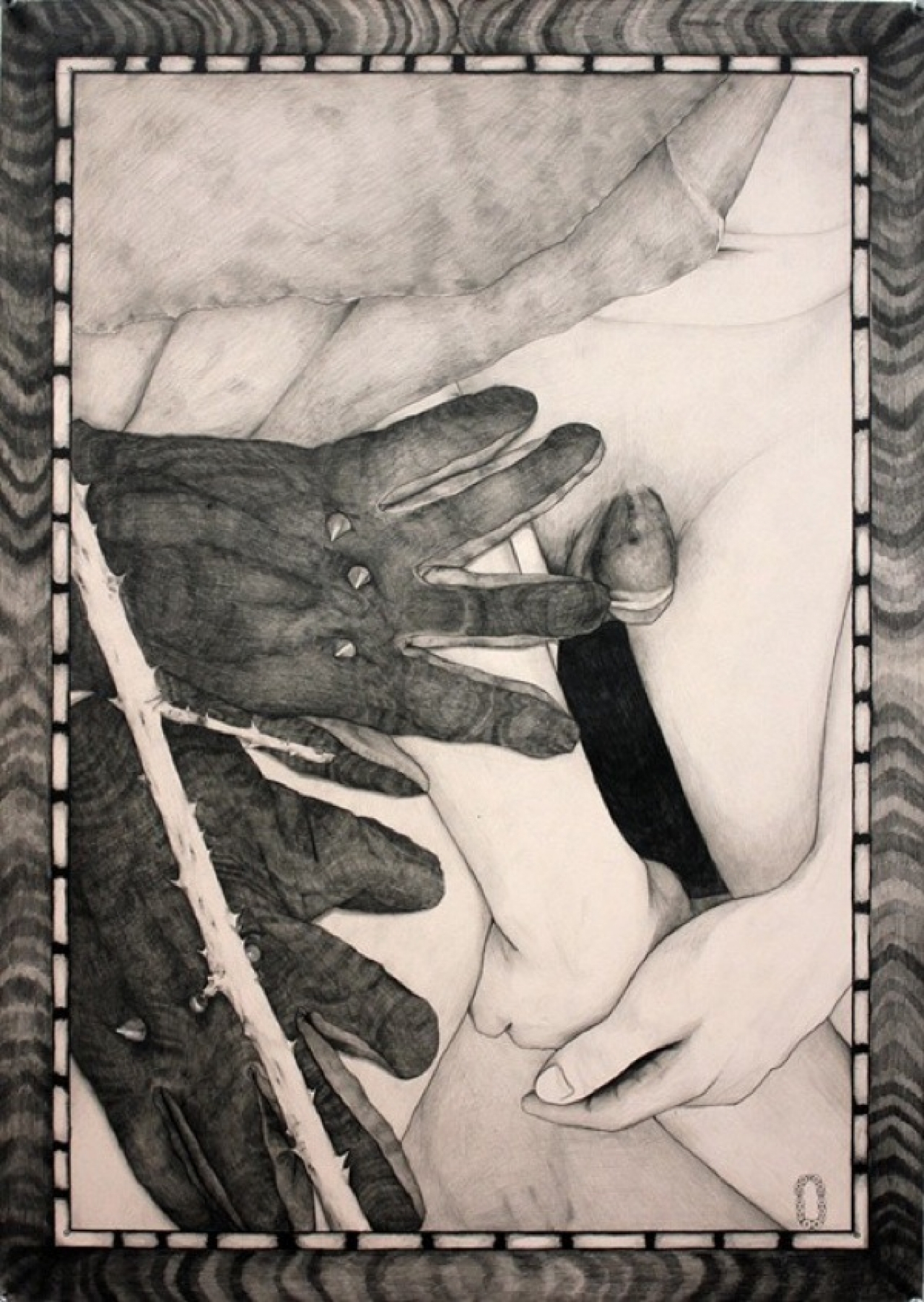 Koes Staassen toont een kleihoop met gaten, een videowerk en vooral indrukwekkende tekeningen die zeer nauwkeurig met potlood op het papier zijn gezet. De prachtig verfijnde tekeningen zonder kleur hebben ong. een A3-formaat en zijn ingelijst. Ze vertonen bijna allemaal het middelste gedeelte van een mannenlichaam met in het centrum een piemel en handen. Op het lichaam zijn vaak attributen afgebeeld zoals donkere handschoenen met studs. Toch gaat er niets pornografisch van deze beelden uit, integendeel. Het zijn eigenlijk onschuldige tekeningen zonder enige seksuele handelingen en/of opwinding. Ook de video waarbij zeer close-up de constant bewegende huid van de ballen wordt getoond heeft niets seksueels, het geeft eerder een fascinerend beeld van de diverse kleuren en facetten van de huid. In een begeleidende tekst verklaart Koes dat zijn werk geleid wordt door een combinatie van verlangen en schaamte; een interessant thema die prachtige werken oplevert.