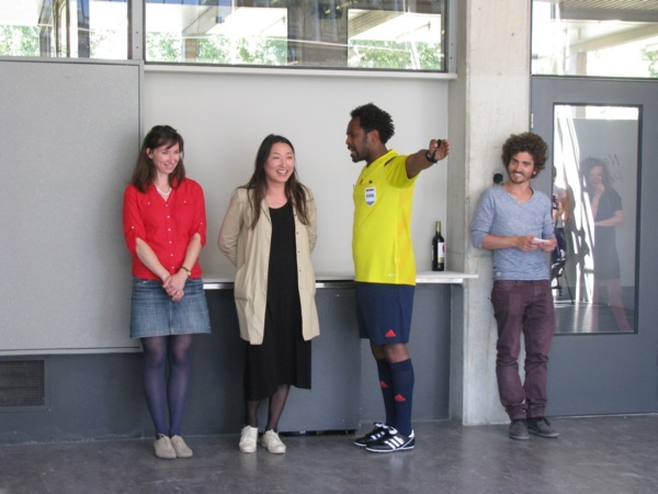 Sunghoon Kim (Fine Arts) performance met twee scheidsrechters die met fluiten, schreeuwen en gebaren opdrachten geven aan de toeschouwers