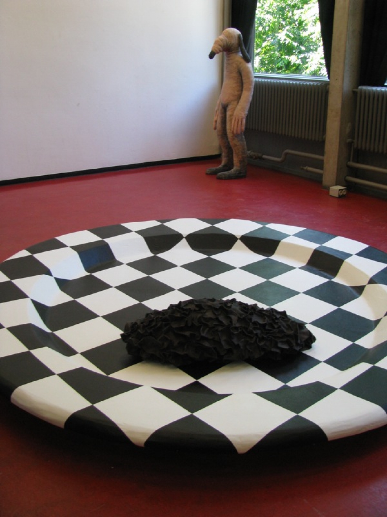 Tim Maarse (Fine Arts) absurde video (op deze foto niet te zien) en sculpturen in vorm hond-mens en groot bord met soort zwam erop