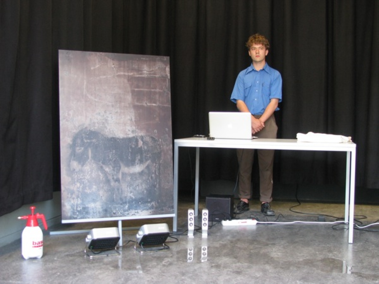 Martin Pedersen (Fine Arts) performance met oude calypsomuziek en tekst en door verwarming van houten plaat met thermo-verf, de verschijning van de beeldtenis van een ezel