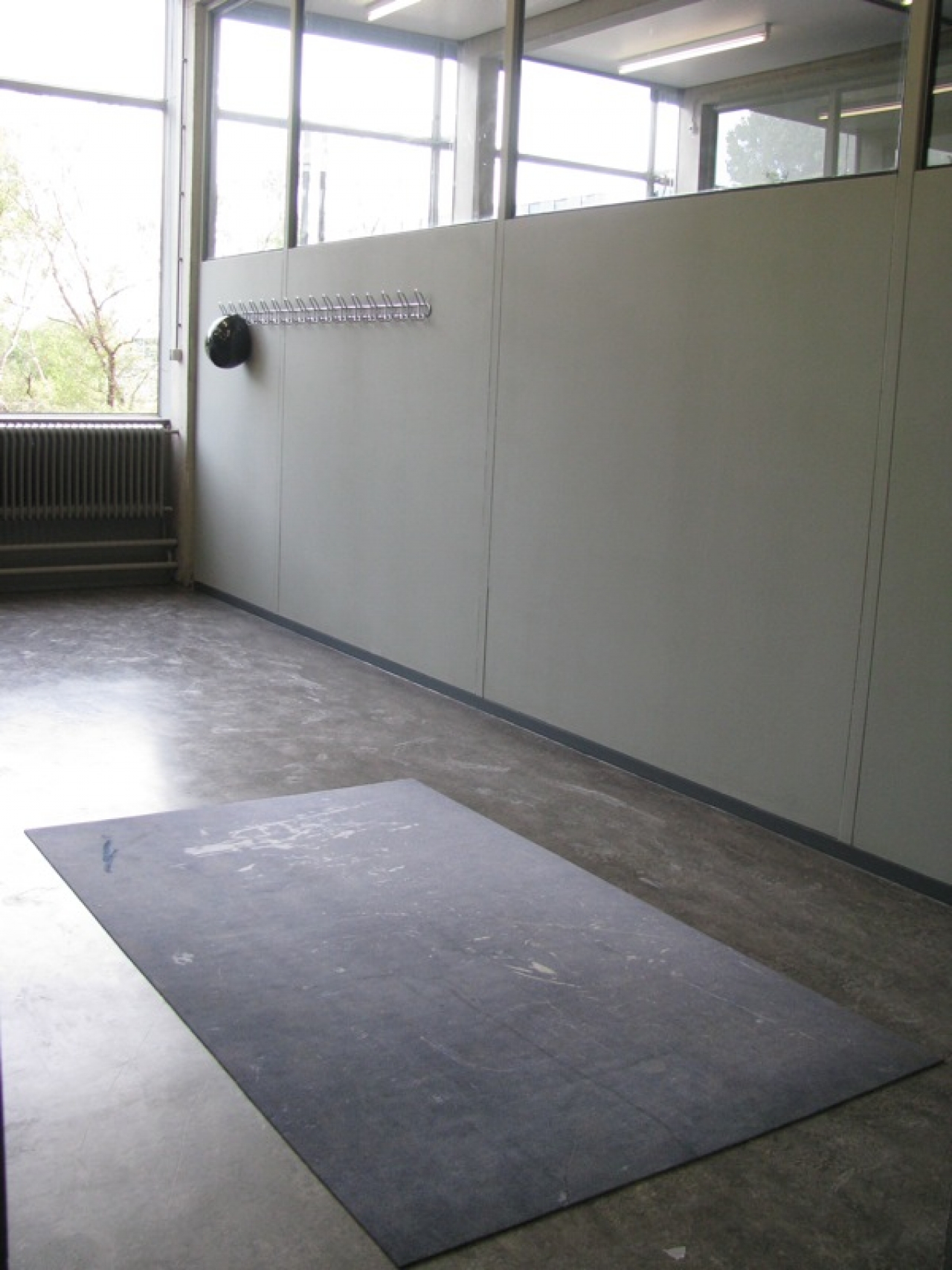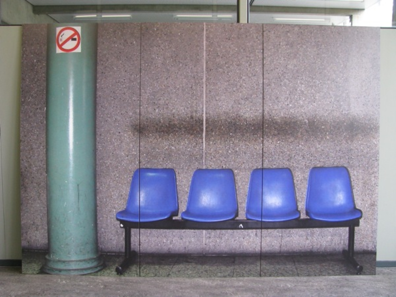 Pernille Kier & Kristoffer Petersen (Fine Arts) wachtkamer-installatie met foto (met stoeltjes), tapijt met ingeweven vlekken, kapstok met keramieken helm